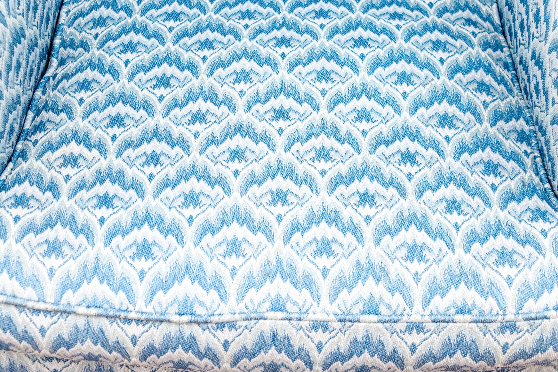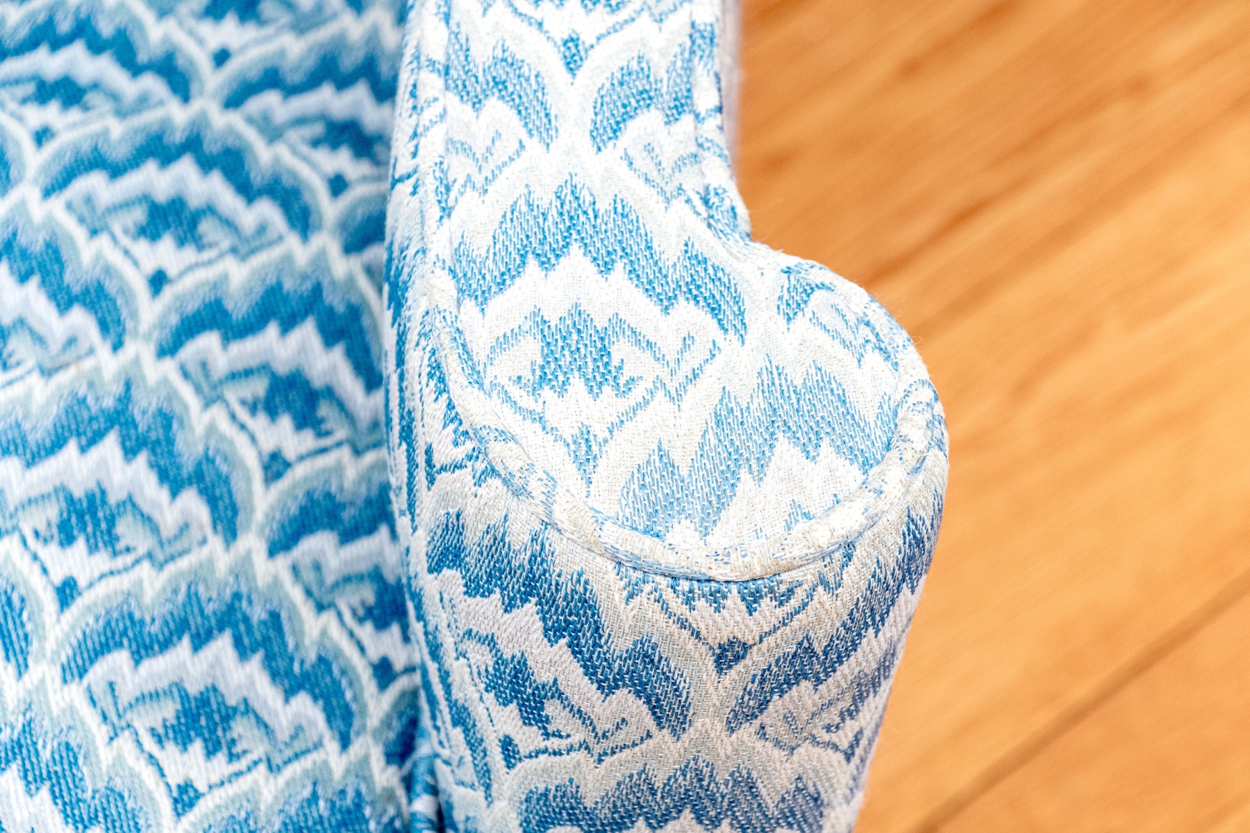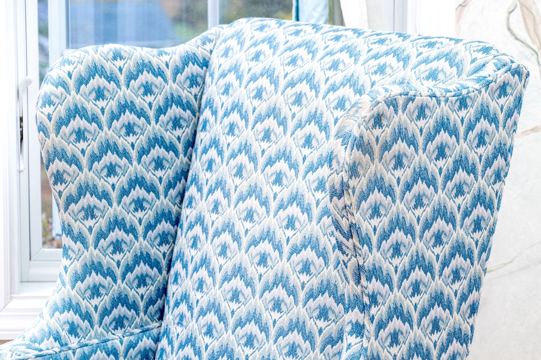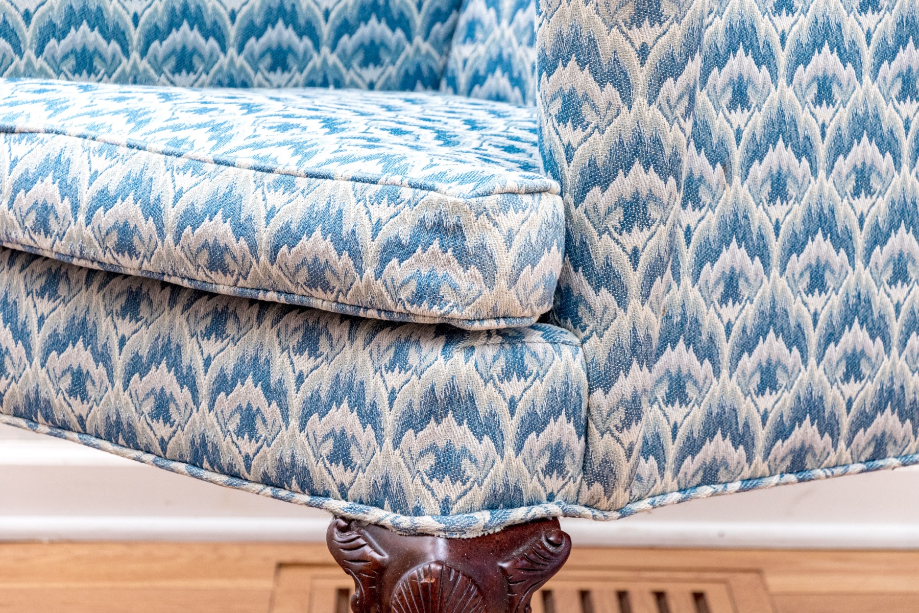 A delightful Hickory Chair wing chair raised on front carved cabriole legs with pad form feet and back splayed legs. The upholstery a lavish foliate repeating form with blues and cool hues. Rolled arms shaped wings and a loose upholstered seat cushion with piped trim.