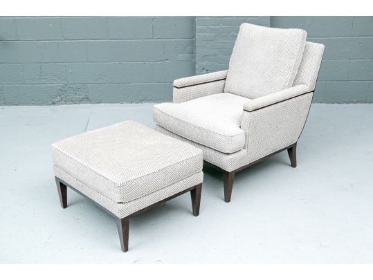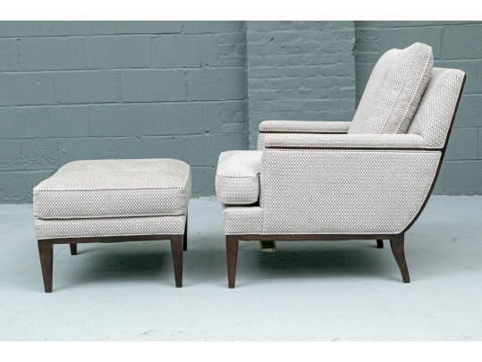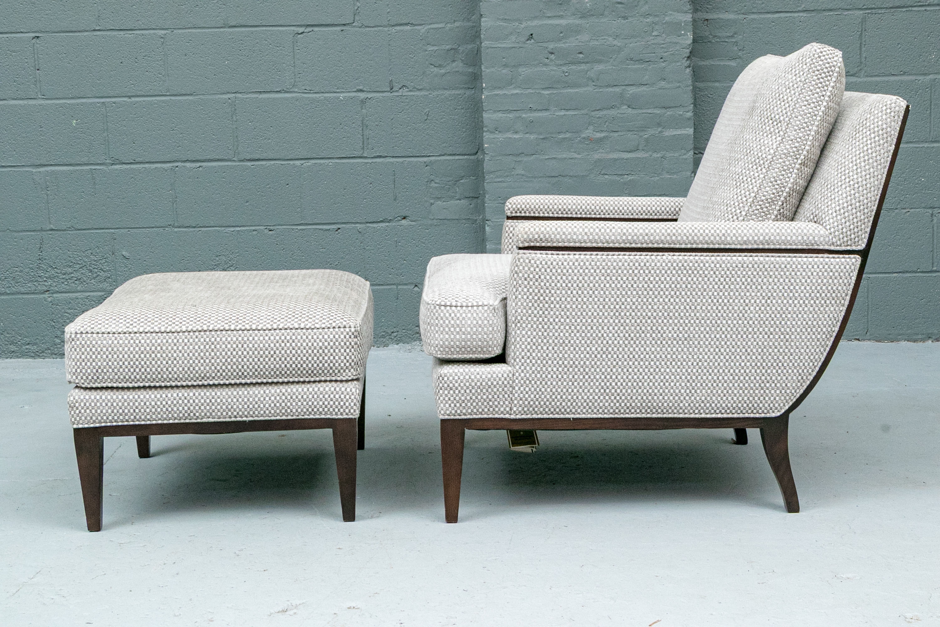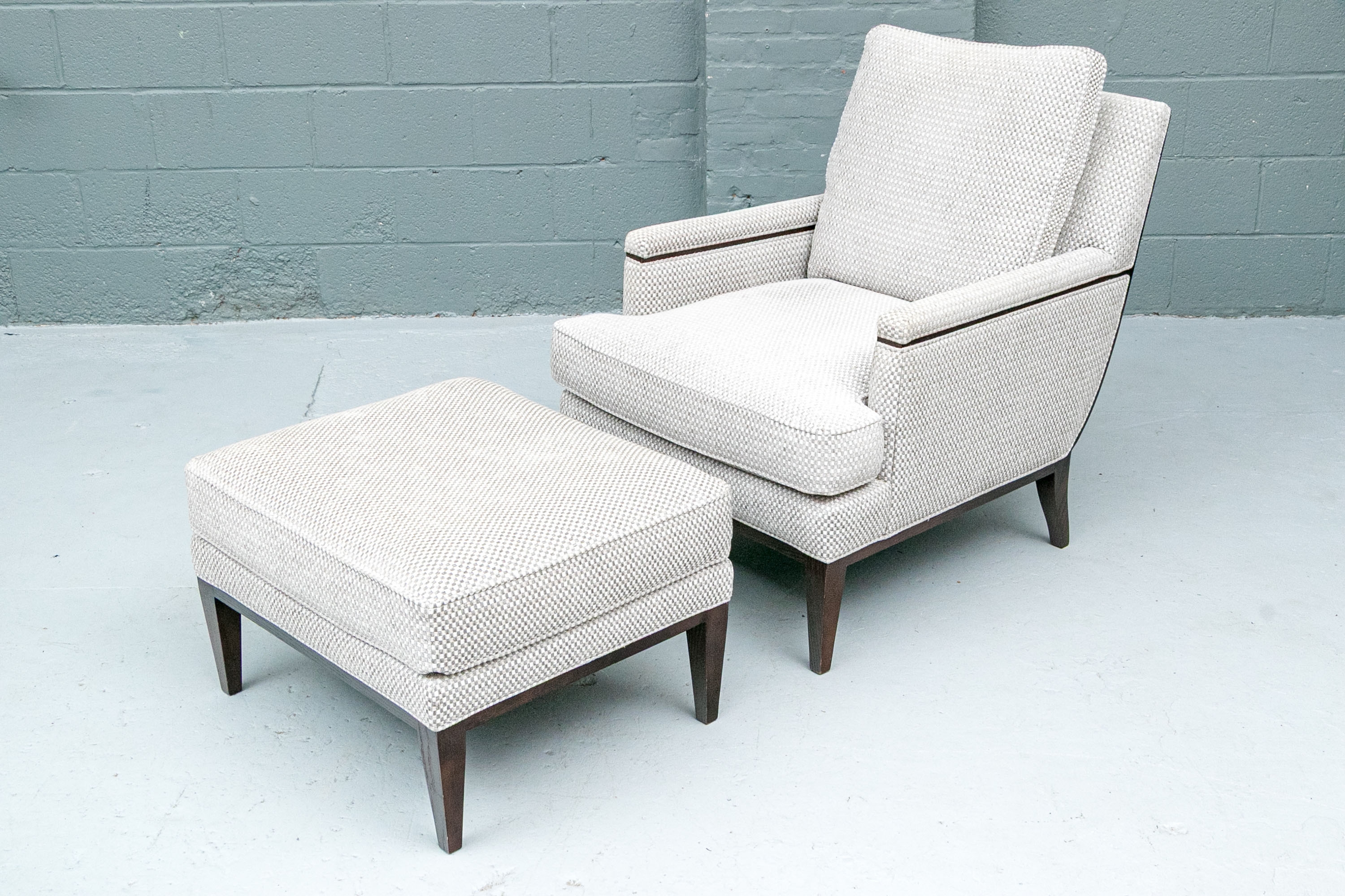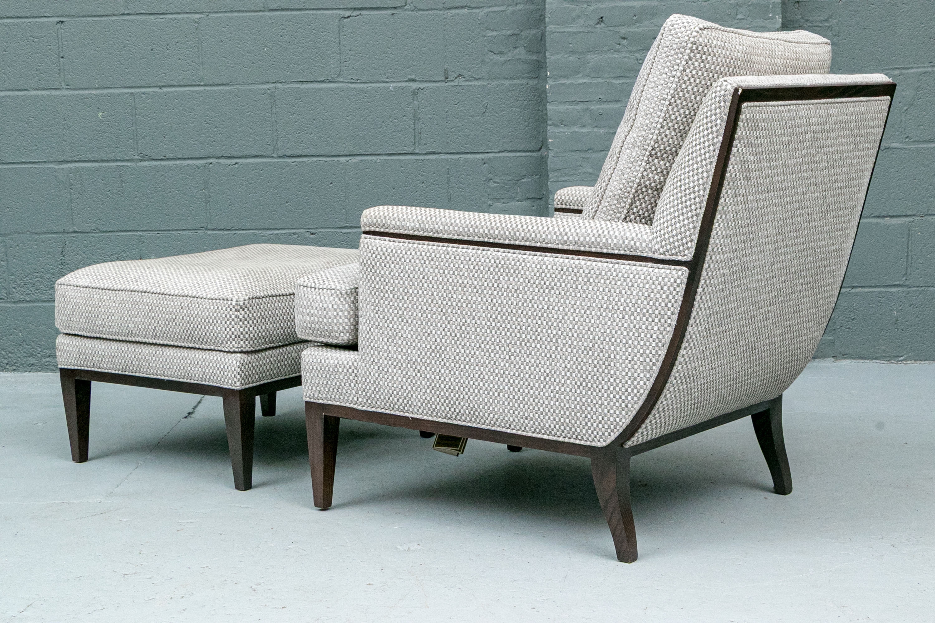 A lounge chair made by Hickory Chair for Lillian August with accompanying ottoman. The chair covered in a basket-weave form textured fabric in dark grey, light grey and beige.
