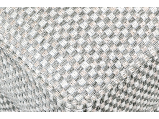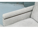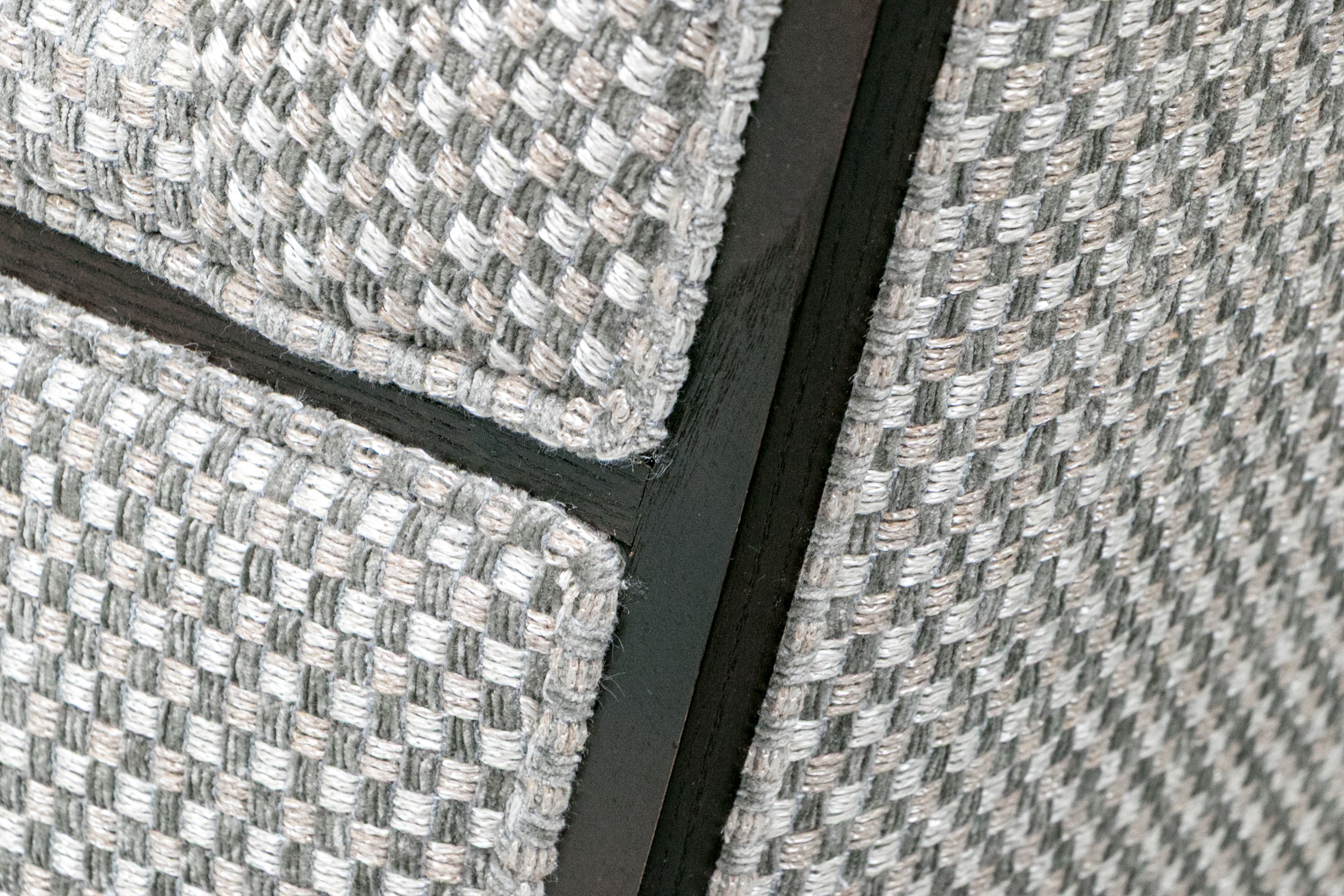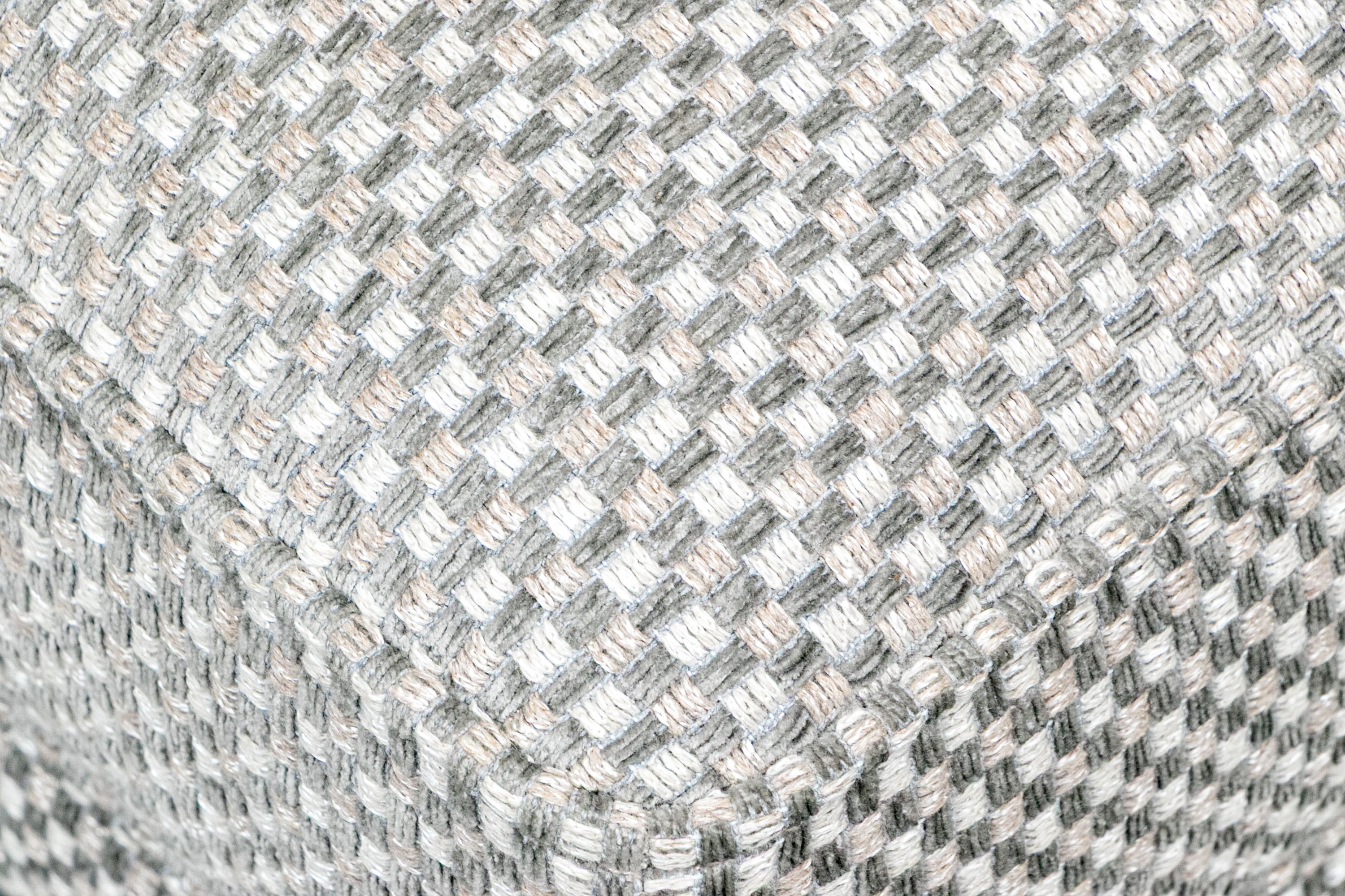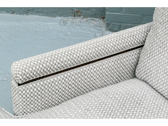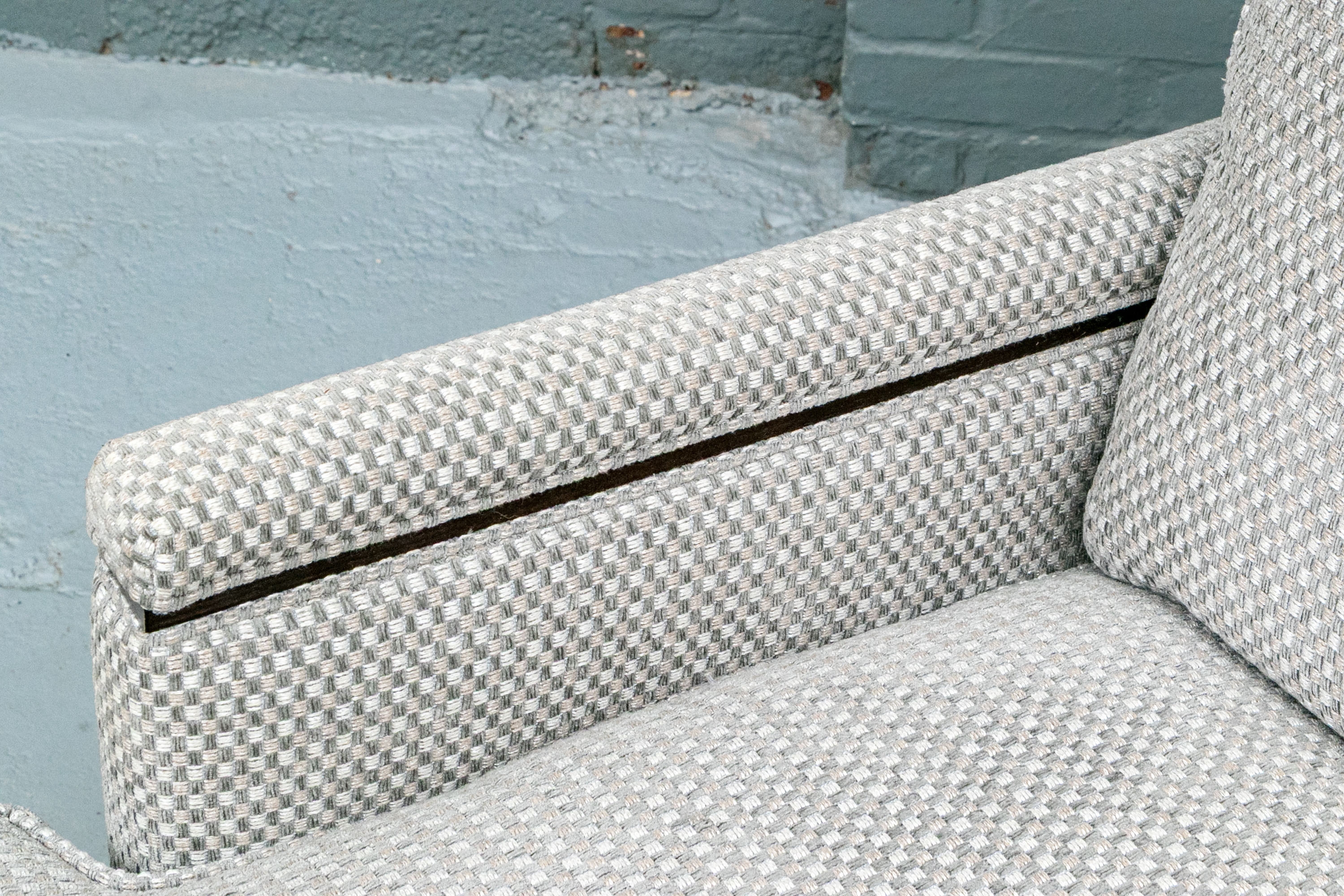 A lounge chair made by Hickory Chair for Lillian August with accompanying ottoman. The chair covered in a basket-weave form textured fabric in dark grey, light grey and beige.