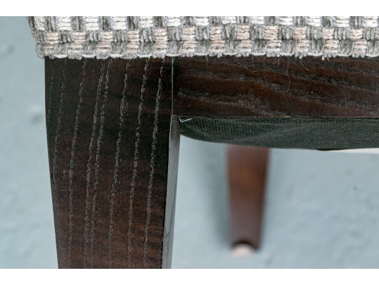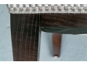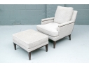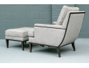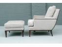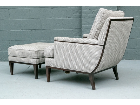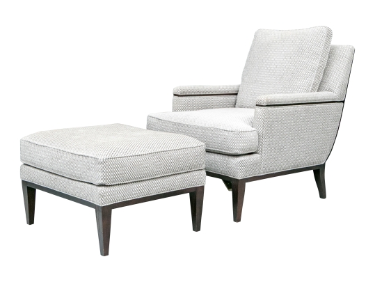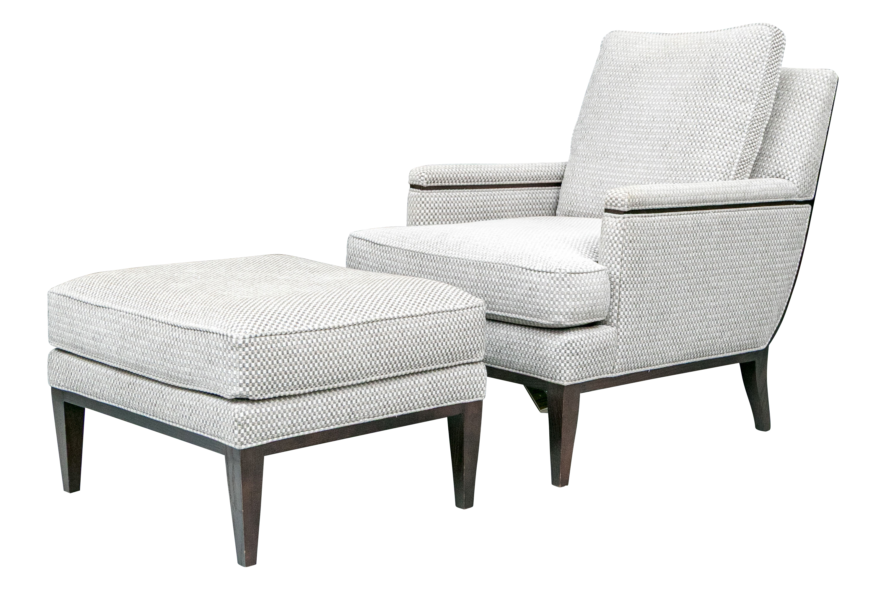 The lounge chair with square armrests with wood trim, square backrest, wood trim around the perimeter and all resting upon four espresso brown tapering legs. The ottoman all upholstered and resting on conforming legs.