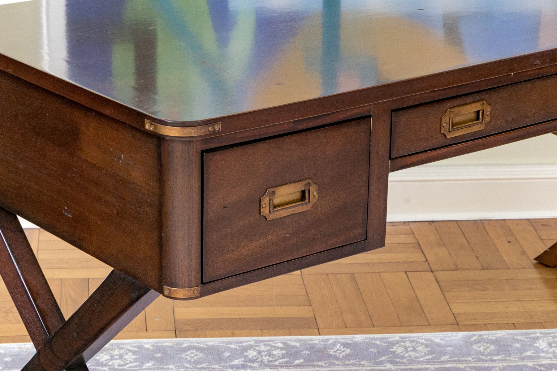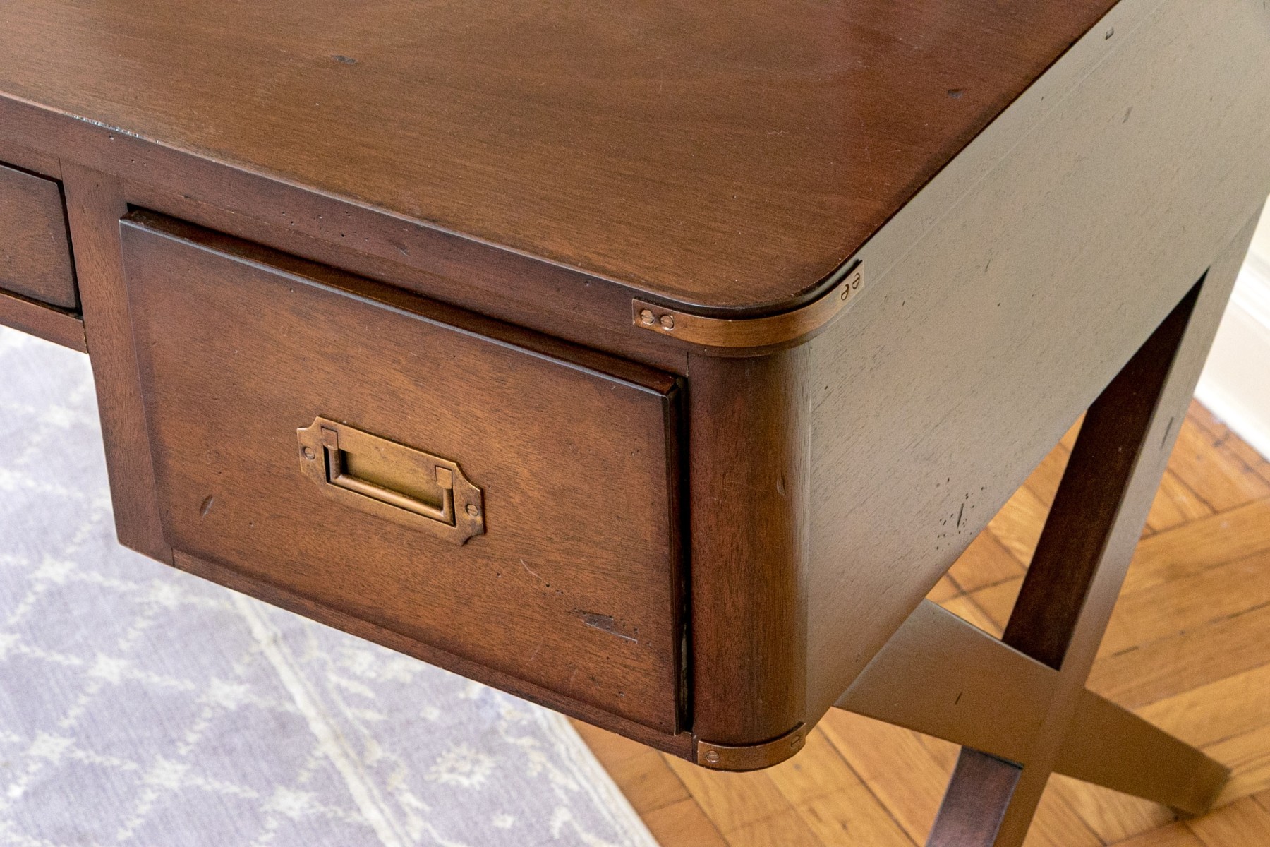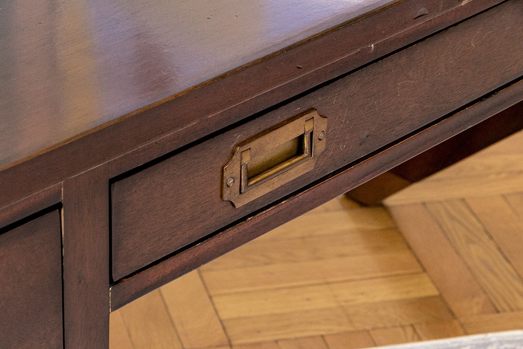 Supported on two X form ends with four legs. The desk has a long central drawer with two brass pulls with two deeper short drawers on either end. The table top has a rectangular top with rounded corner. Labeled inside the upper left drawer.