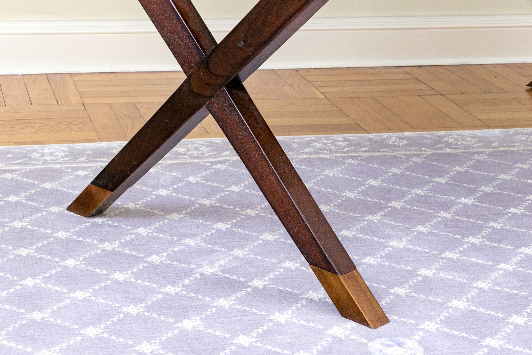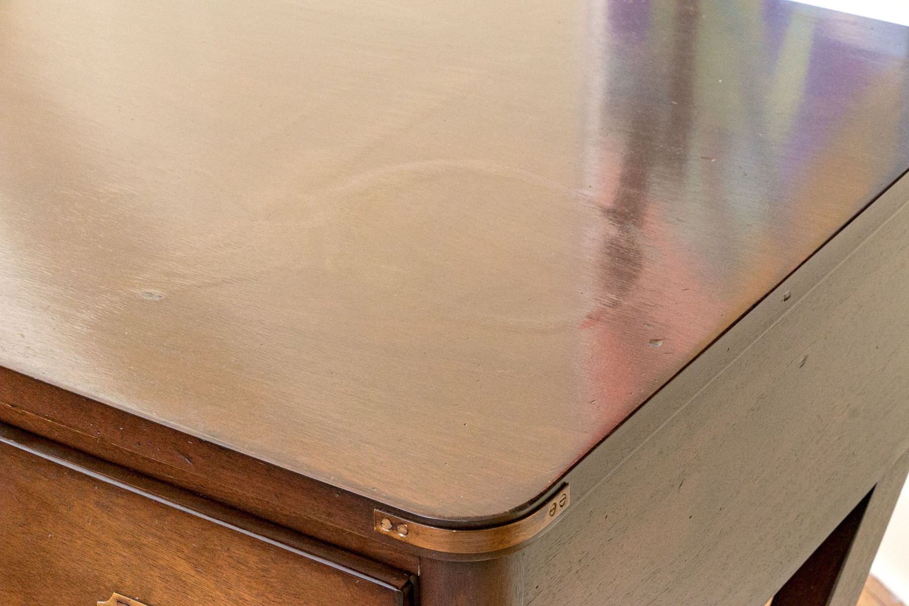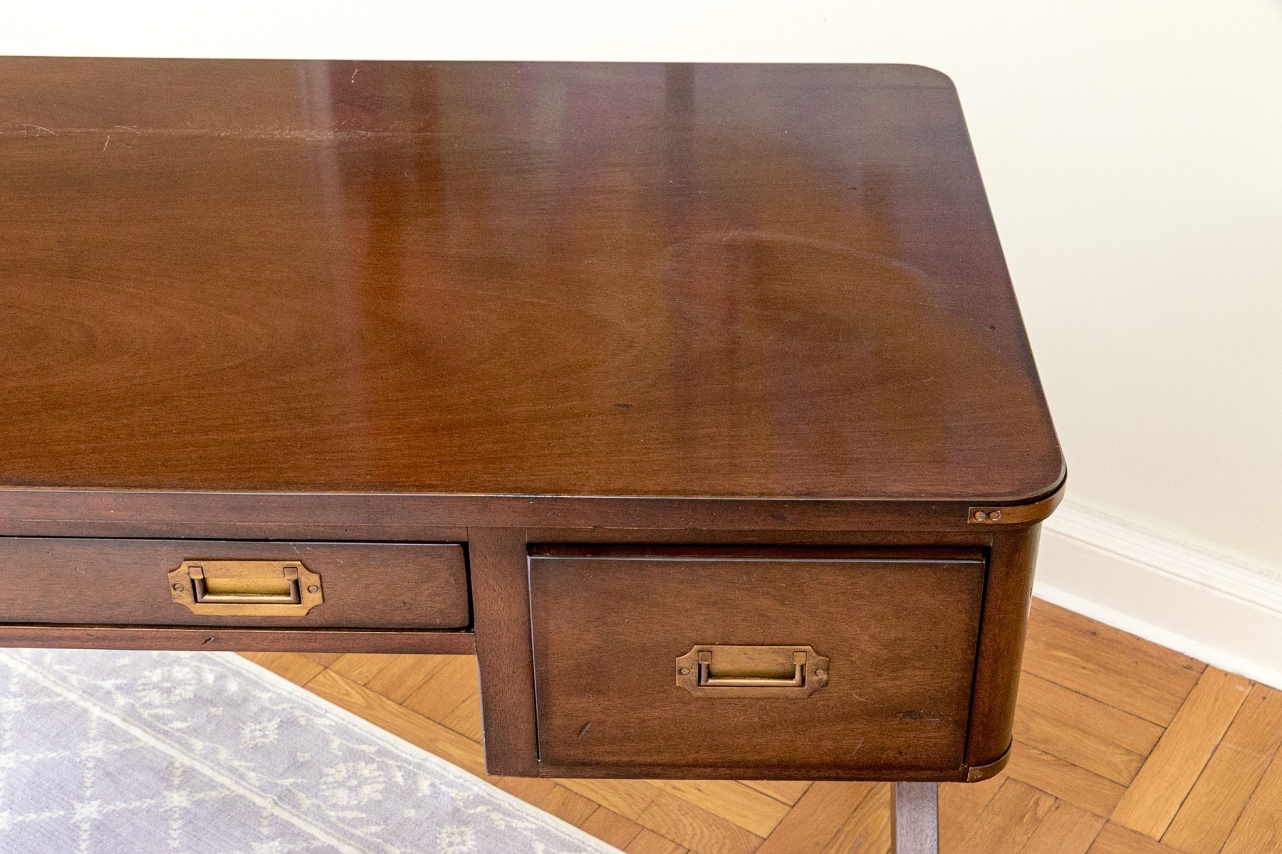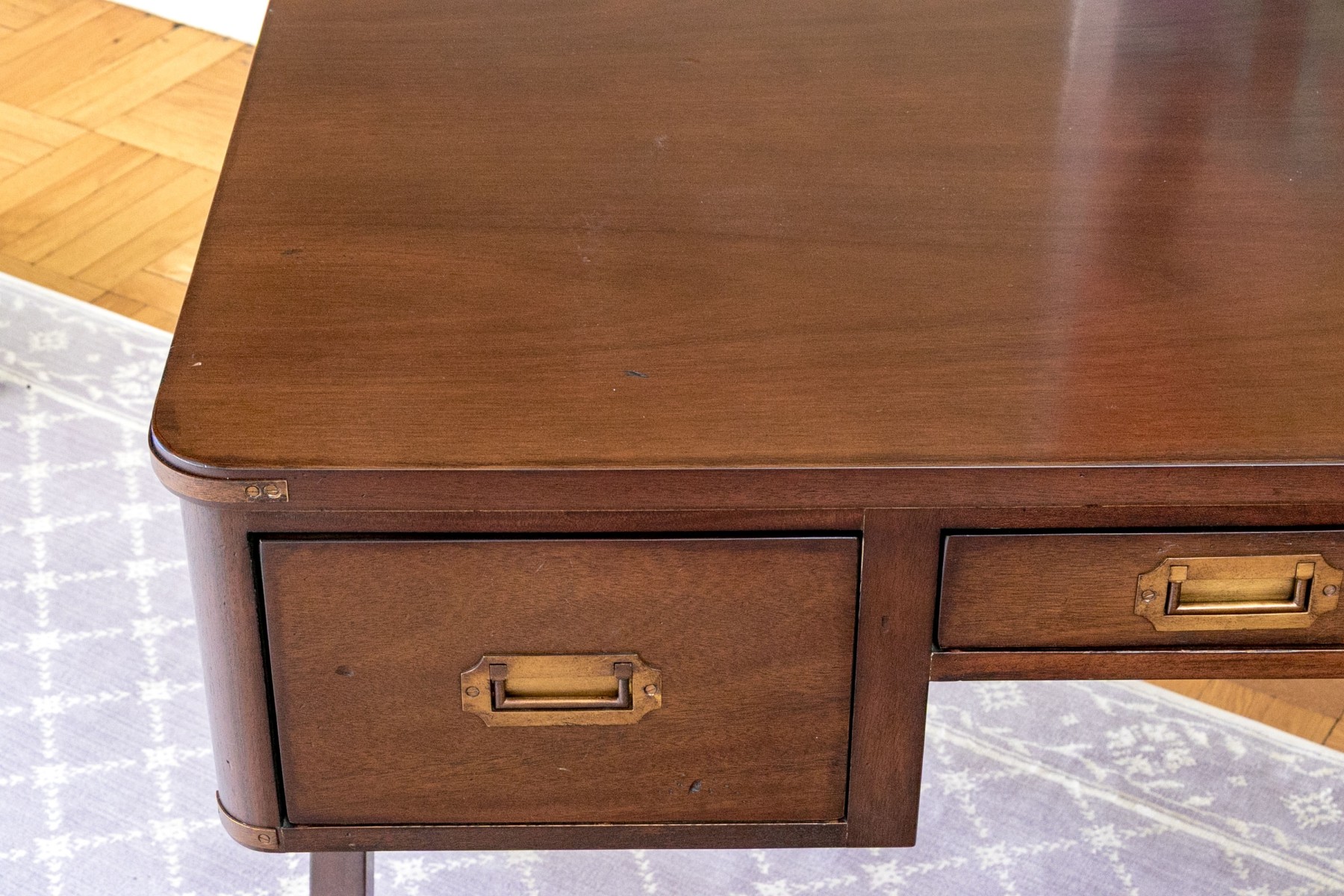 Supported on two X form ends with four legs. The desk has a long central drawer with two brass pulls with two deeper short drawers on either end. The table top has a rectangular top with rounded corner. Labeled inside the upper left drawer.