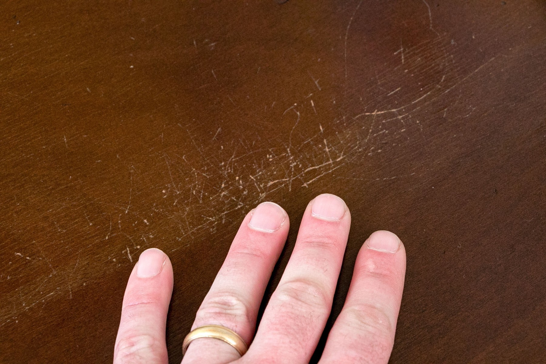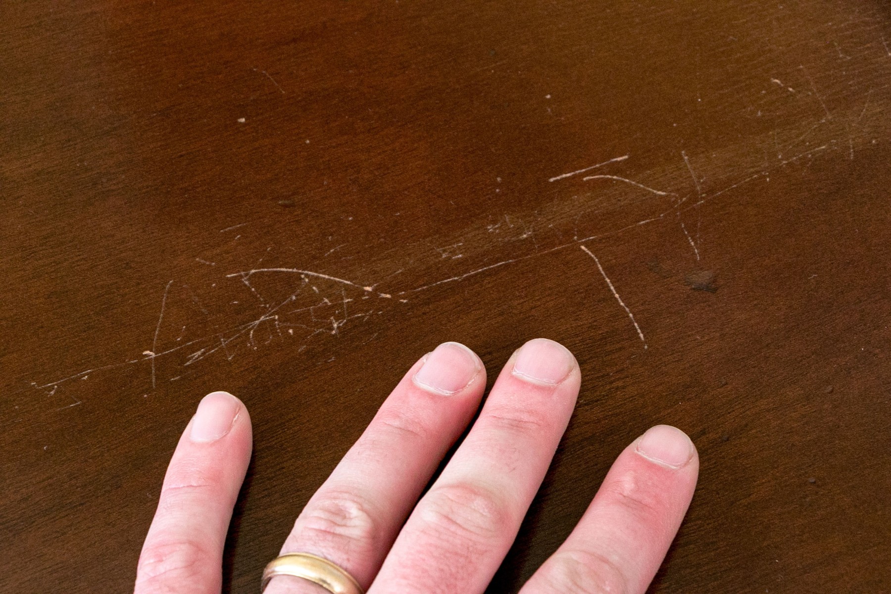 Bubbling and water stain marks to the table top with other slight wear commensurate with age and use.