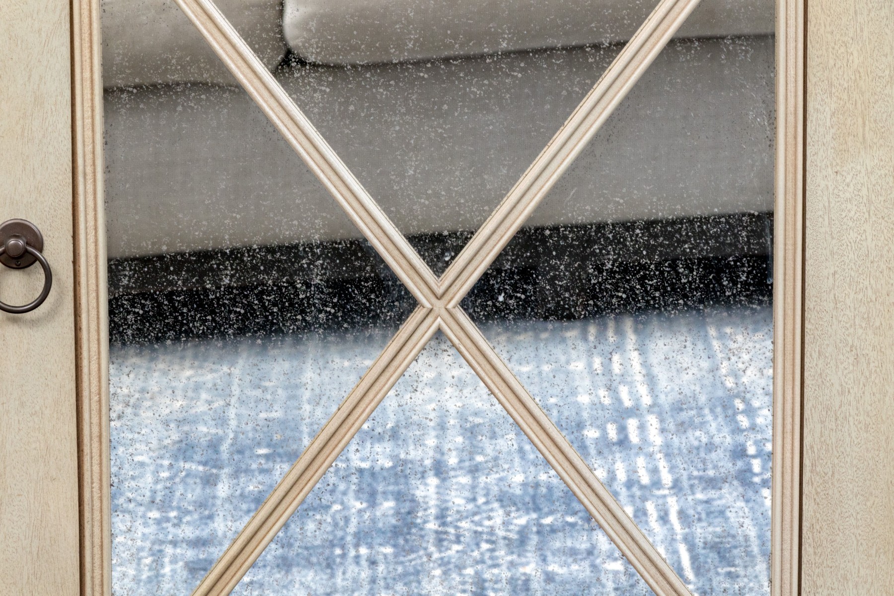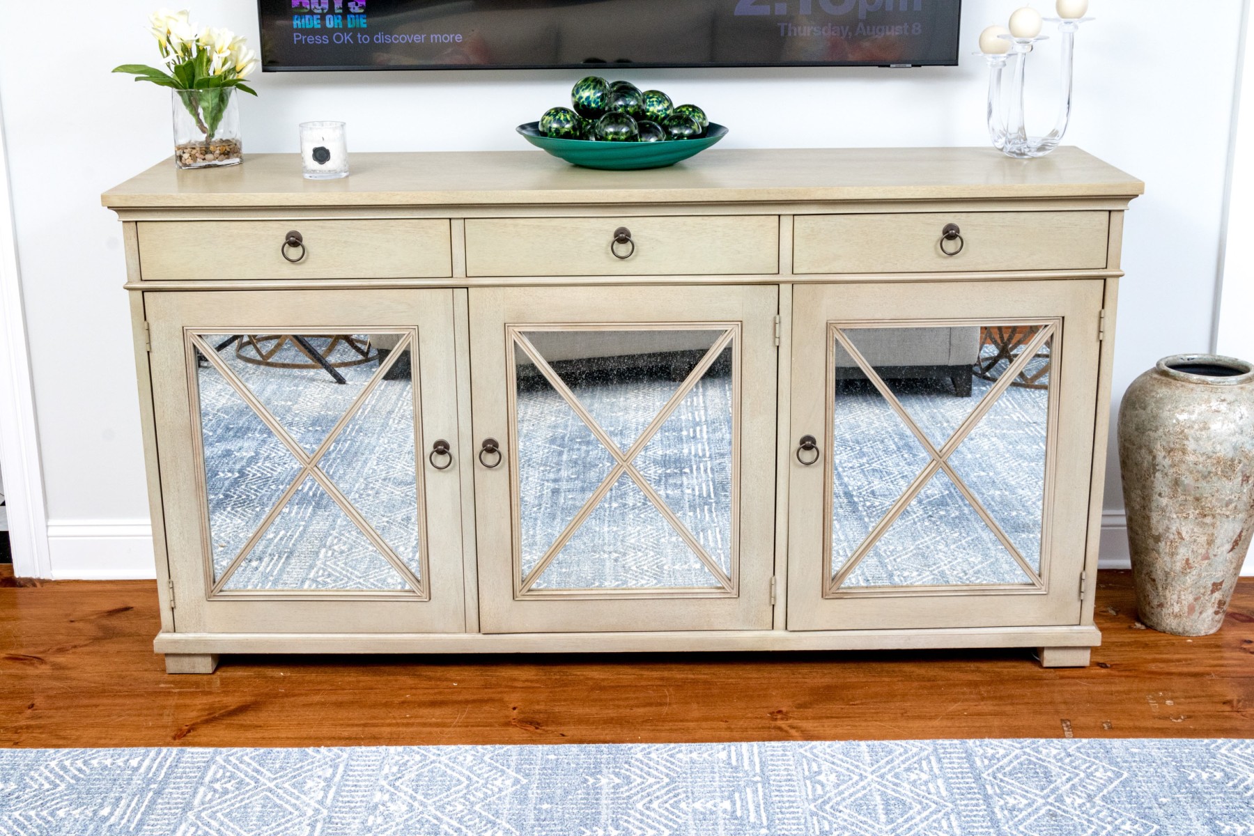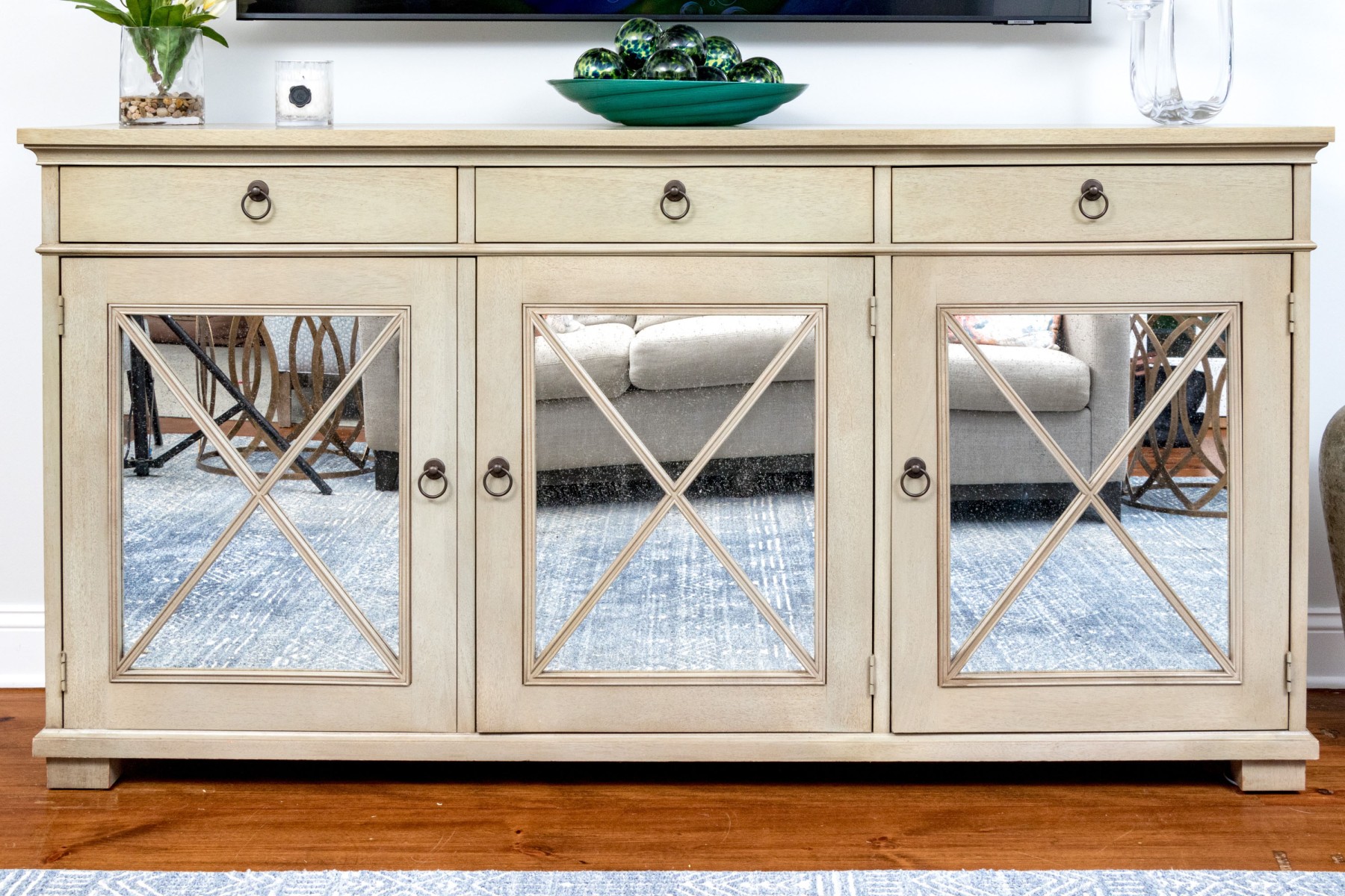 Hickory Chair Suzanne Kasler Collection "Deauville" sideboard with elegant French country charm, featuring clean and elegant lines along a rectangular profile painted in rustic cream. Showcases three drawers with bronzed loop handles over three cabinet doors with mirror paneling around X lattices, opening to shelved interiors. Raised on simple rectangular block feet.