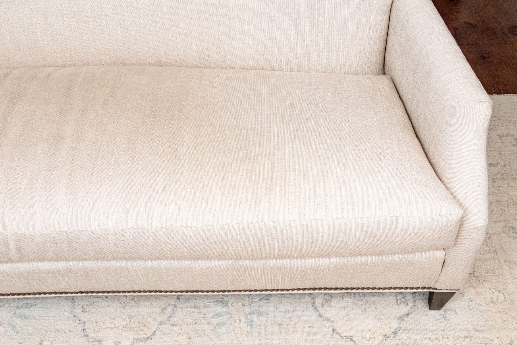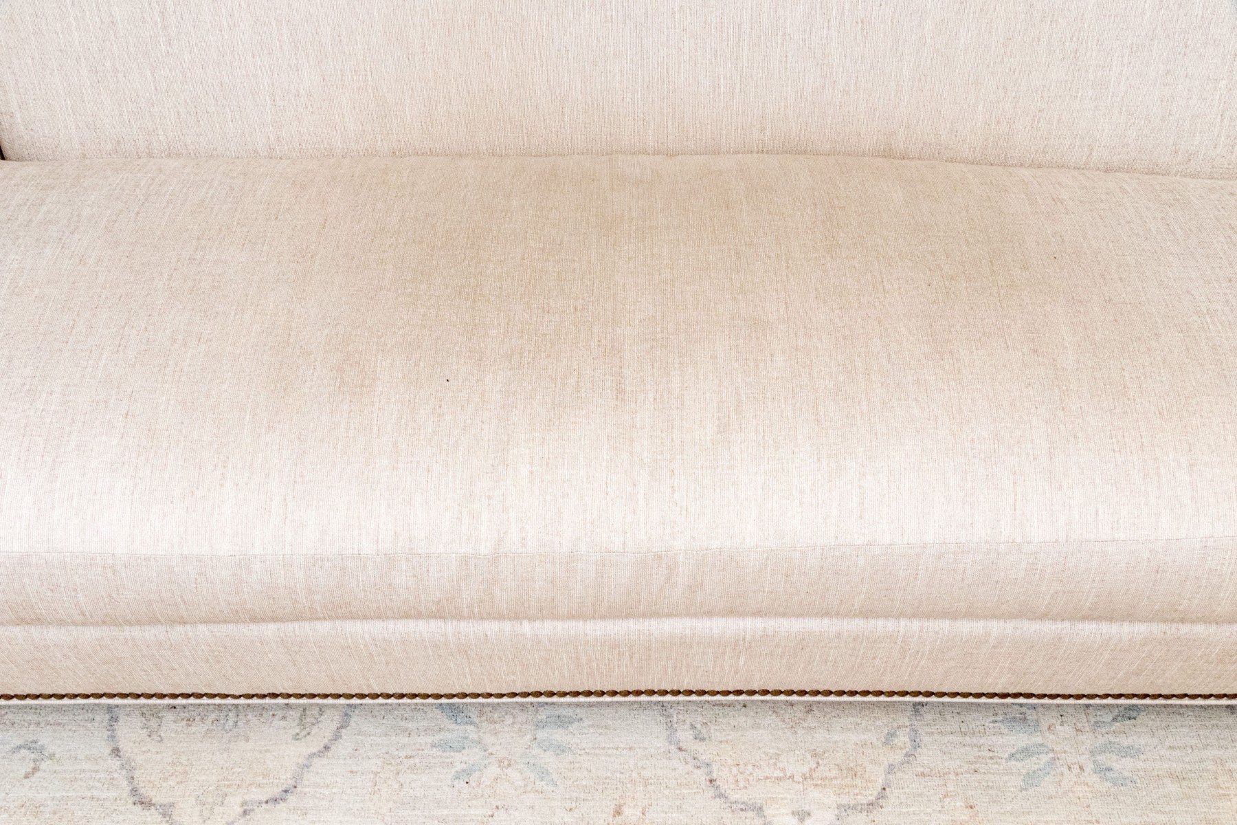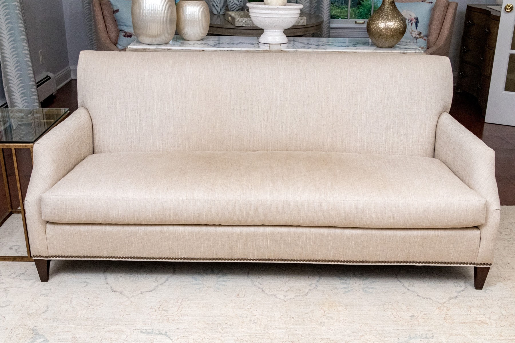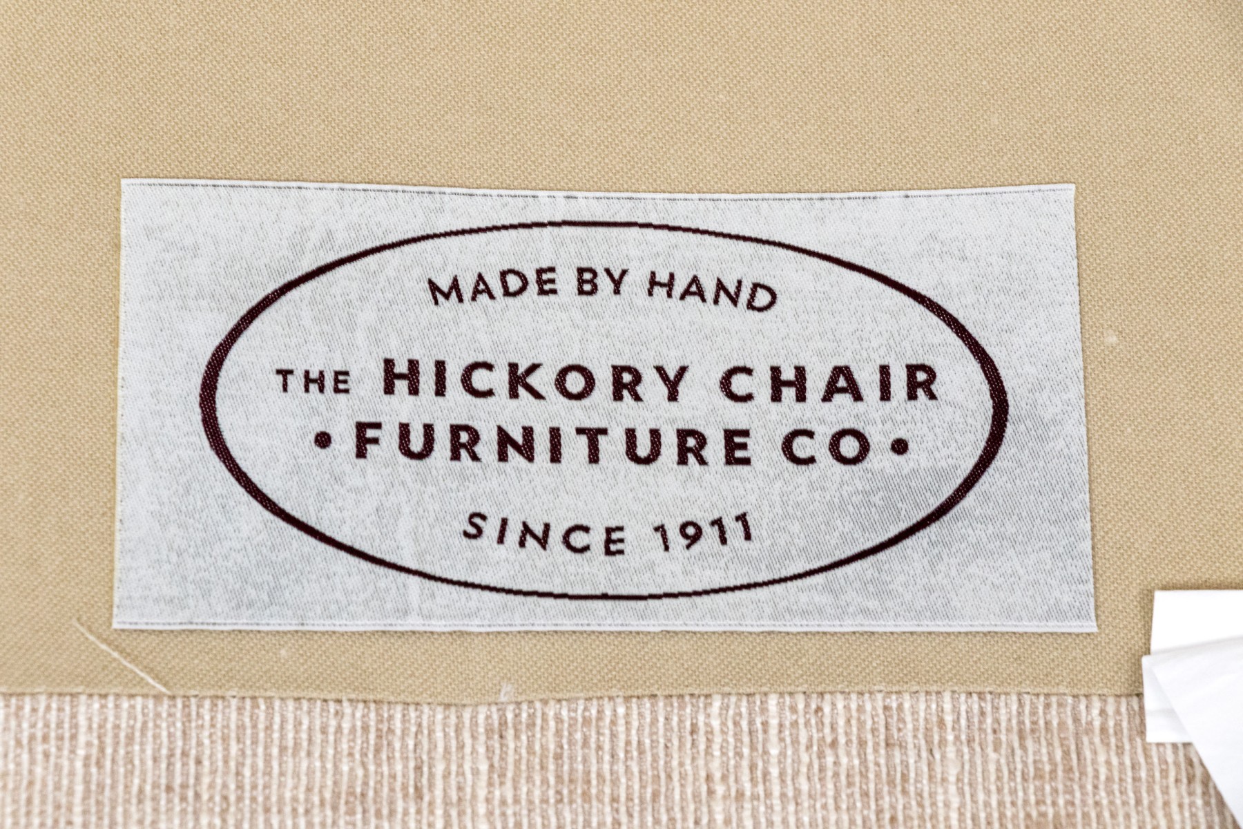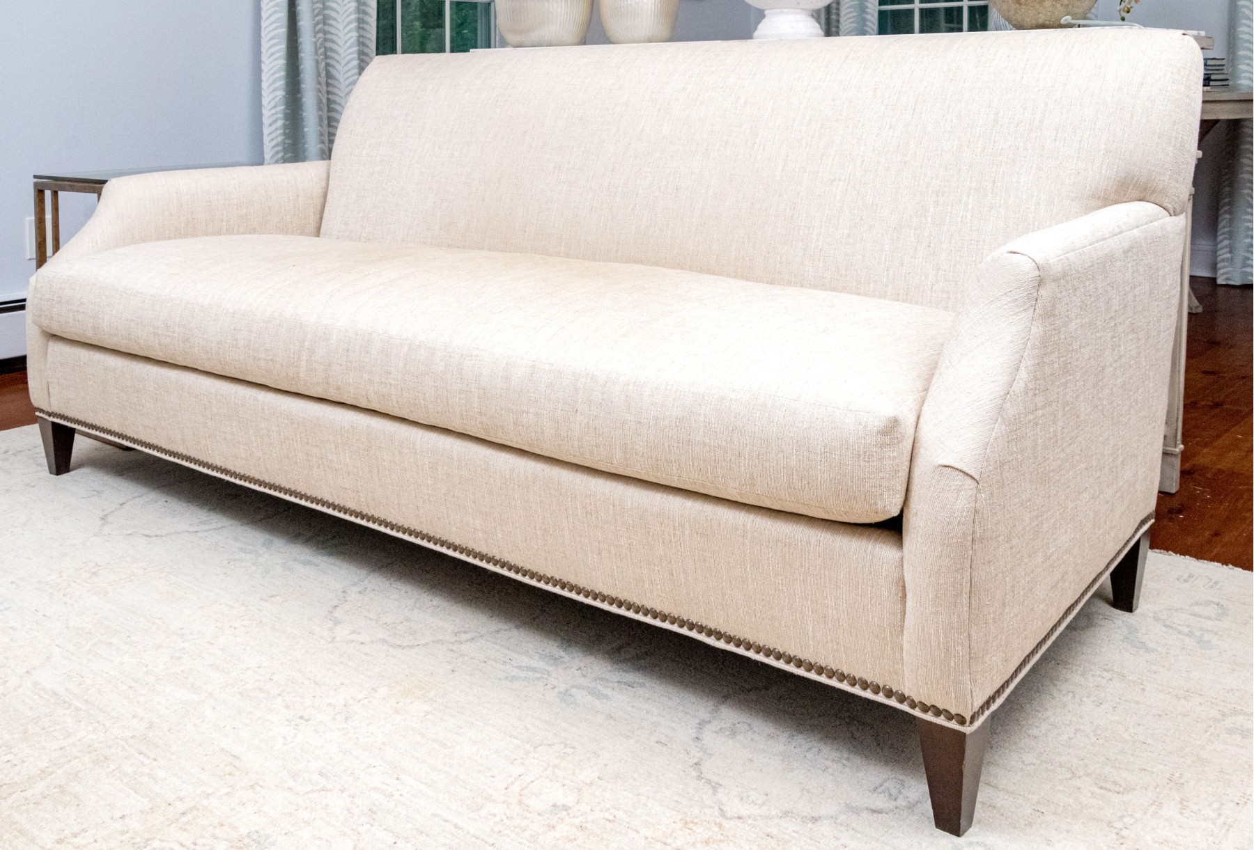 A handsome Hickory Chair sofa featuring a clean and simple profile with a solid back and single long loose cushion. Narrow, gently rounded arms elegantly curve along the supports, leading to a straight apron lined with a nailhead trim over tapered dark brown legs. Upholstered in versatile neutral cream corded fabric for a touch of texture.