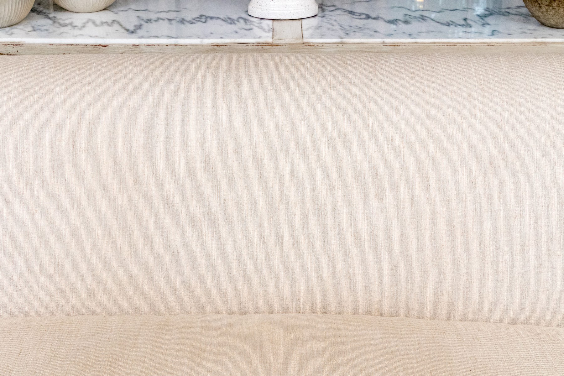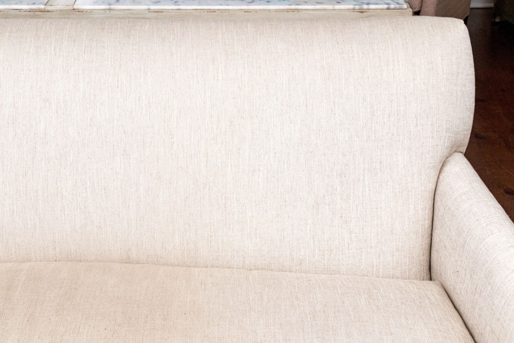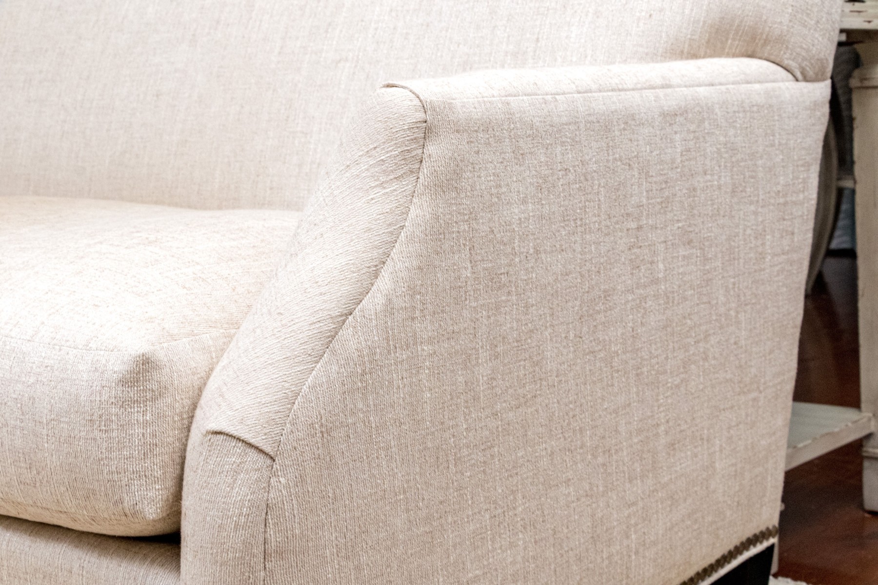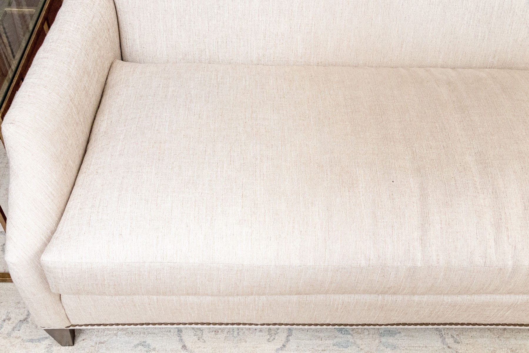 A handsome Hickory Chair sofa featuring a clean and simple profile with a solid back and single long loose cushion. Narrow, gently rounded arms elegantly curve along the supports, leading to a straight apron lined with a nailhead trim over tapered dark brown legs. Upholstered in versatile neutral cream corded fabric for a touch of texture.
