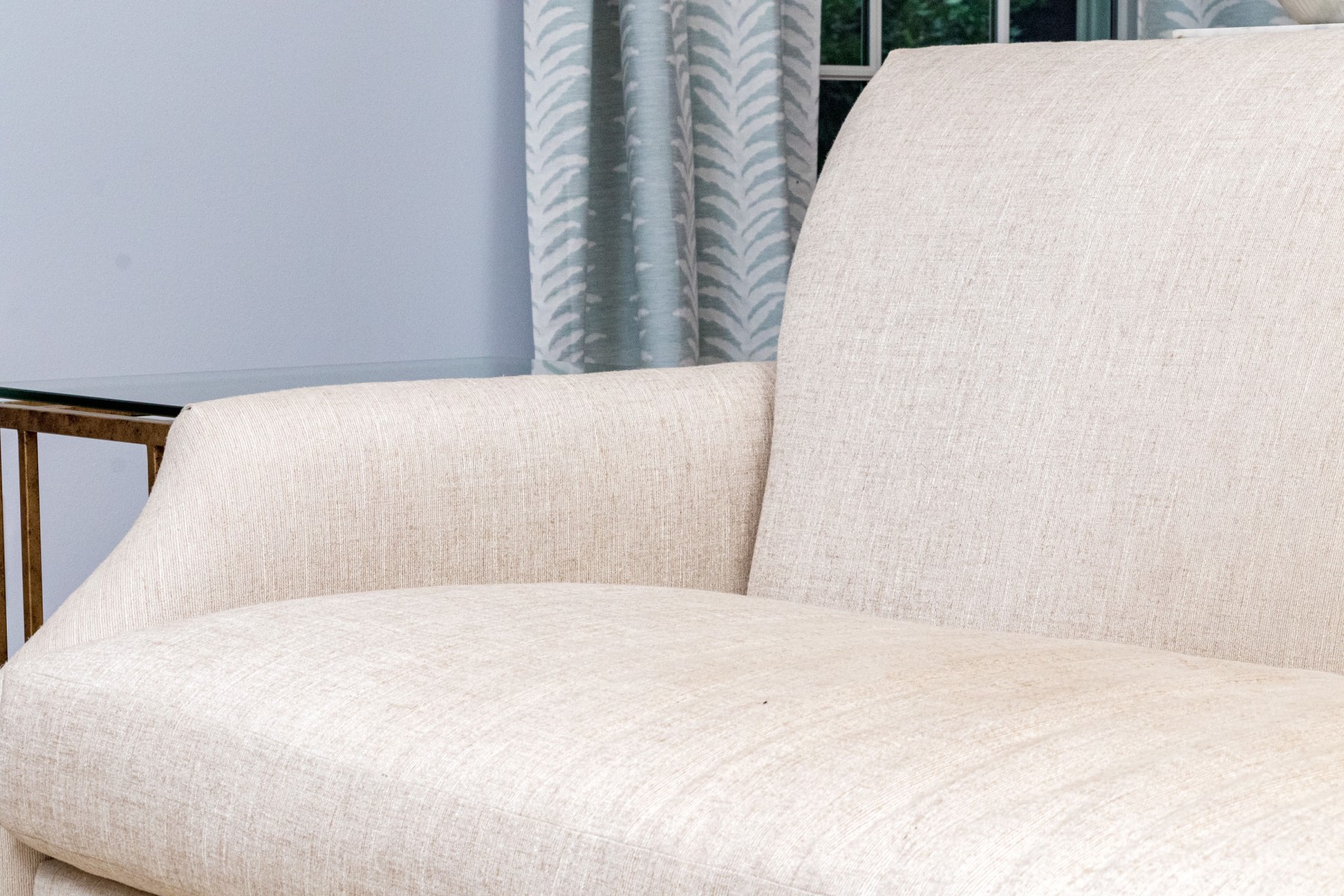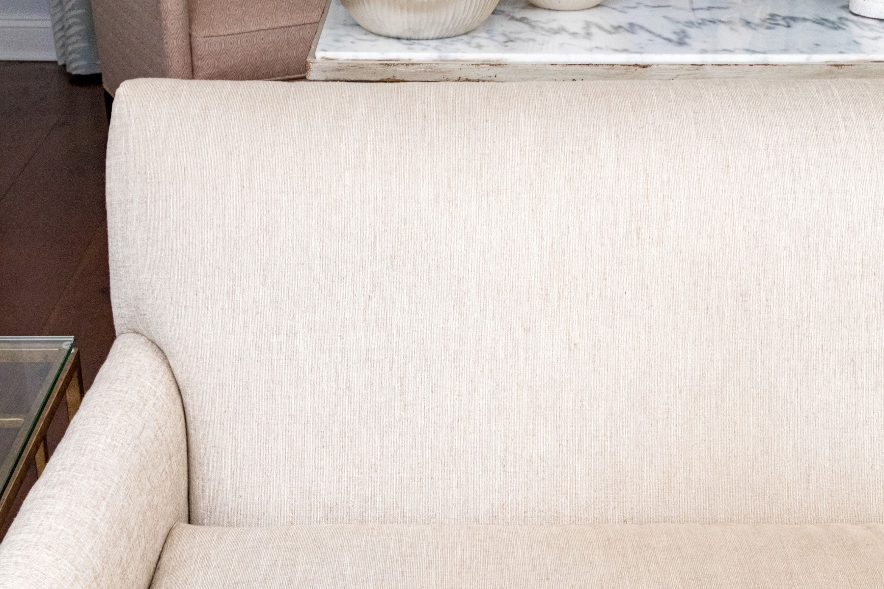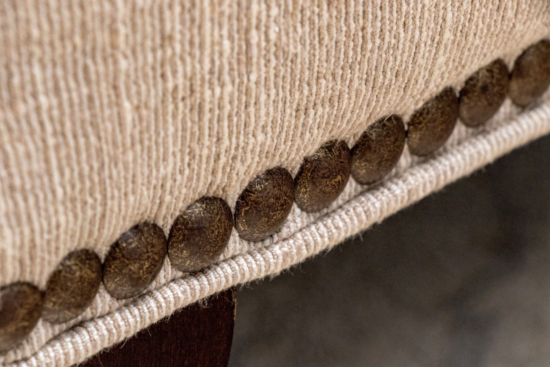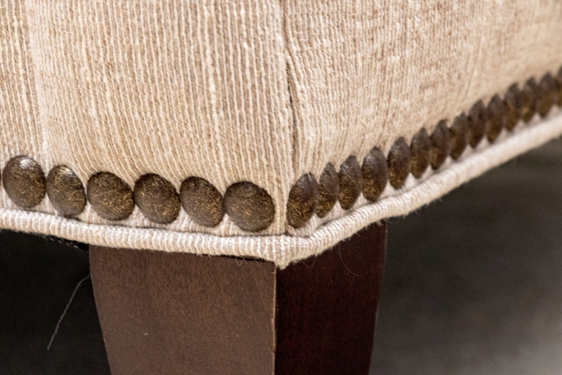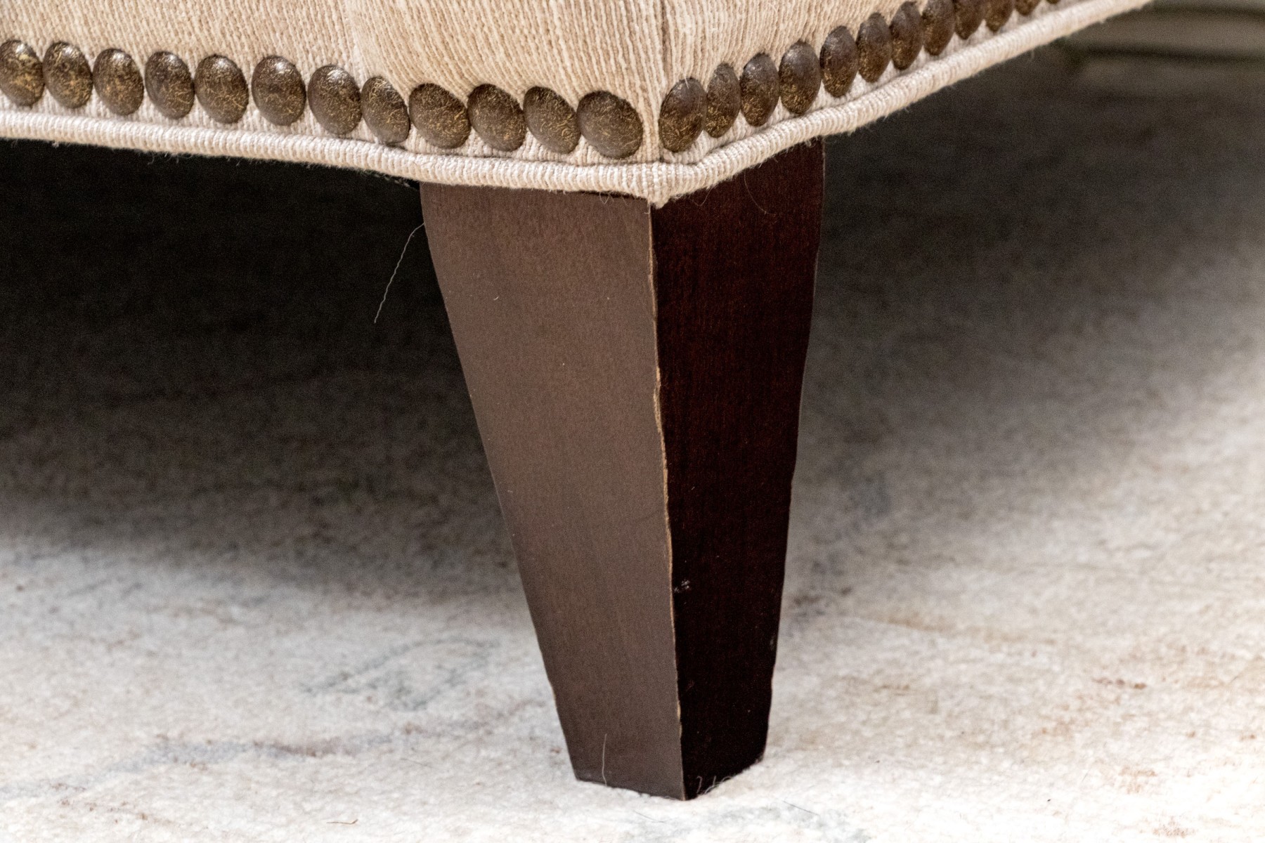 A handsome Hickory Chair sofa featuring a clean and simple profile with a solid back and single long loose cushion. Narrow, gently rounded arms elegantly curve along the supports, leading to a straight apron lined with a nailhead trim over tapered dark brown legs. Upholstered in versatile neutral cream corded fabric for a touch of texture.