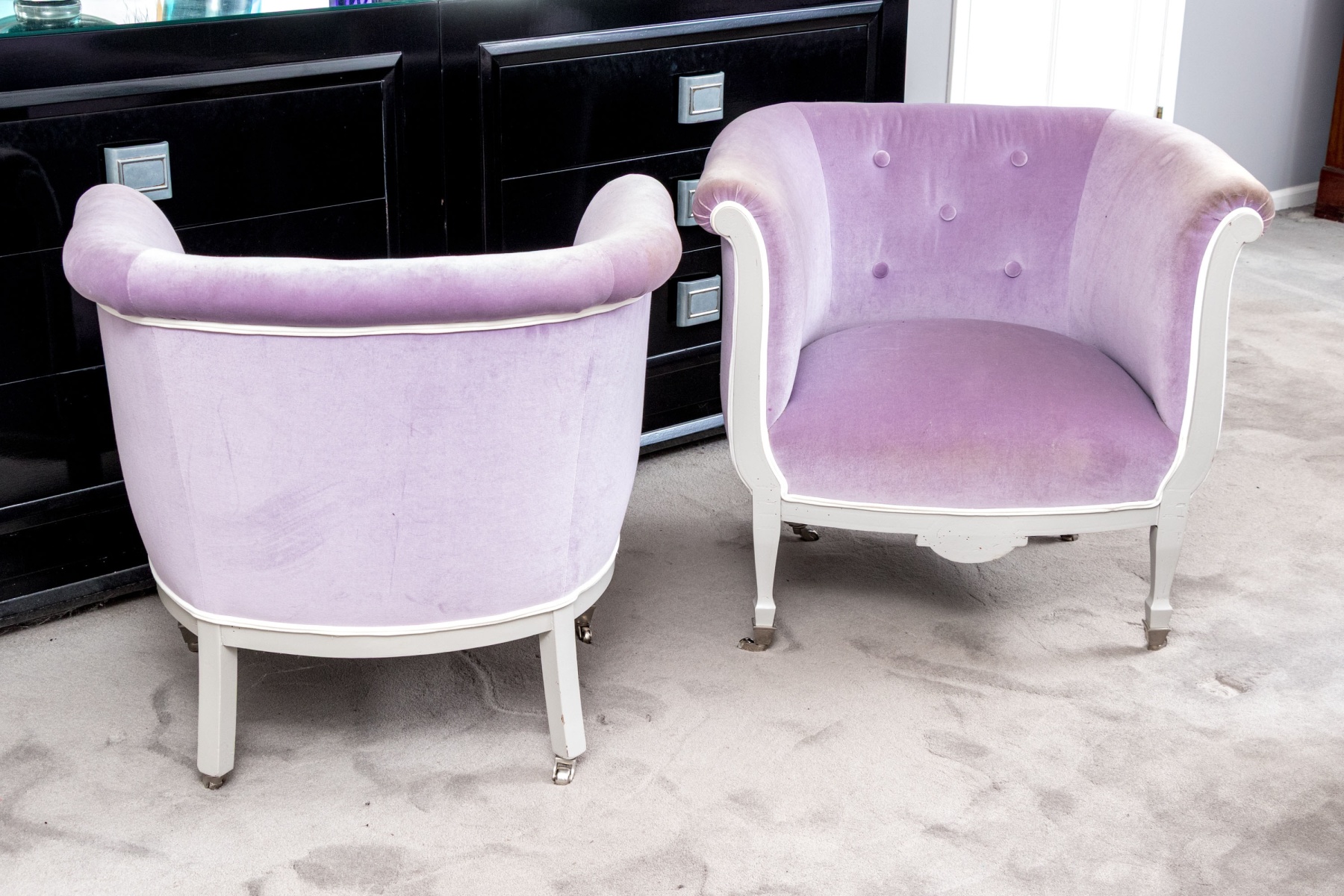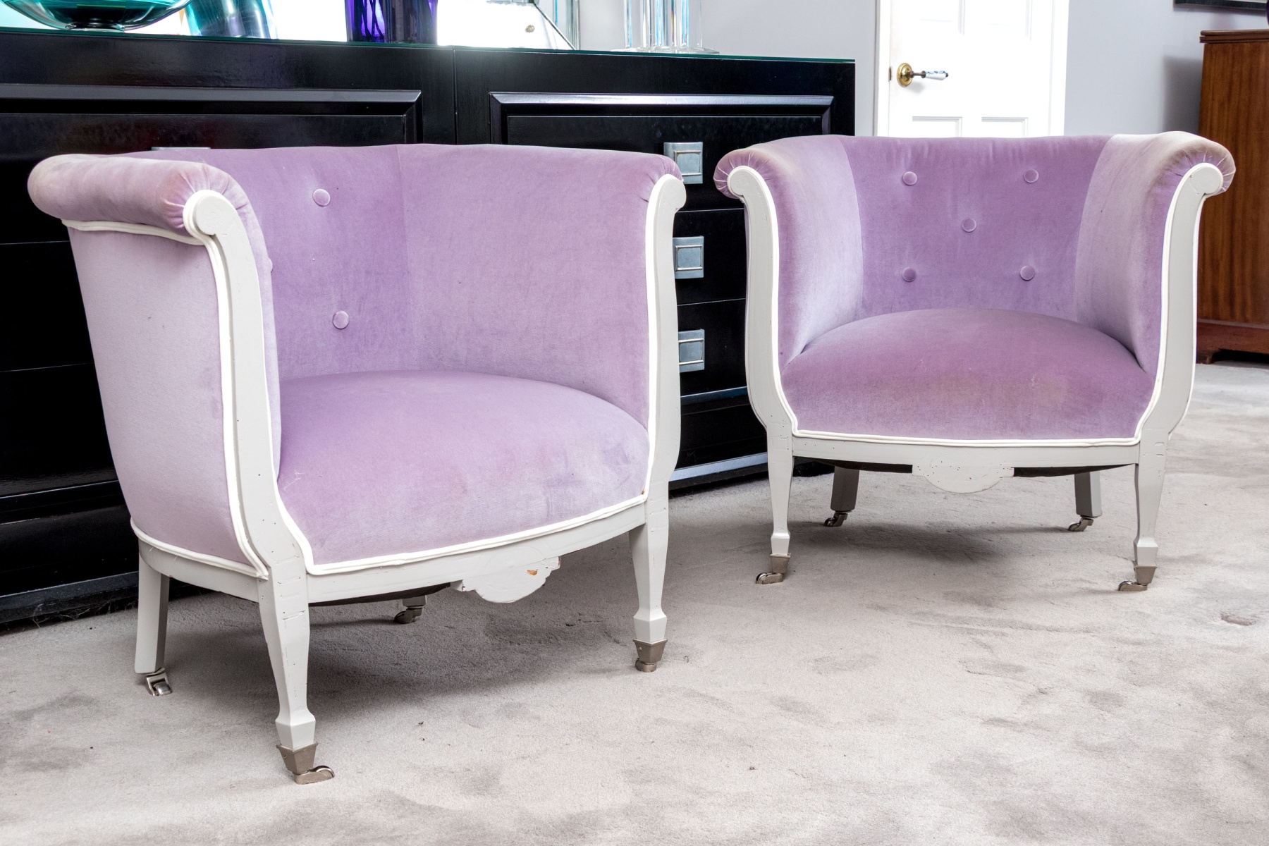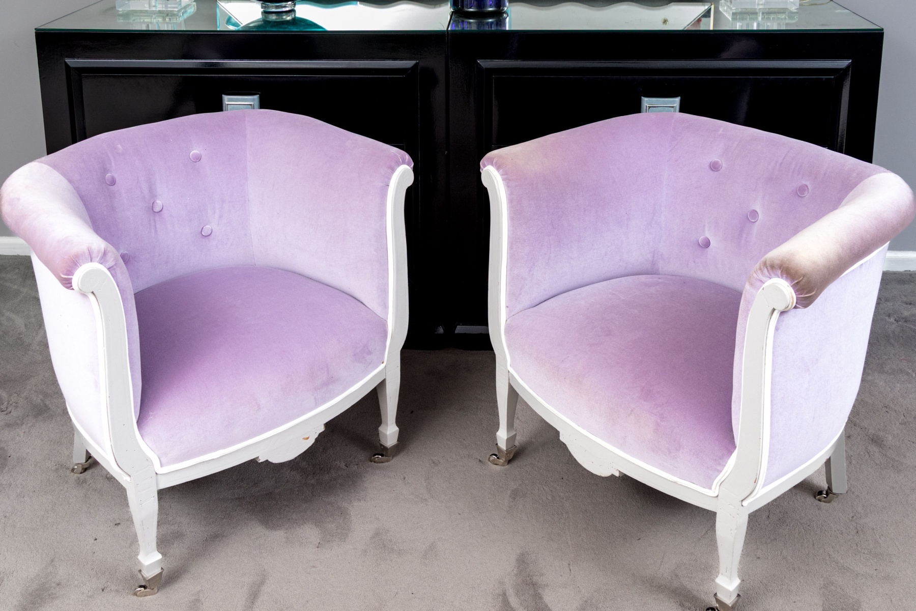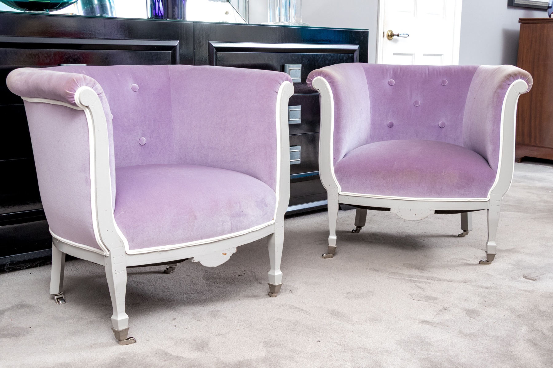 A chic pair of tub chairs perfectly blending fresh contemporary style with traditional Louis XVI elegance, custom upholstered and button tufted in pale purple mochair with white painted frames supporting rolled arms and straight legs with arrow feet over casters.