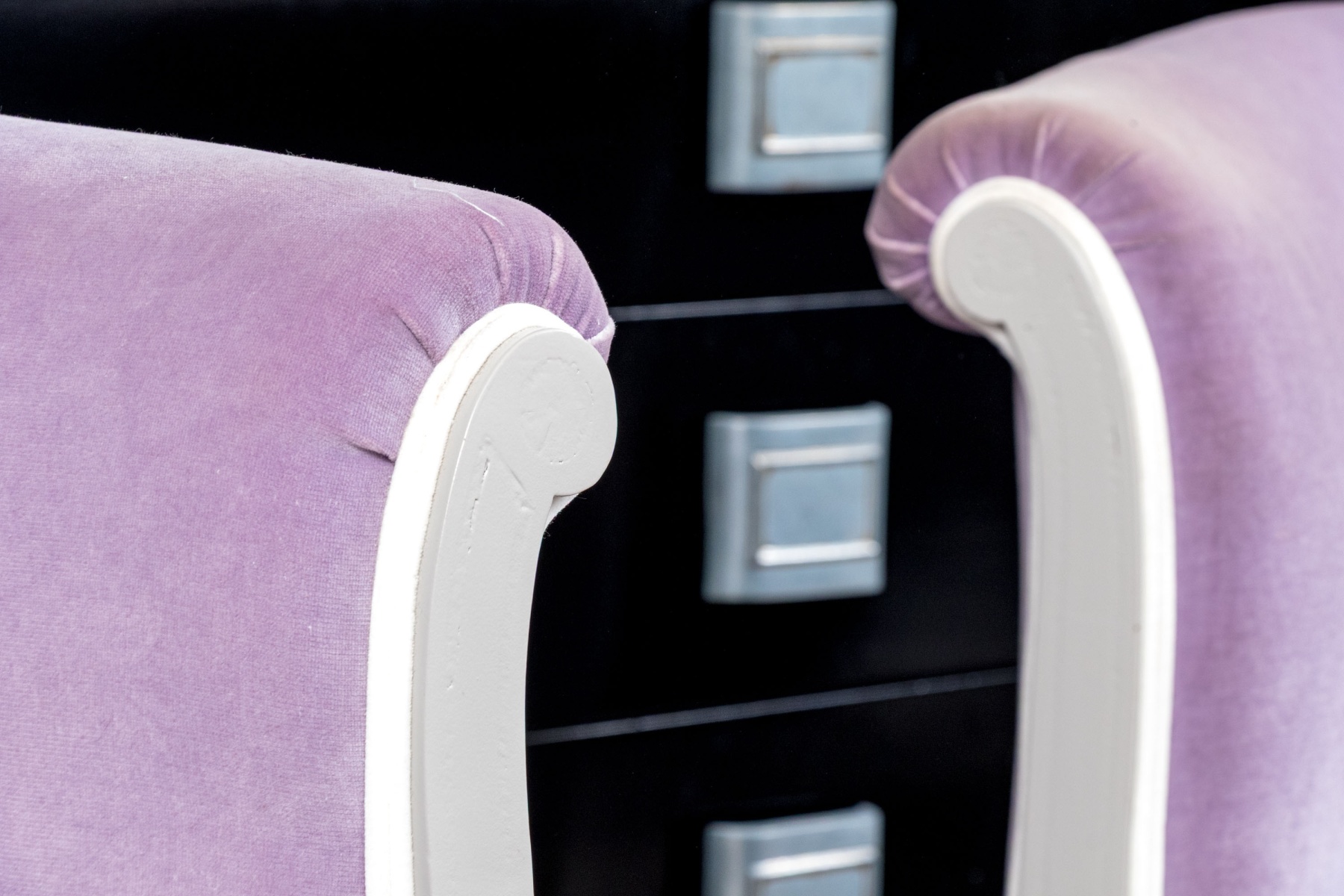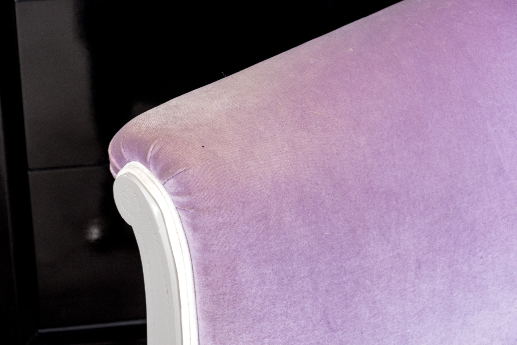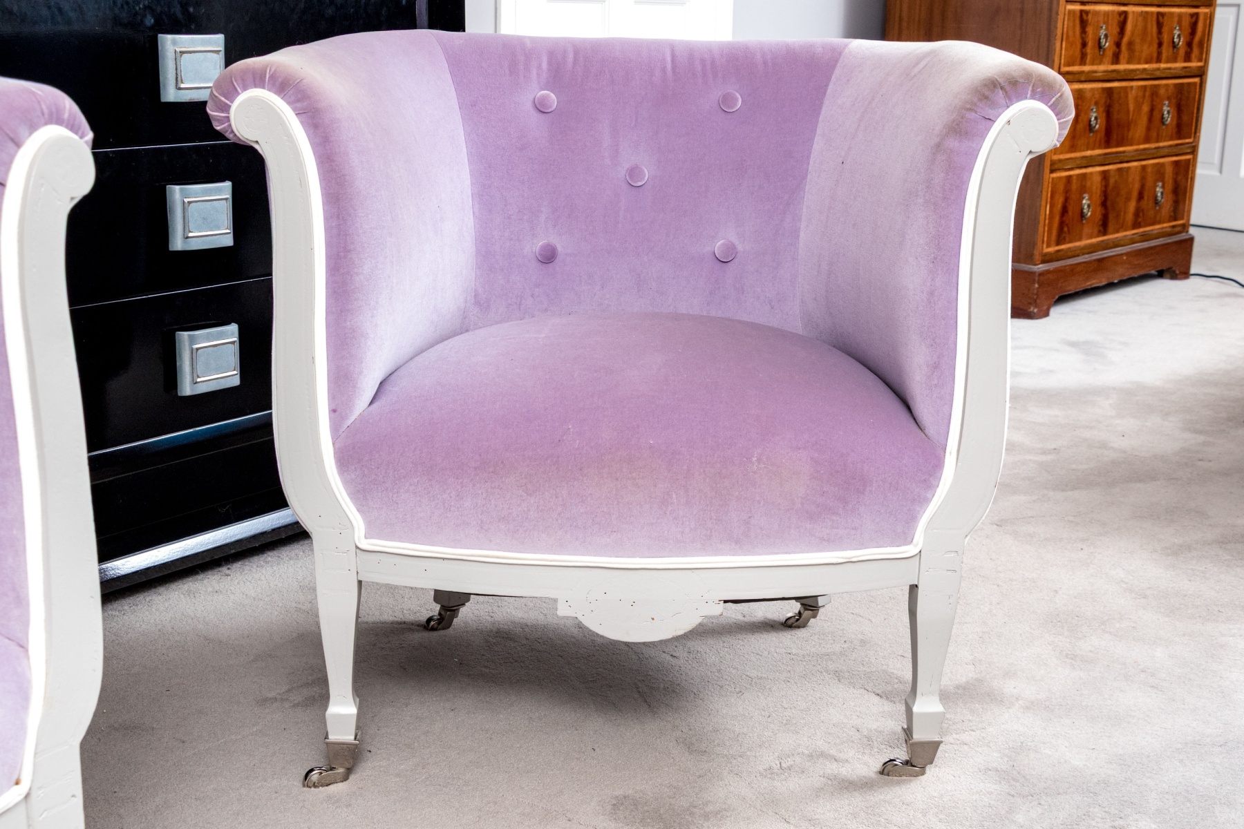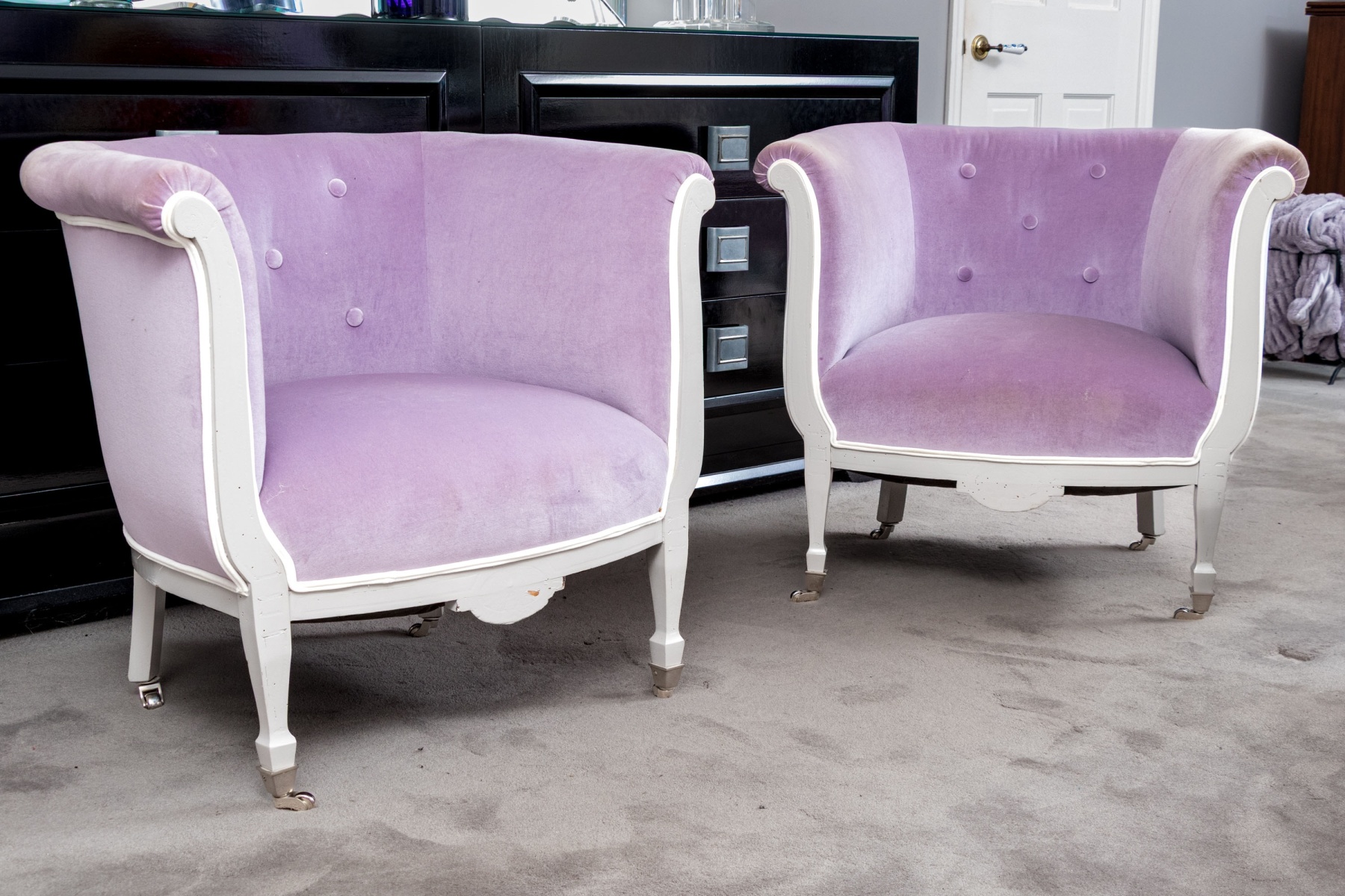 A chic pair of tub chairs perfectly blending fresh contemporary style with traditional Louis XVI elegance, custom upholstered and button tufted in pale purple mochair with white painted frames supporting rolled arms and straight legs with arrow feet over casters.