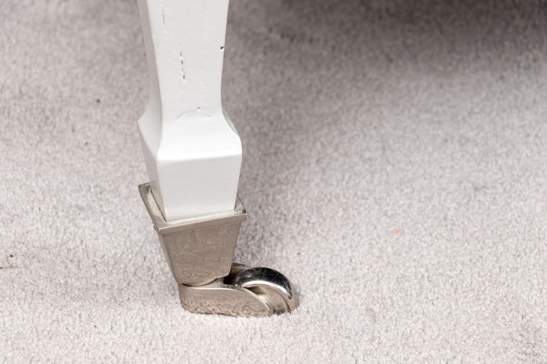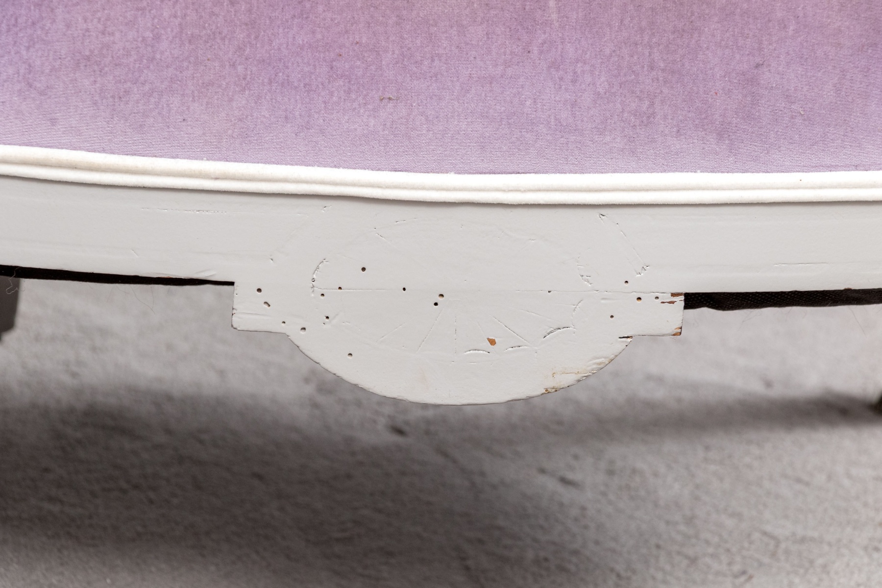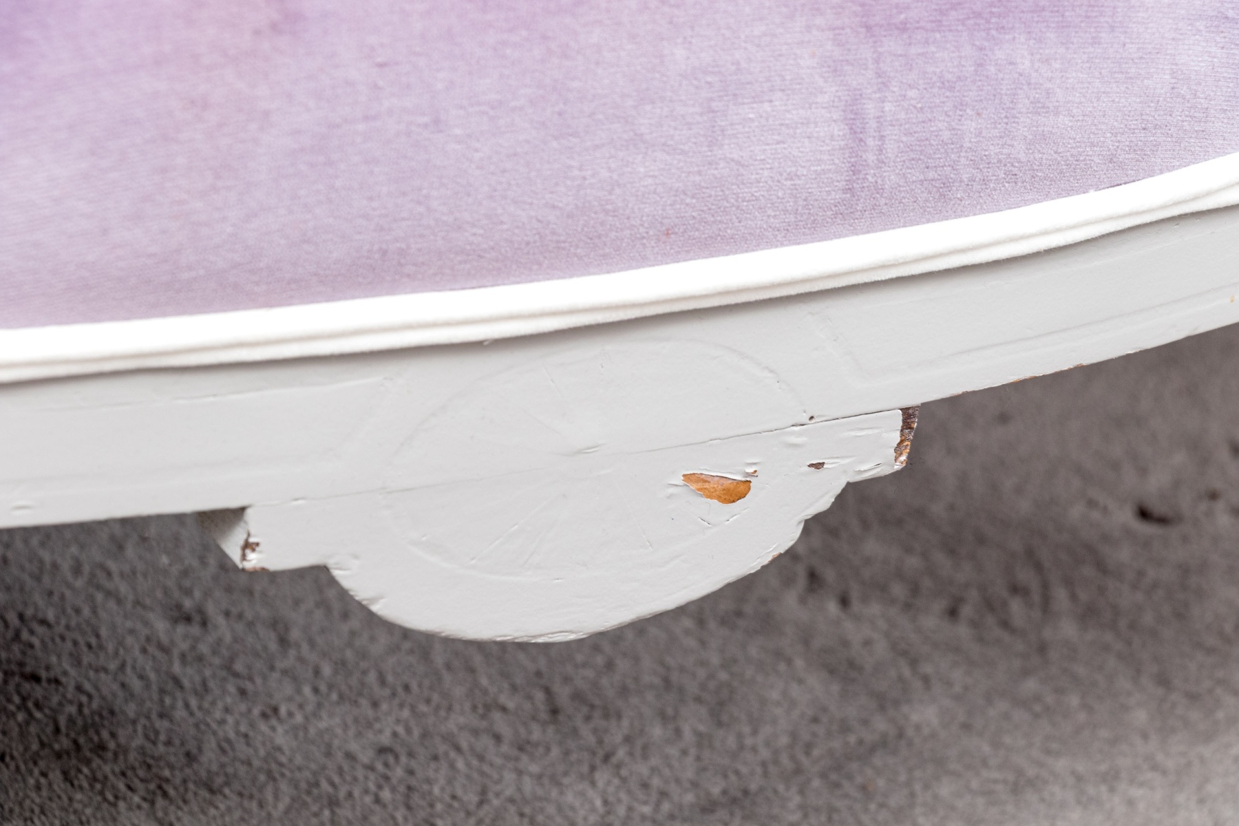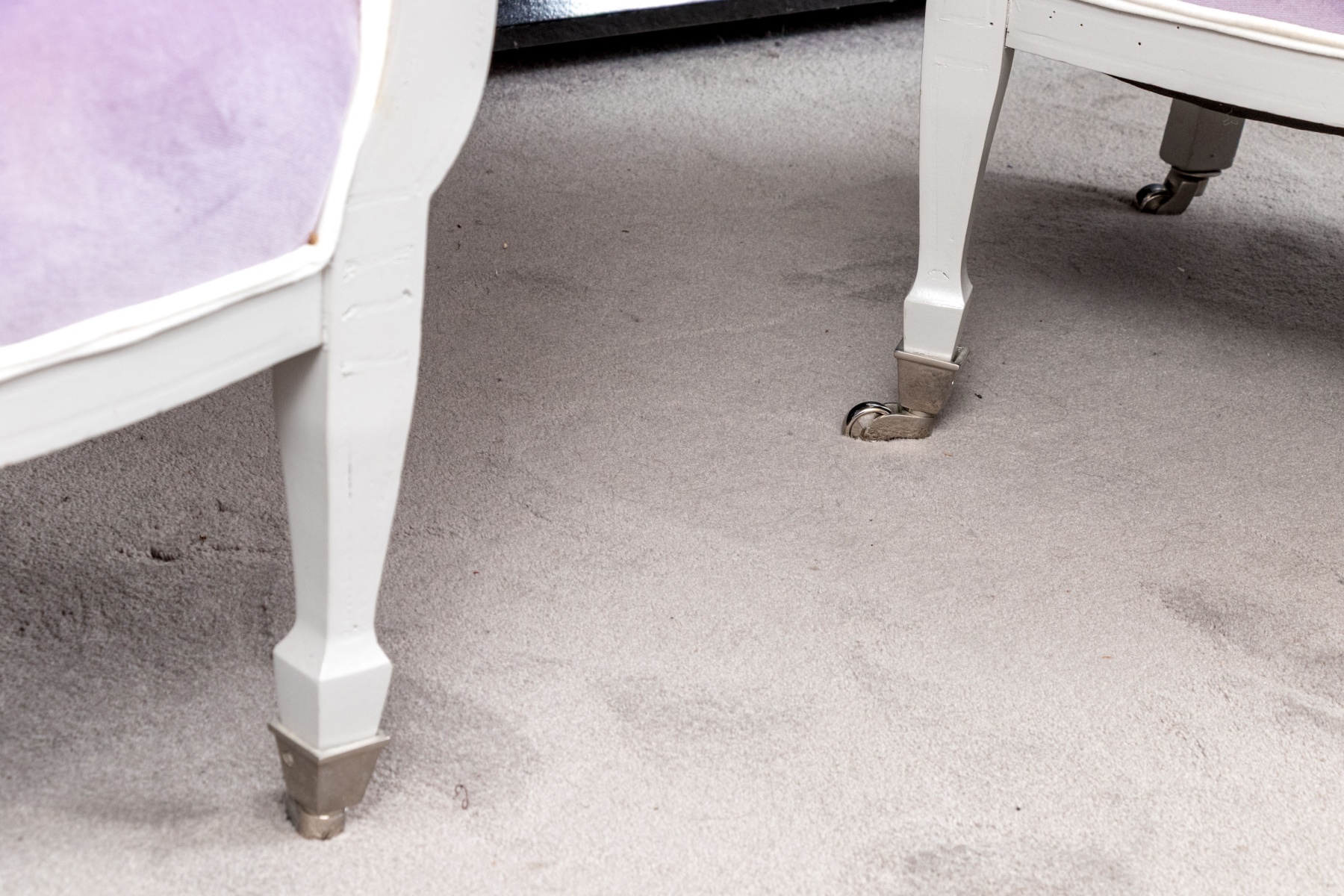 A chic pair of tub chairs perfectly blending fresh contemporary style with traditional Louis XVI elegance, custom upholstered and button tufted in pale purple mochair with white painted frames supporting rolled arms and straight legs with arrow feet over casters.