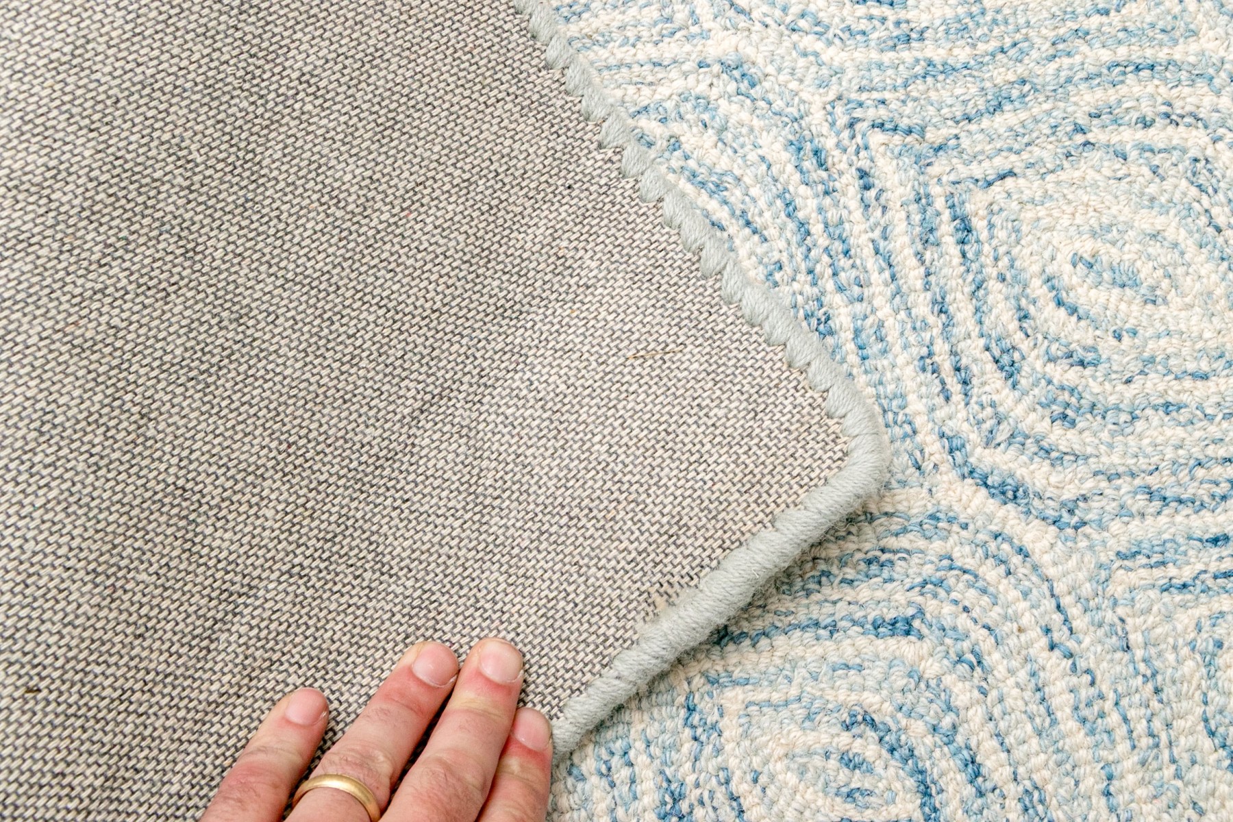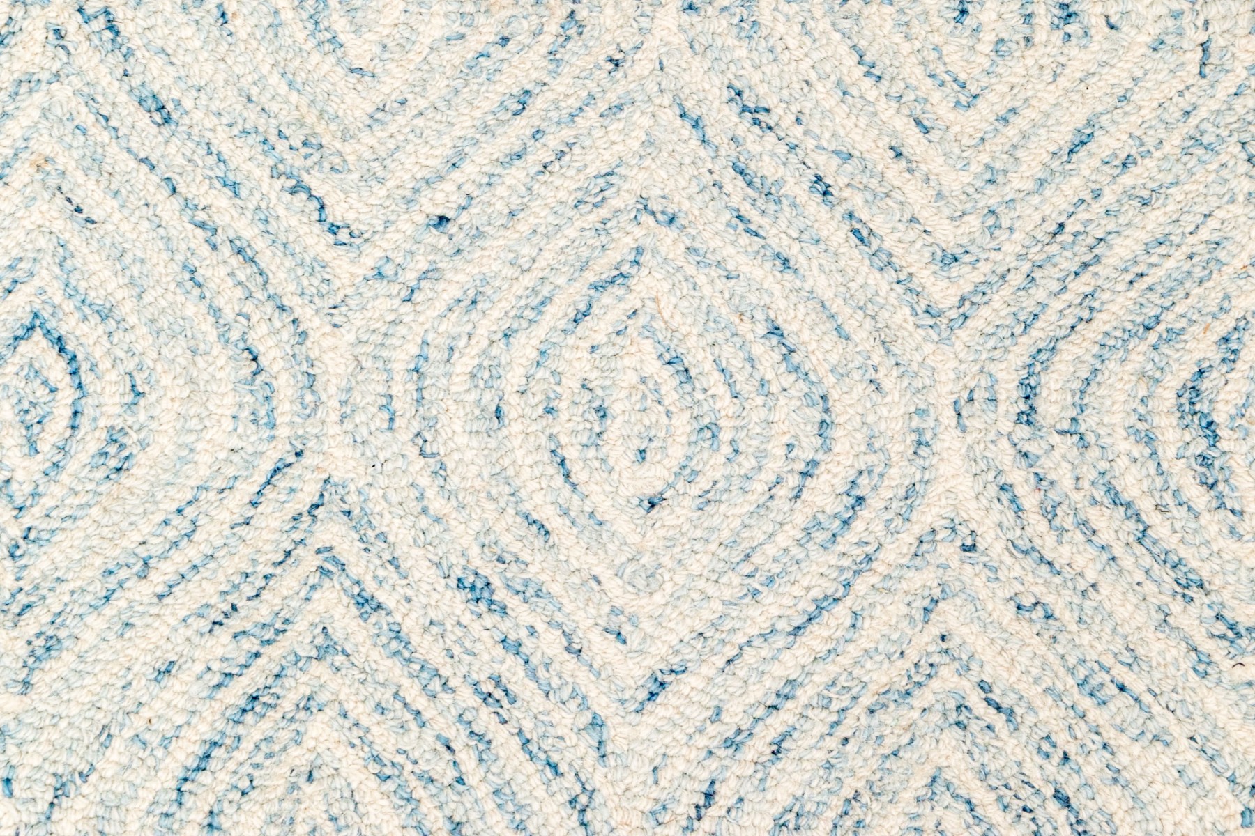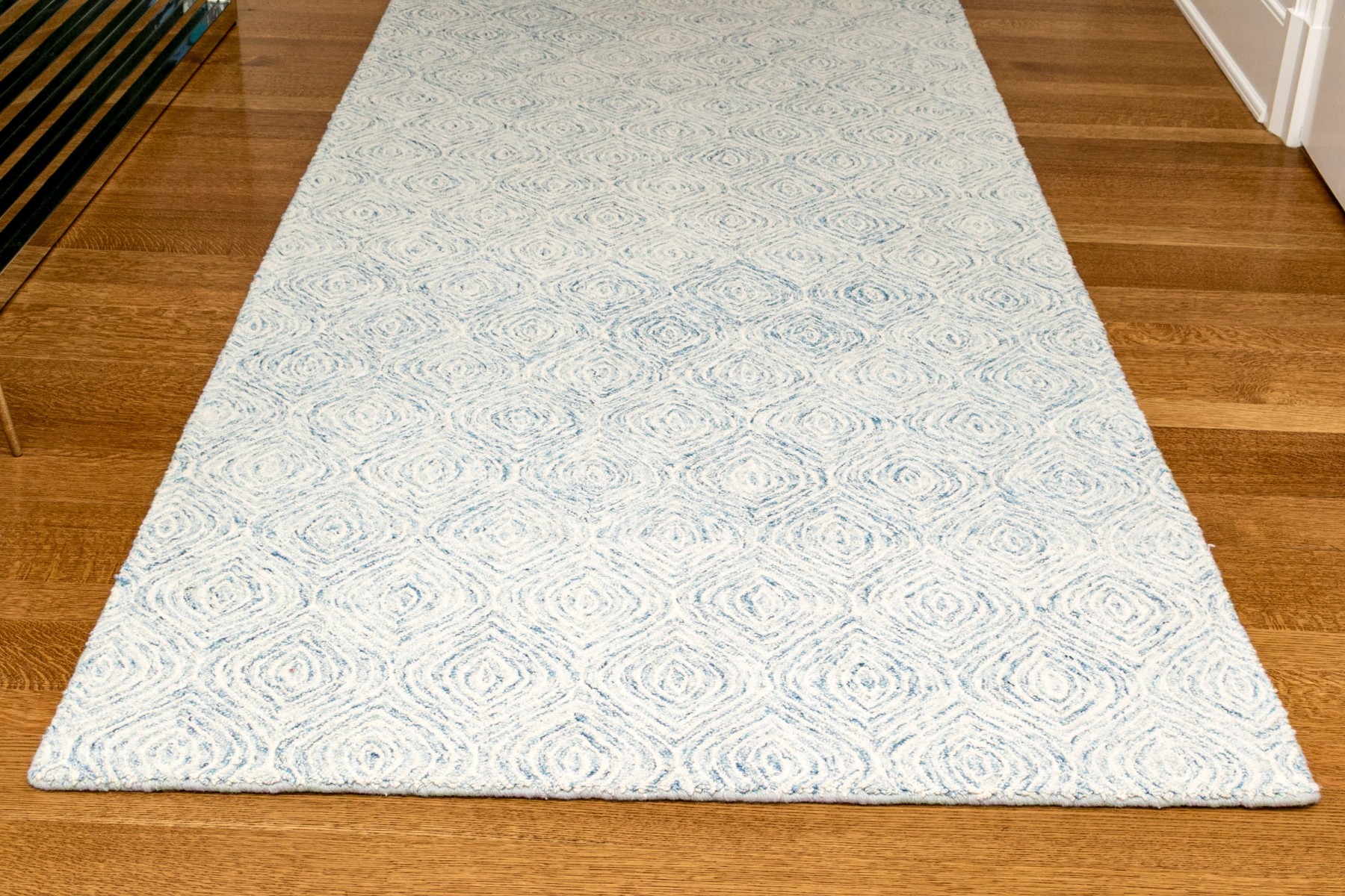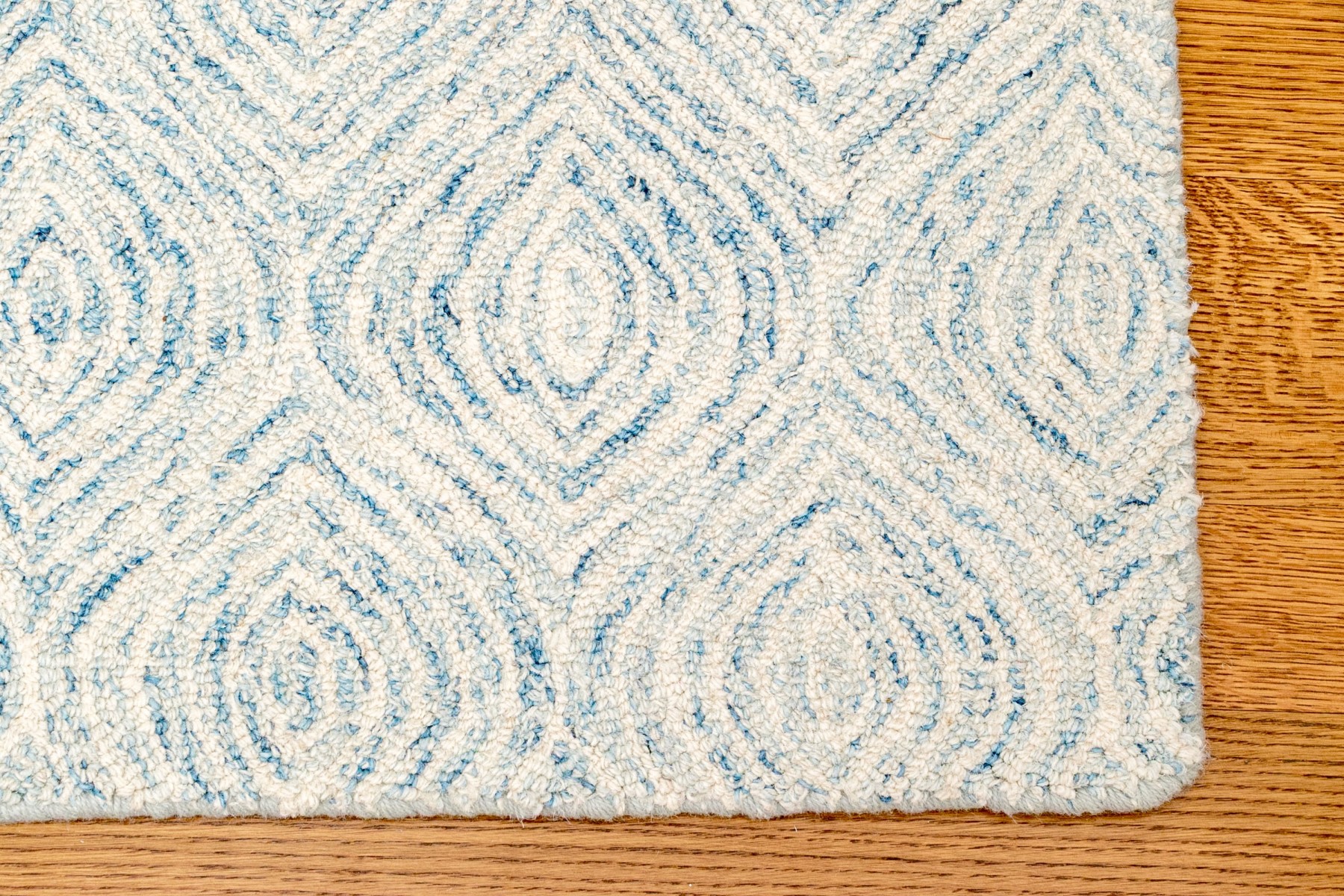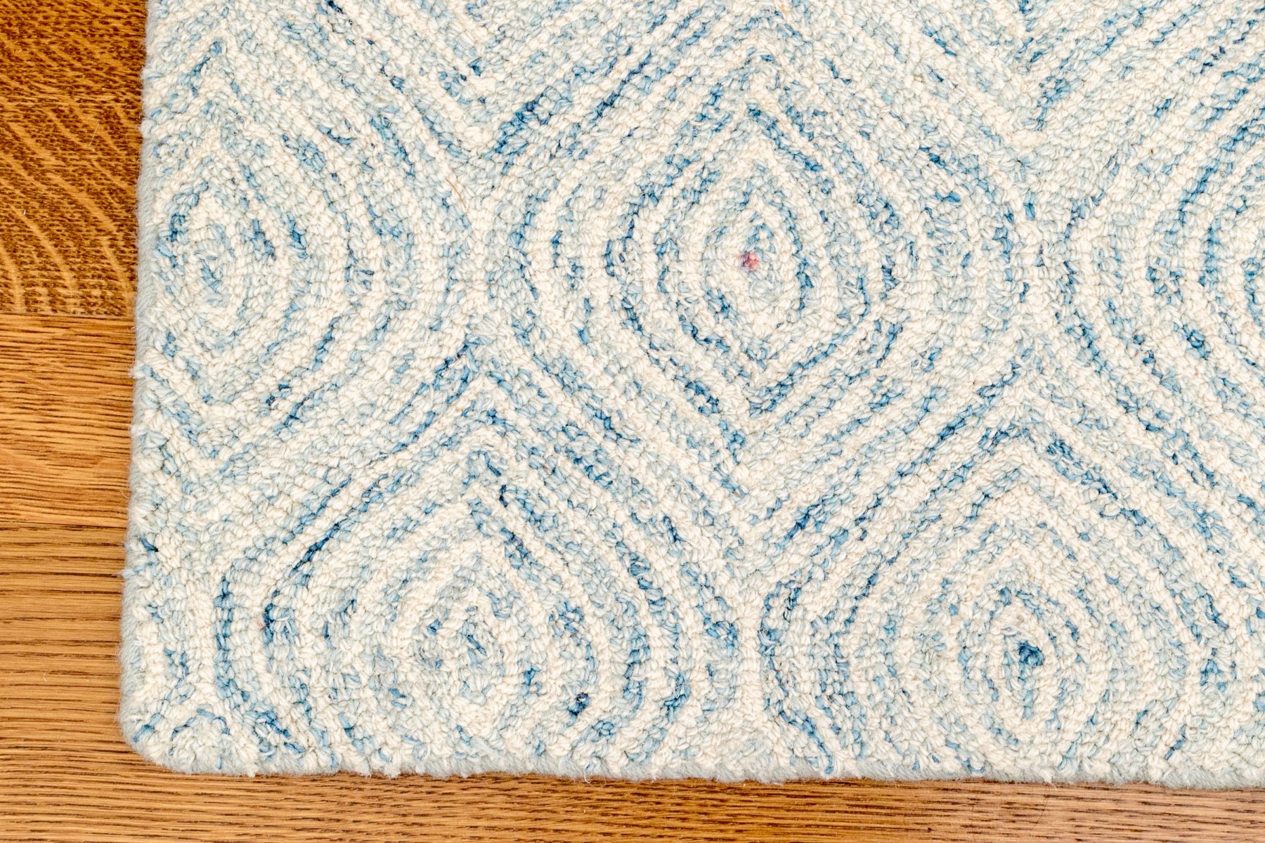 A fabulous and high quality wide runner rug designed with a refreshing blue and white concentric navette pattern.