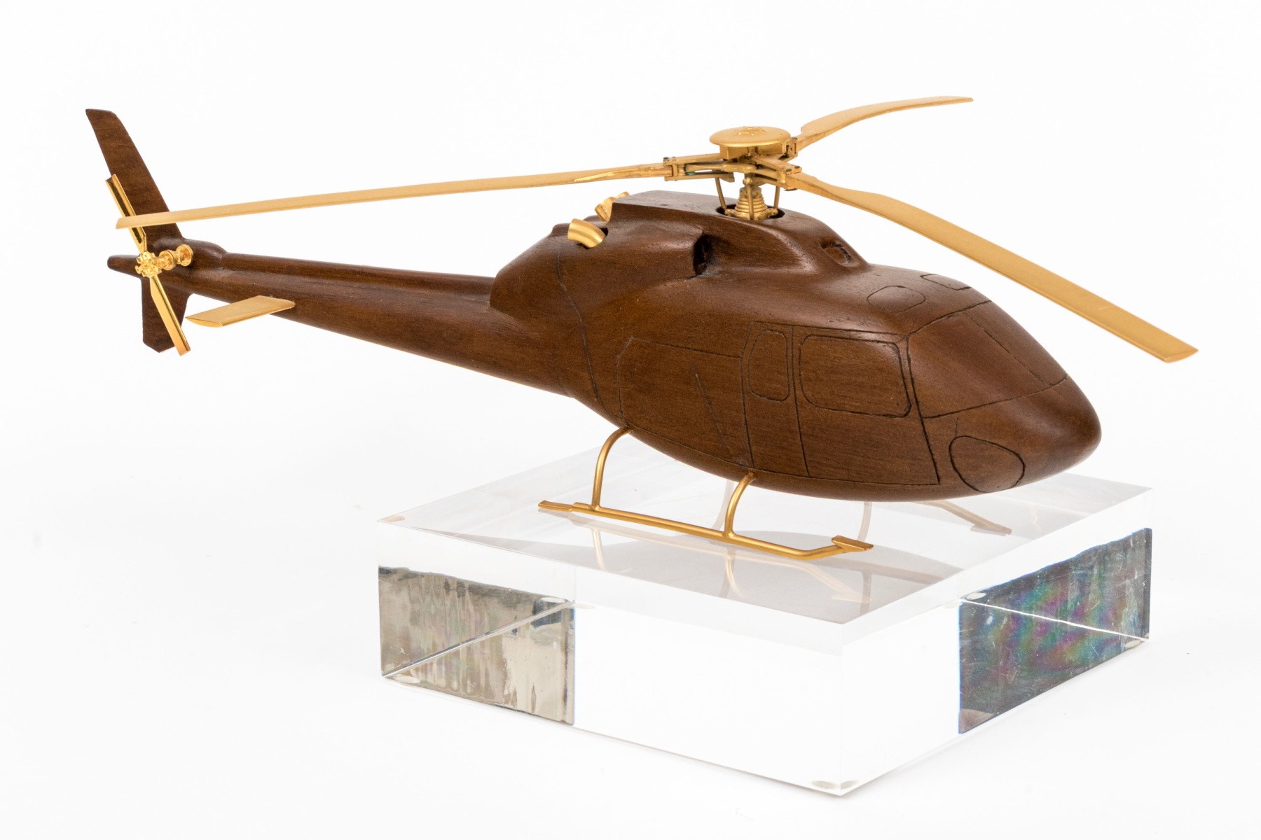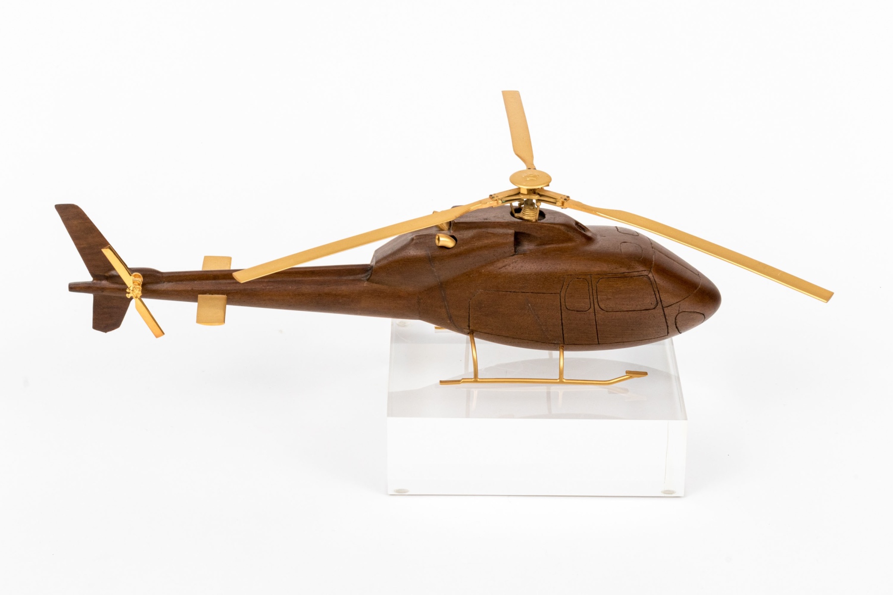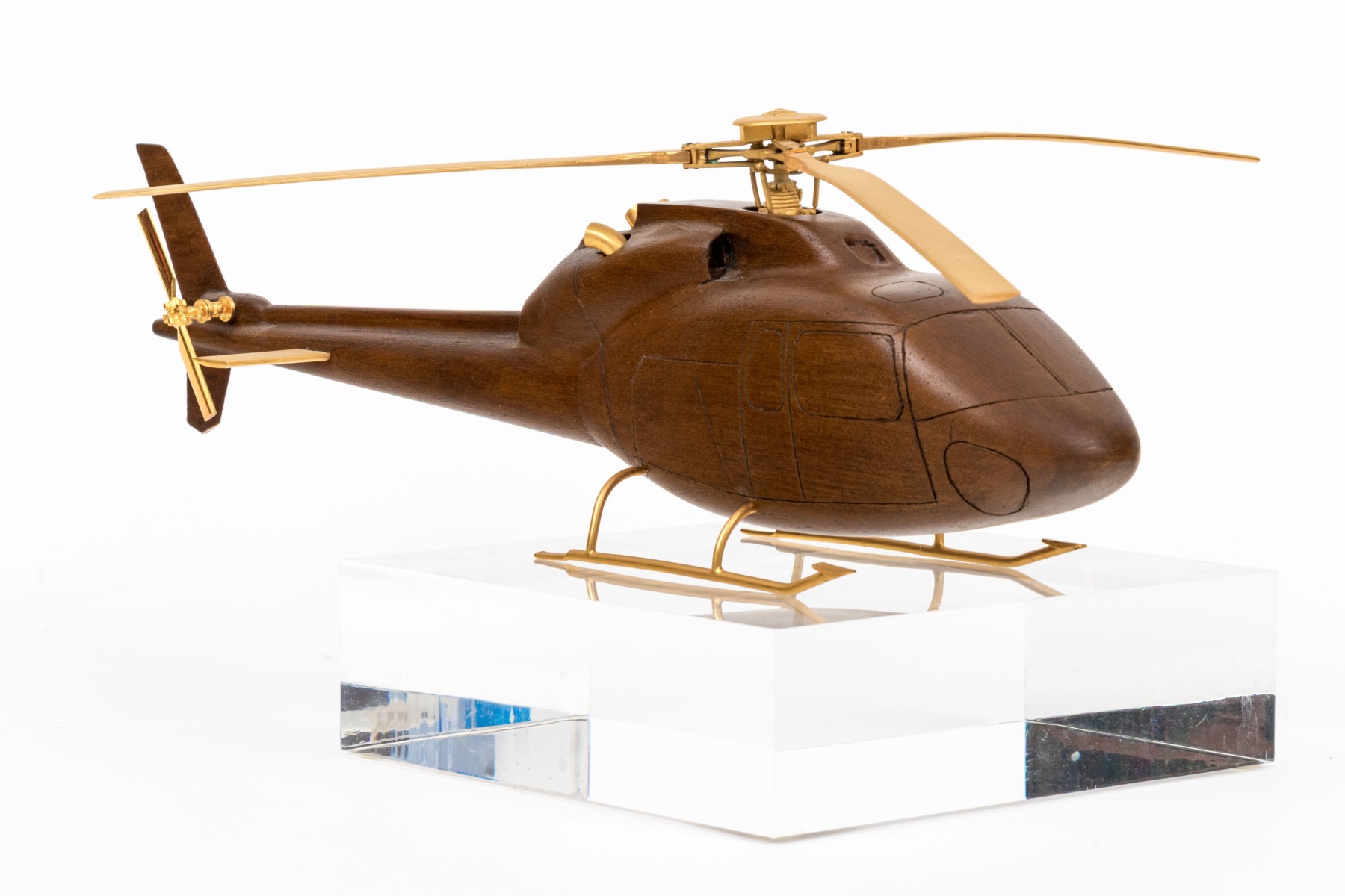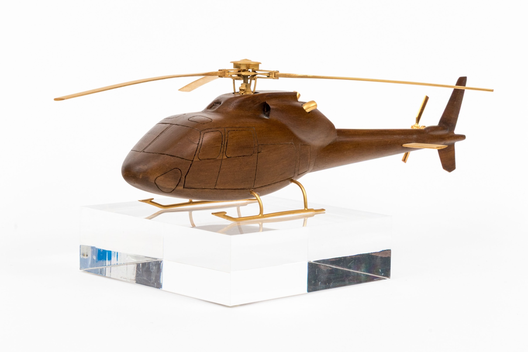 A high quality carved wood model of a helicopter in a beautiful dark brown finish, featuring precision cast brass rotary blades, wings and support skis. Displayed on square clear acrylic base.