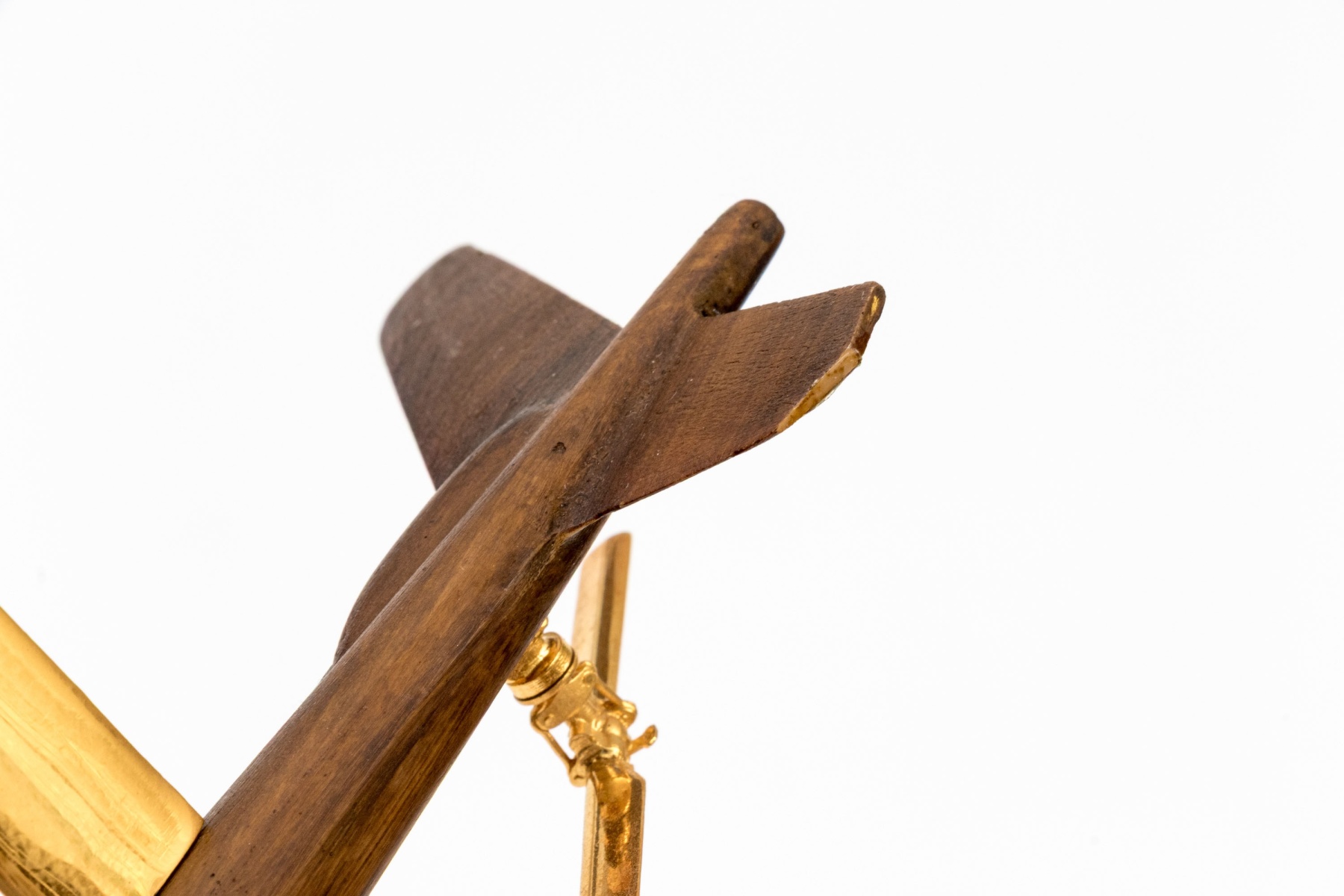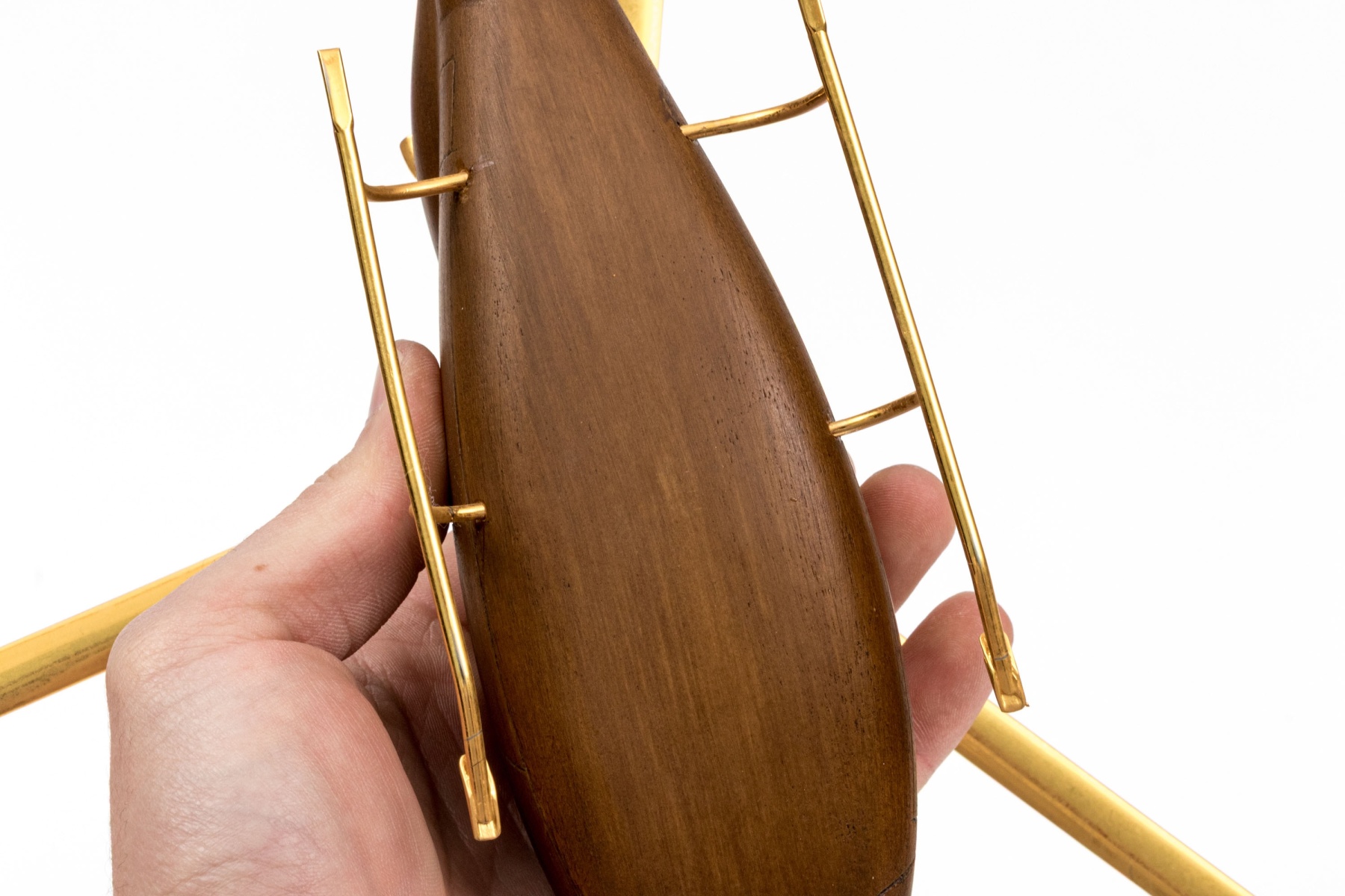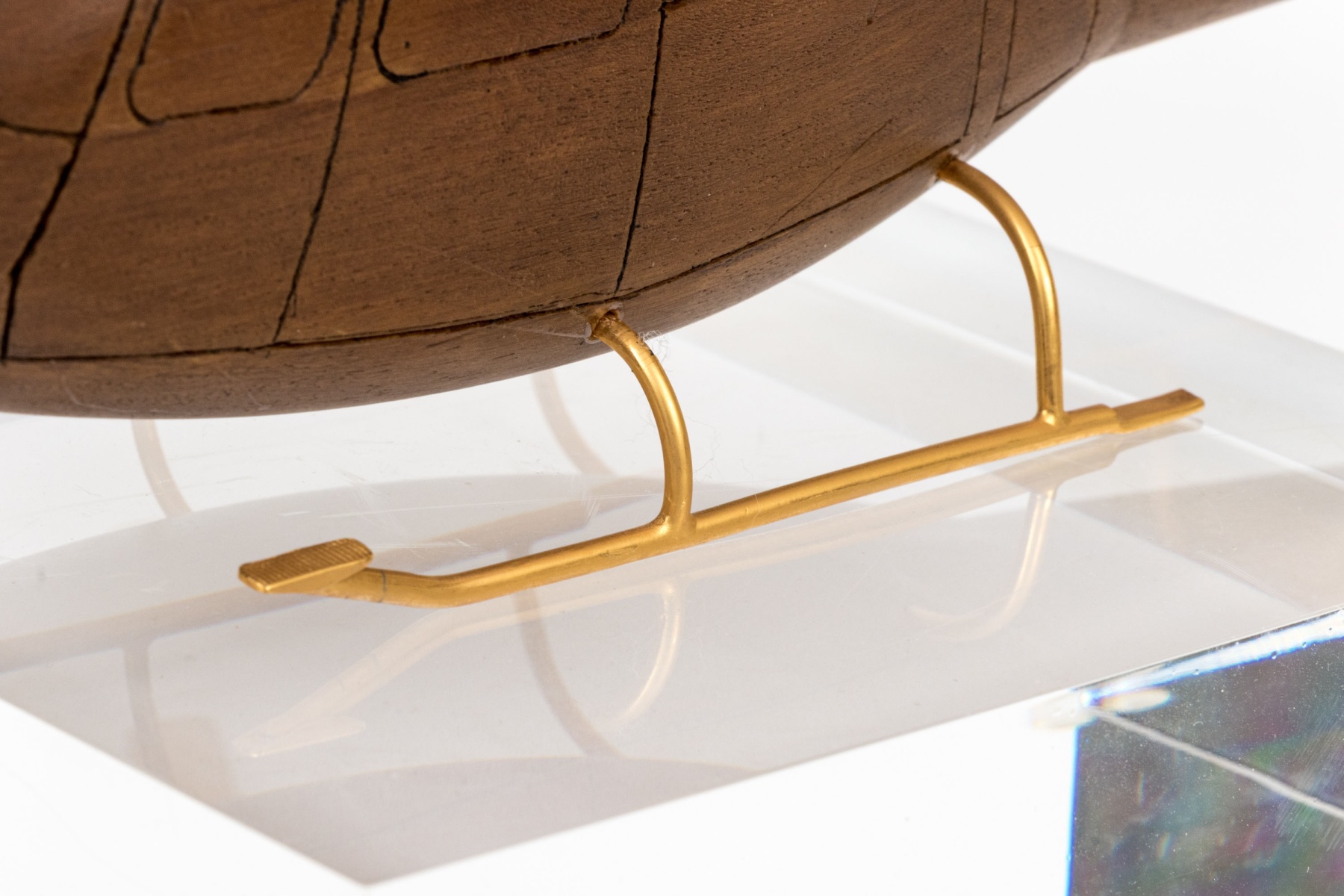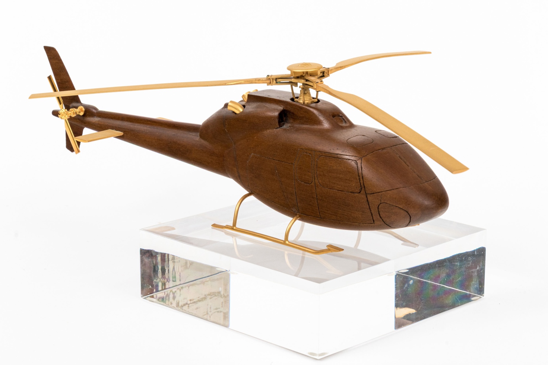 A high quality carved wood model of a helicopter in a beautiful dark brown finish, featuring precision cast brass rotary blades, wings and support skis. Displayed on square clear acrylic base.