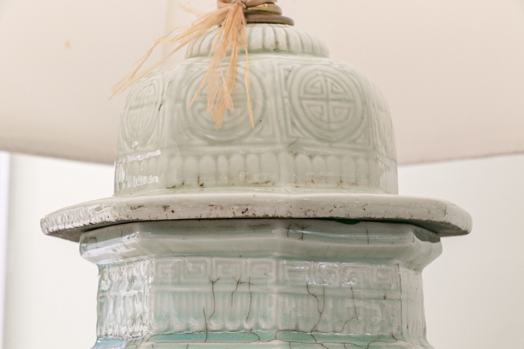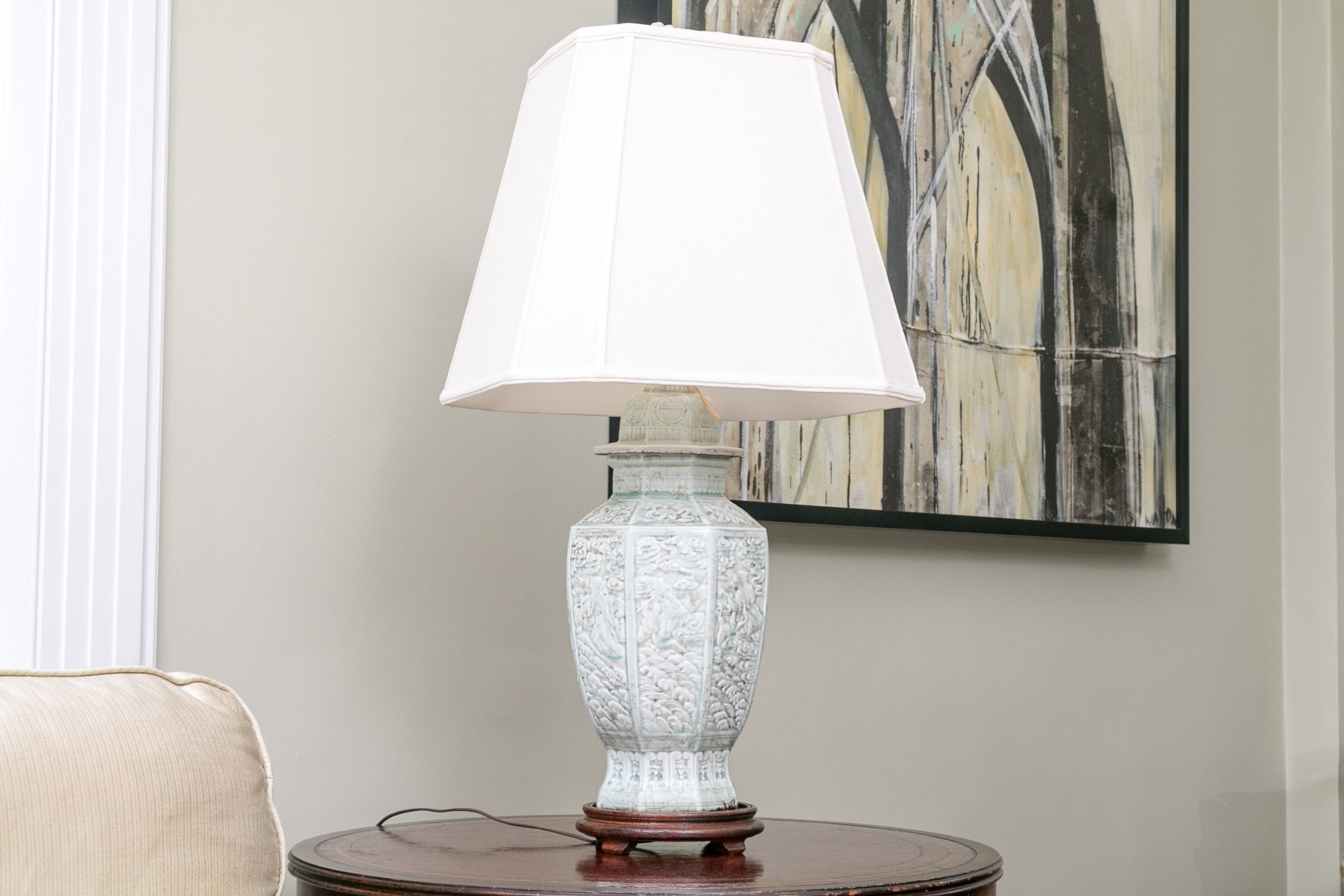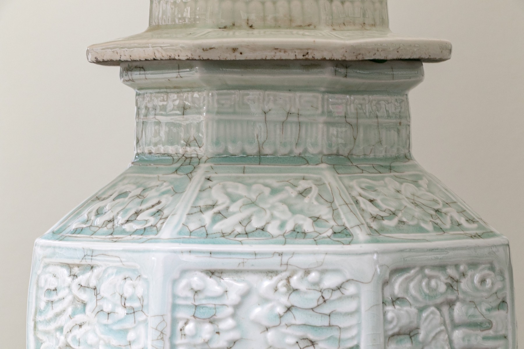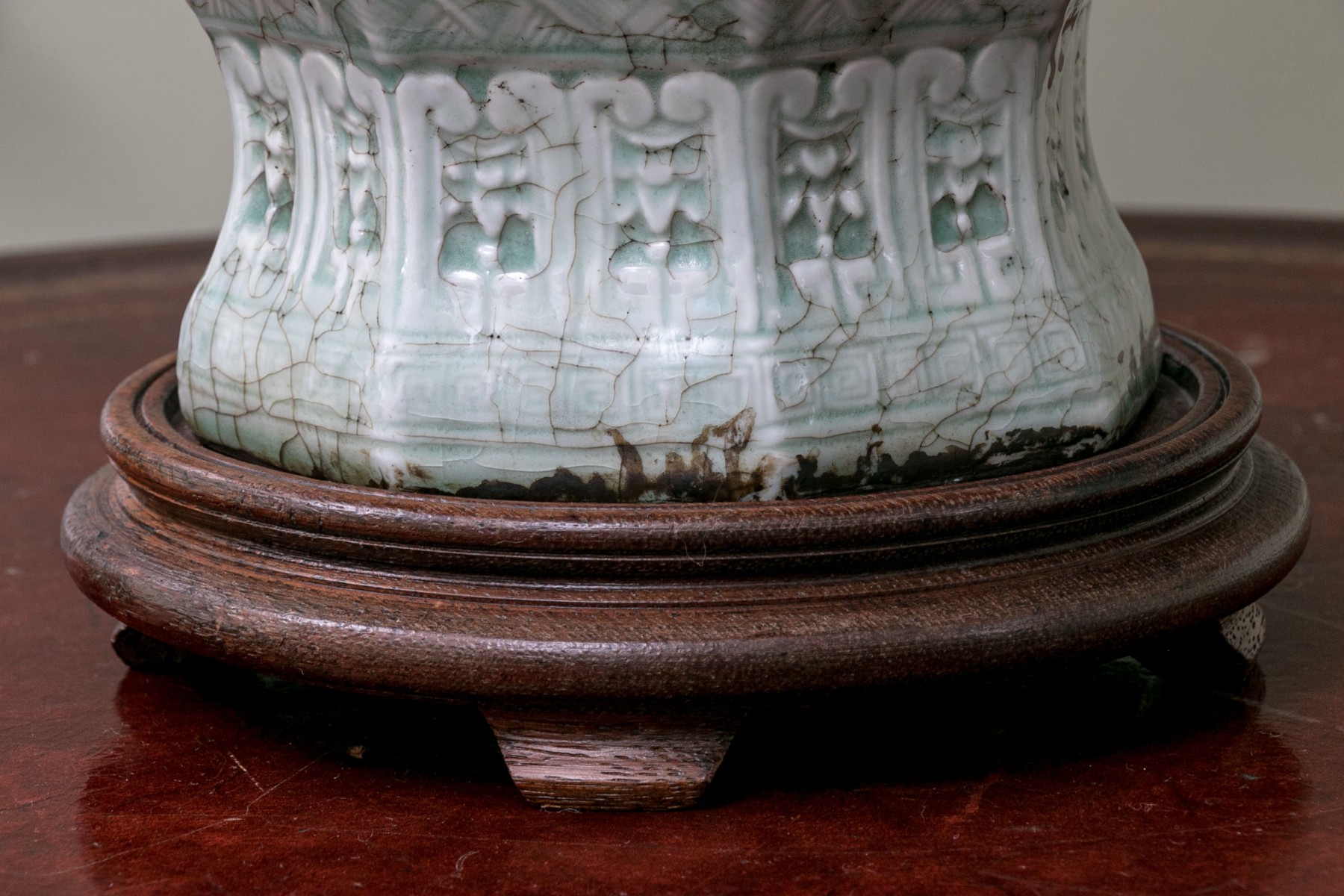 Chinese ginger jar with octagonal base having panels of figures in intricate high relief and mounted on a footed wooden base. Comes with a torn shade that is only included as a template for a new shade and a hard stone finial.