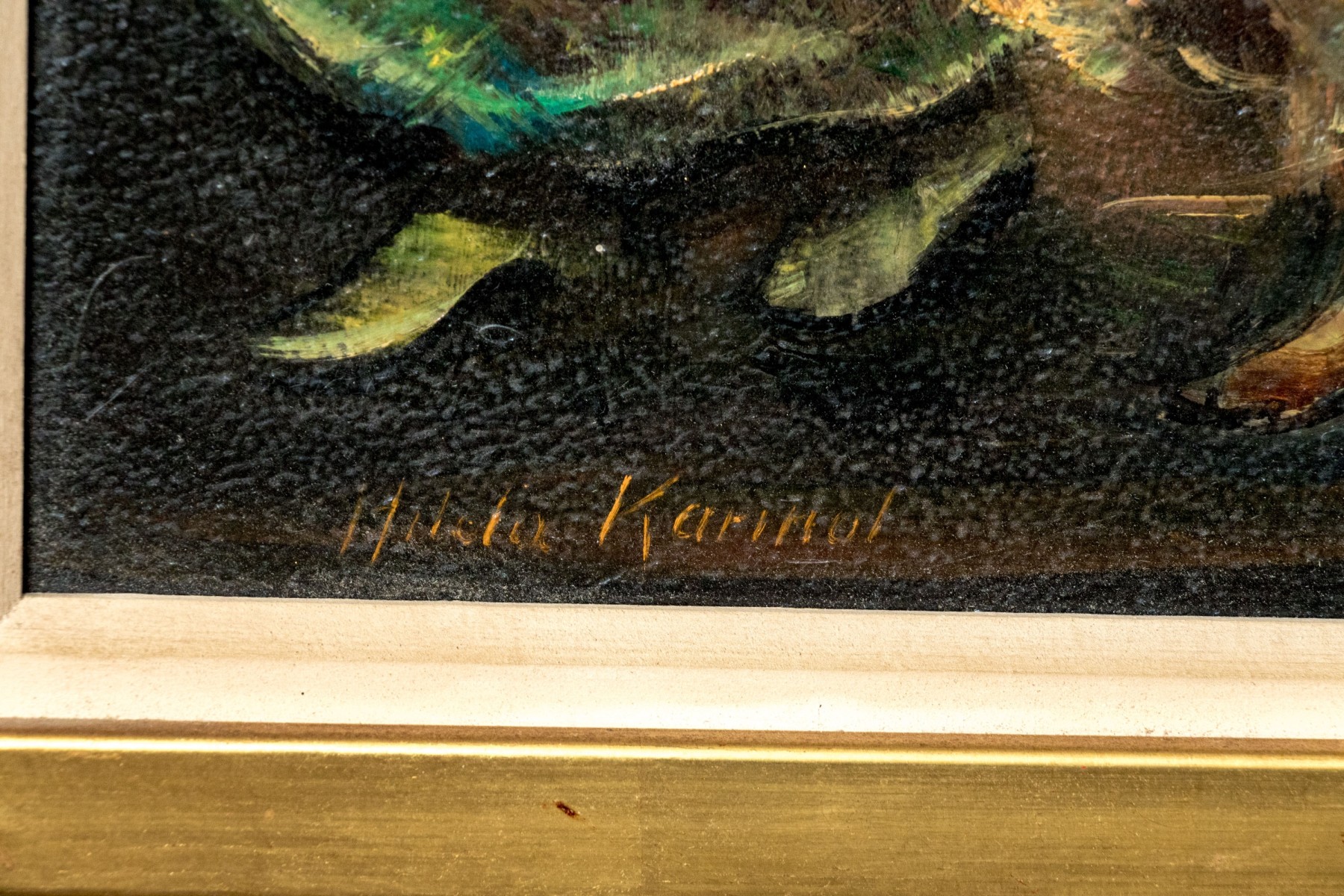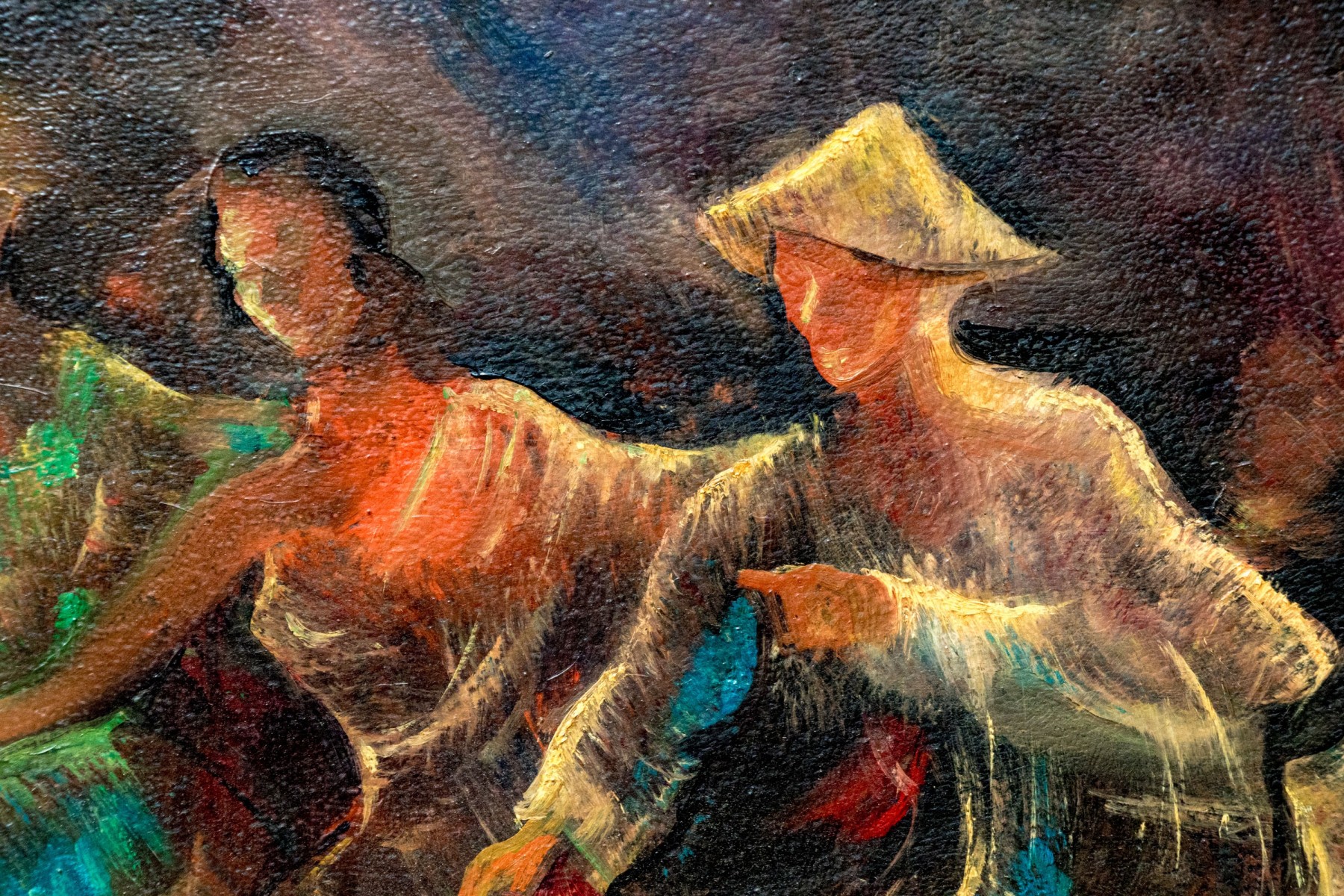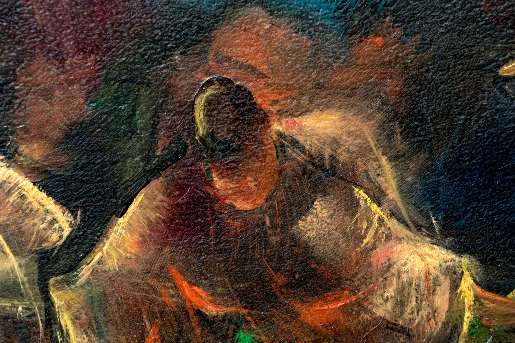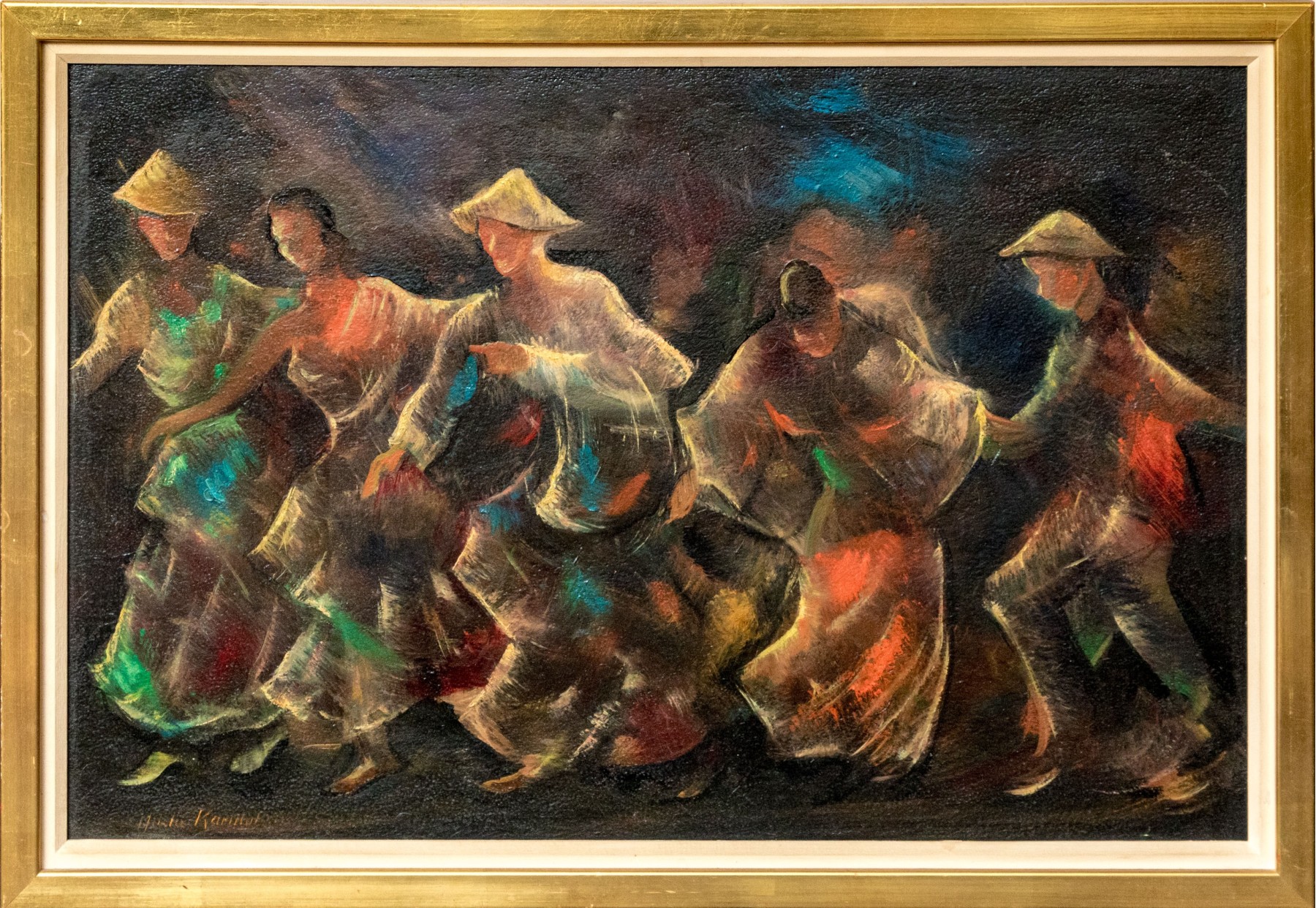 Hilda Karniol (American, 1910-2003) Oriental Dancers oil painting on board depicting an abstract procession of dancers in colorful long robes against a dark background. Signed lower left.