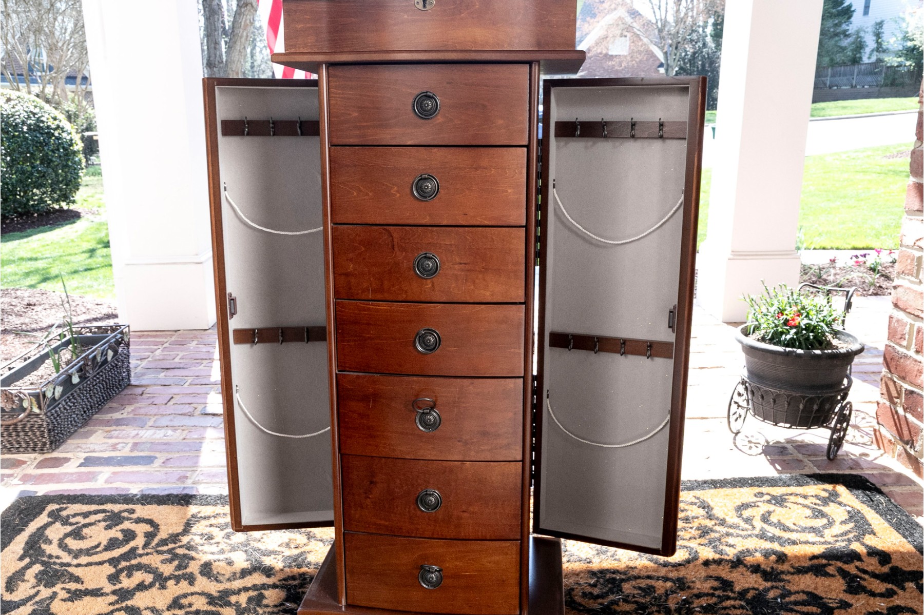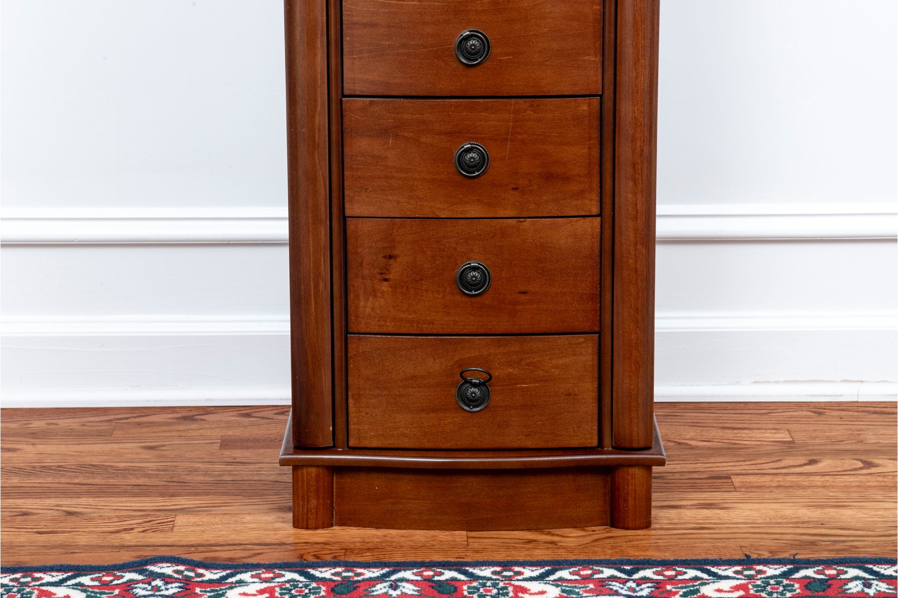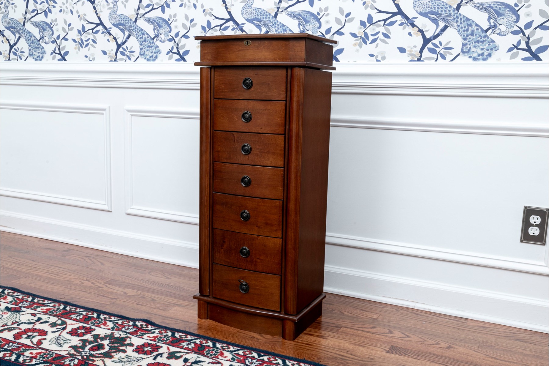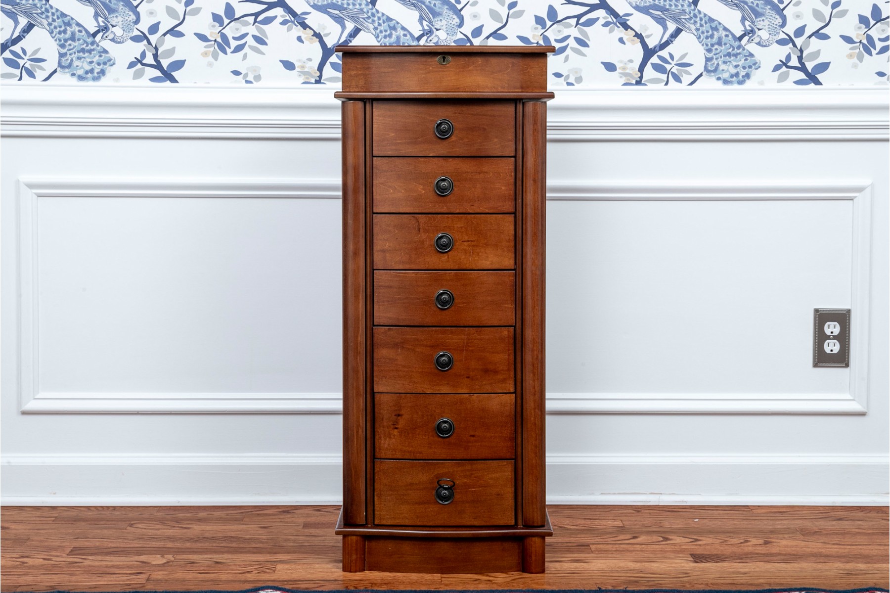 Hives and Honey contemporary jewelry armoire in traditional style, displaying a flip-top lid and side cabinets flanking seven drawers.