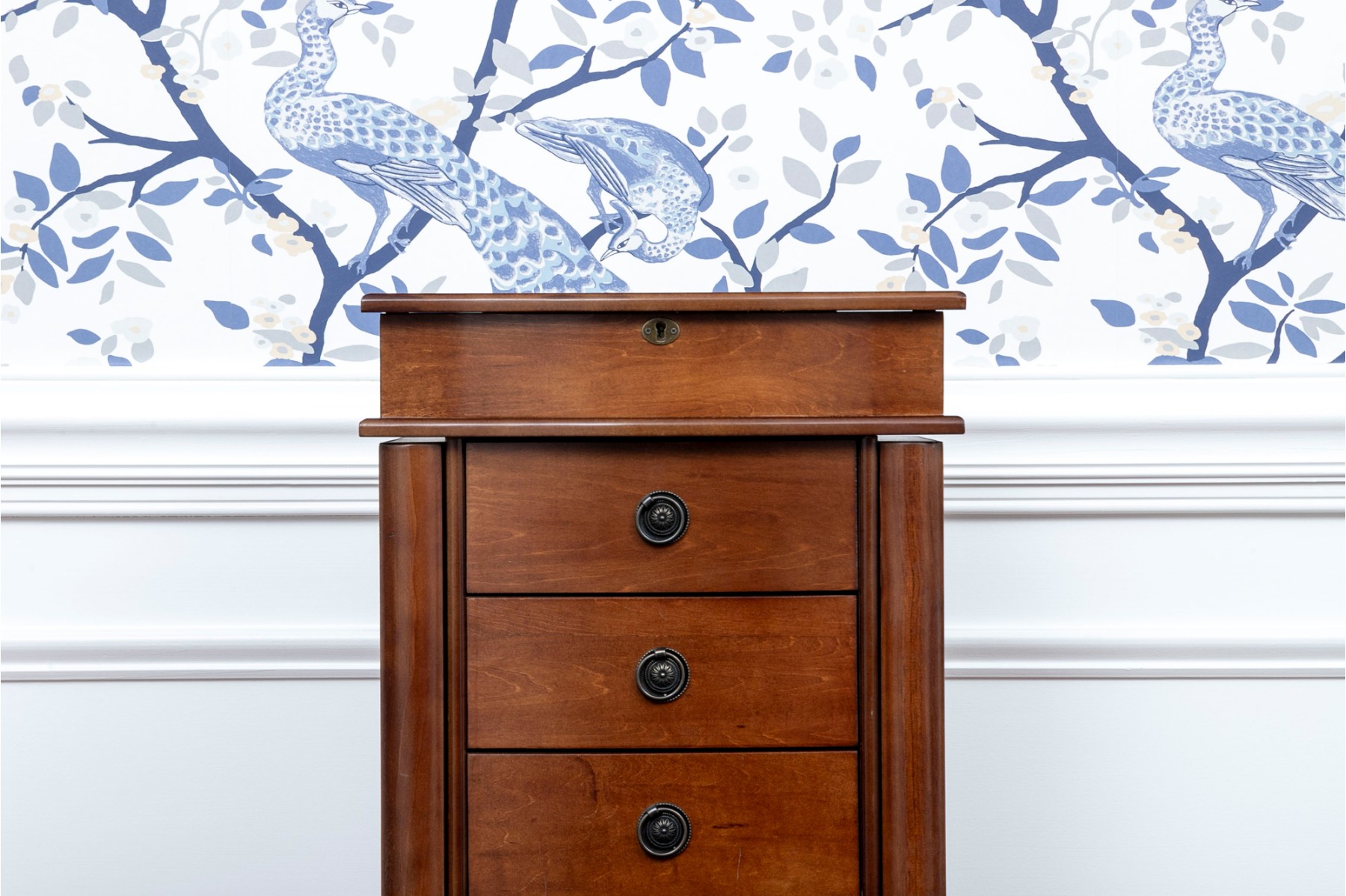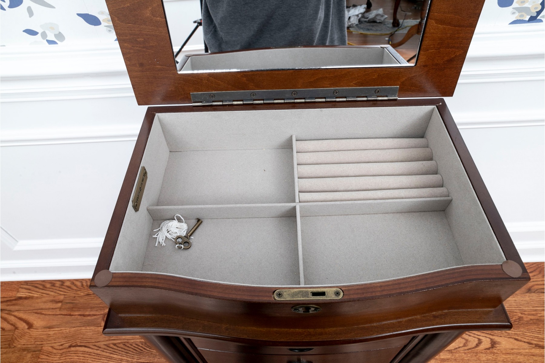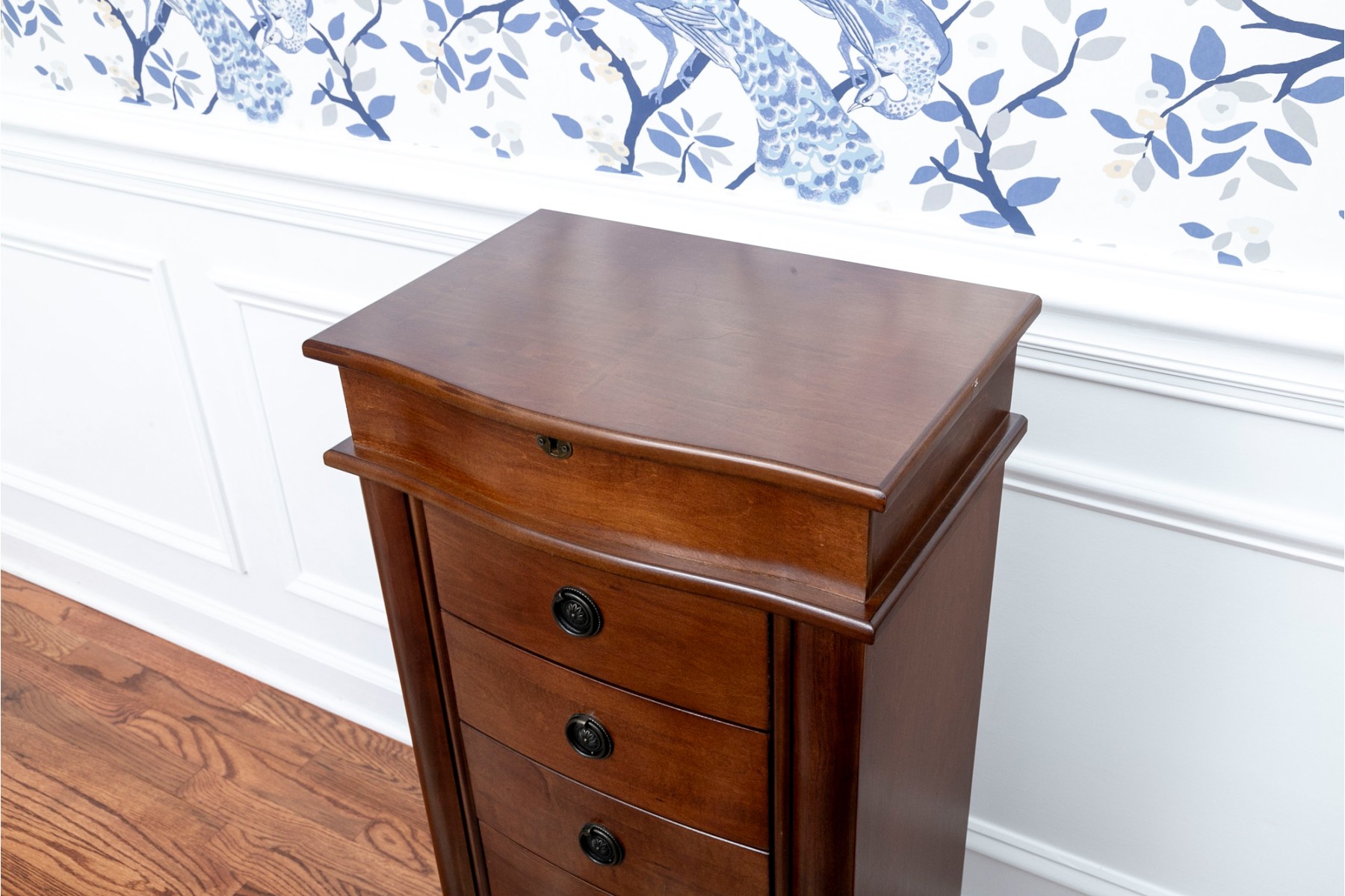 Hives and Honey contemporary jewelry armoire in traditional style, displaying a flip-top lid and side cabinets flanking seven drawers.