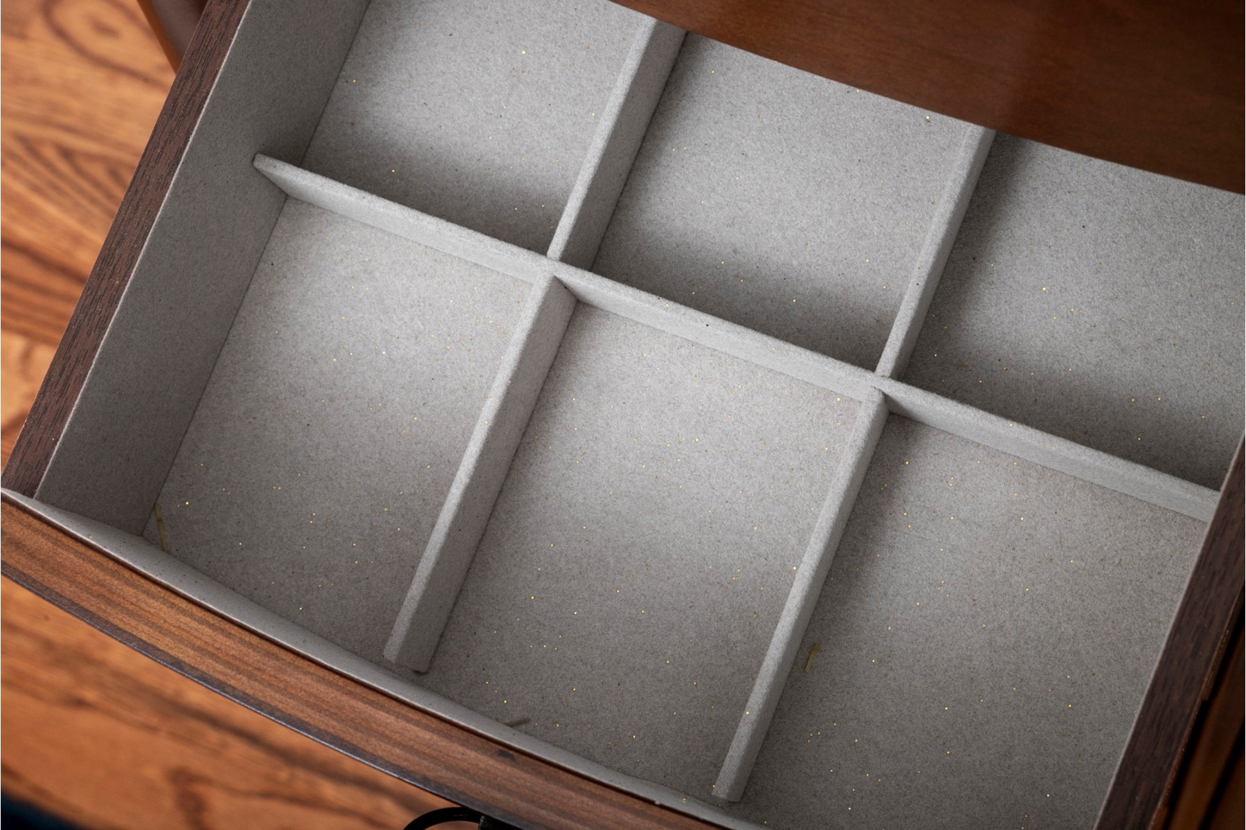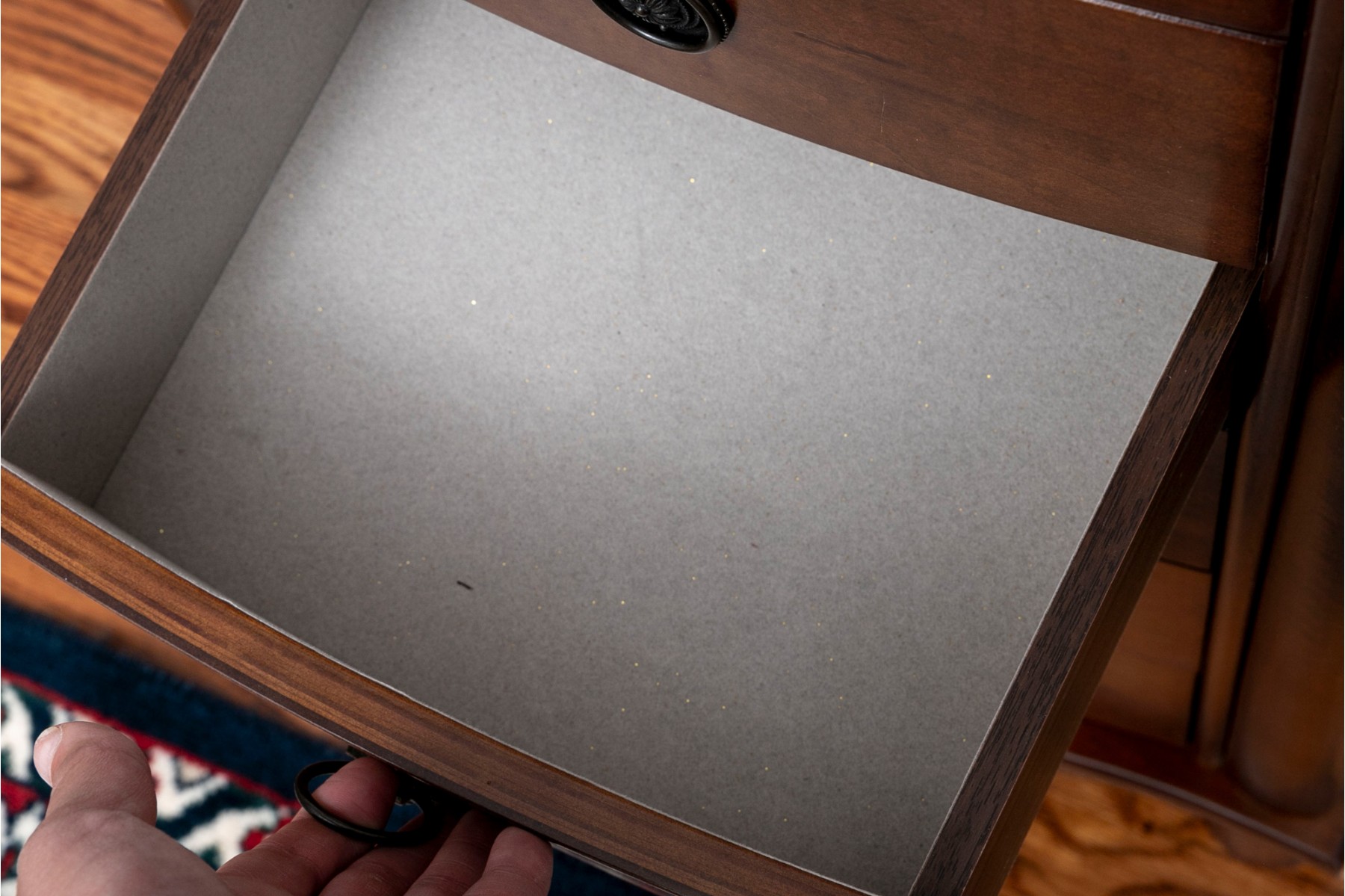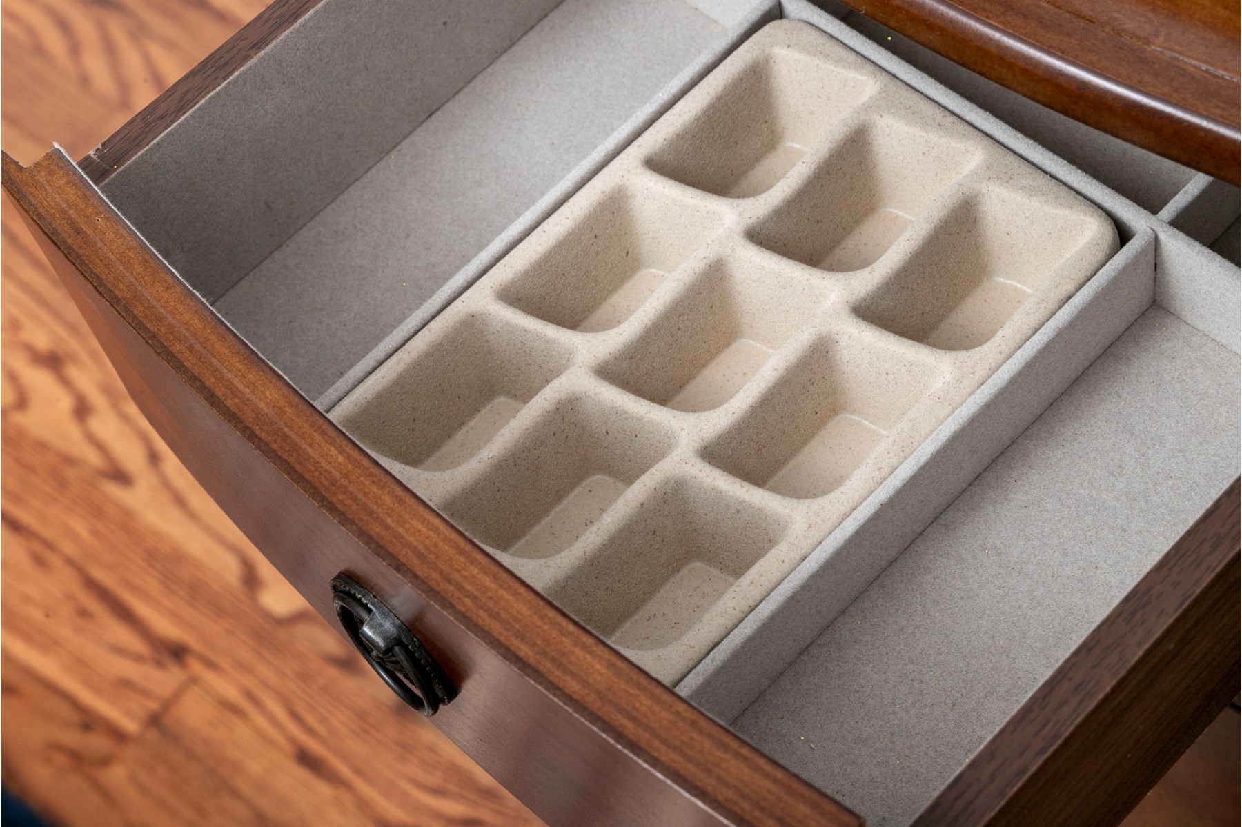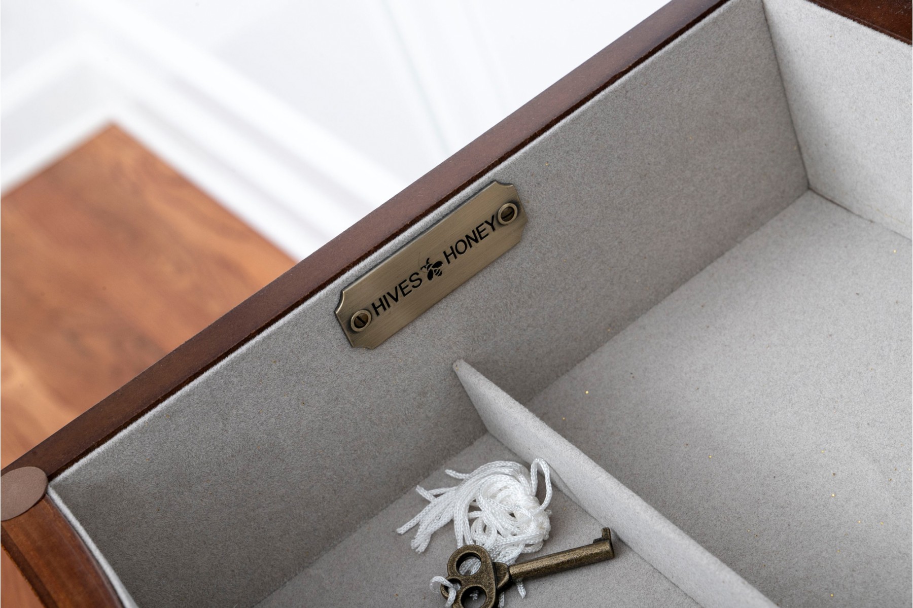 Hives and Honey contemporary jewelry armoire in traditional style, displaying a flip-top lid and side cabinets flanking seven drawers.