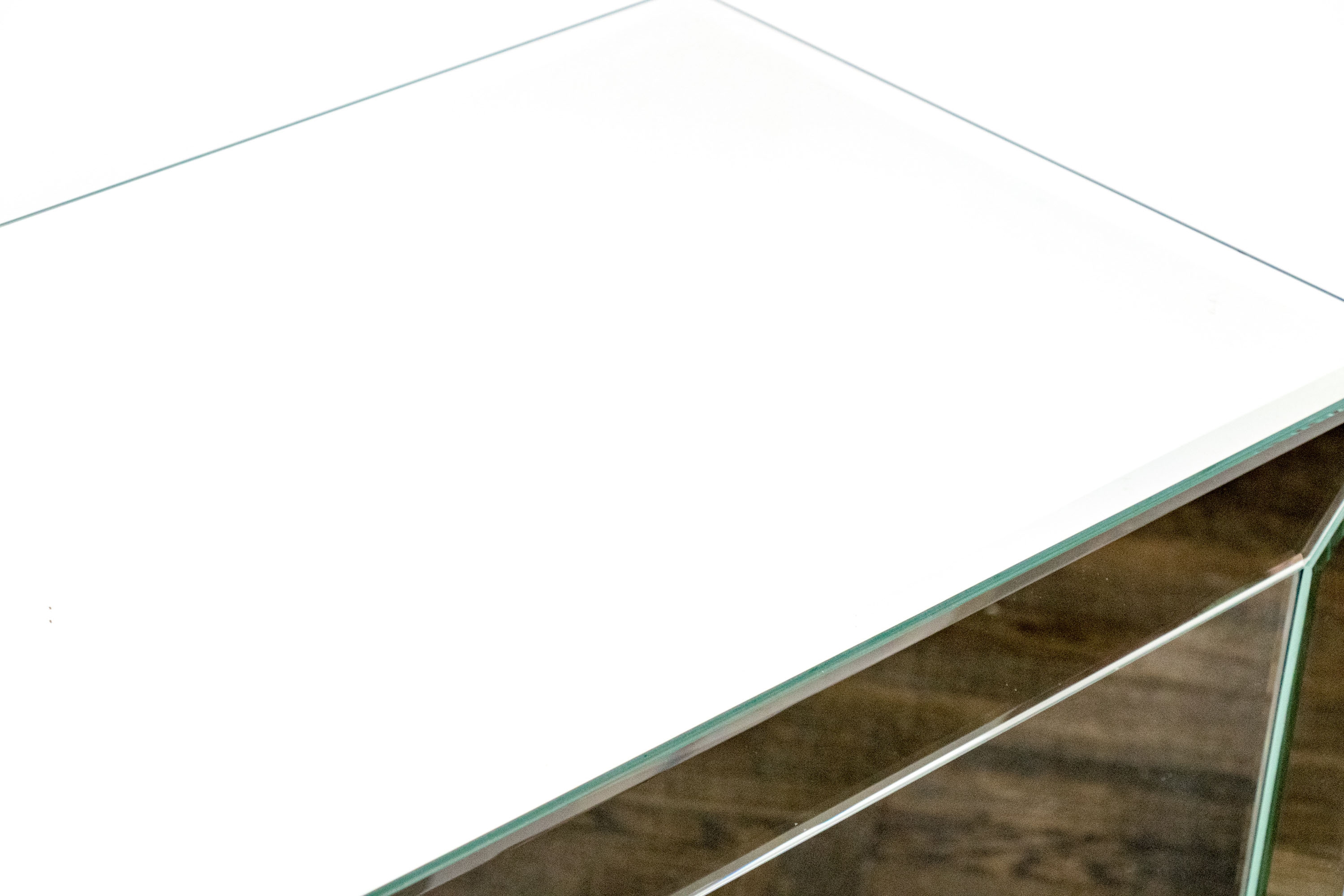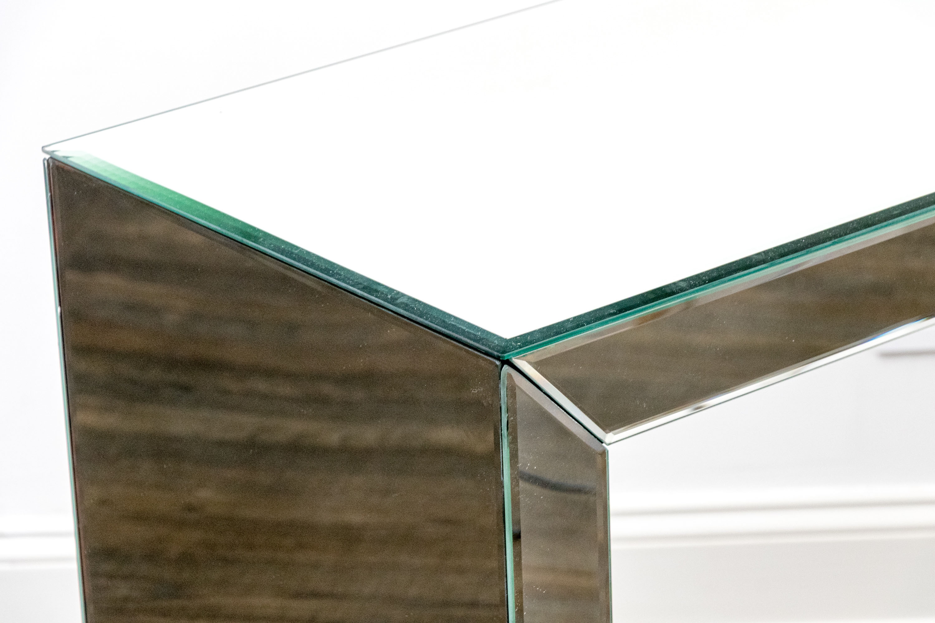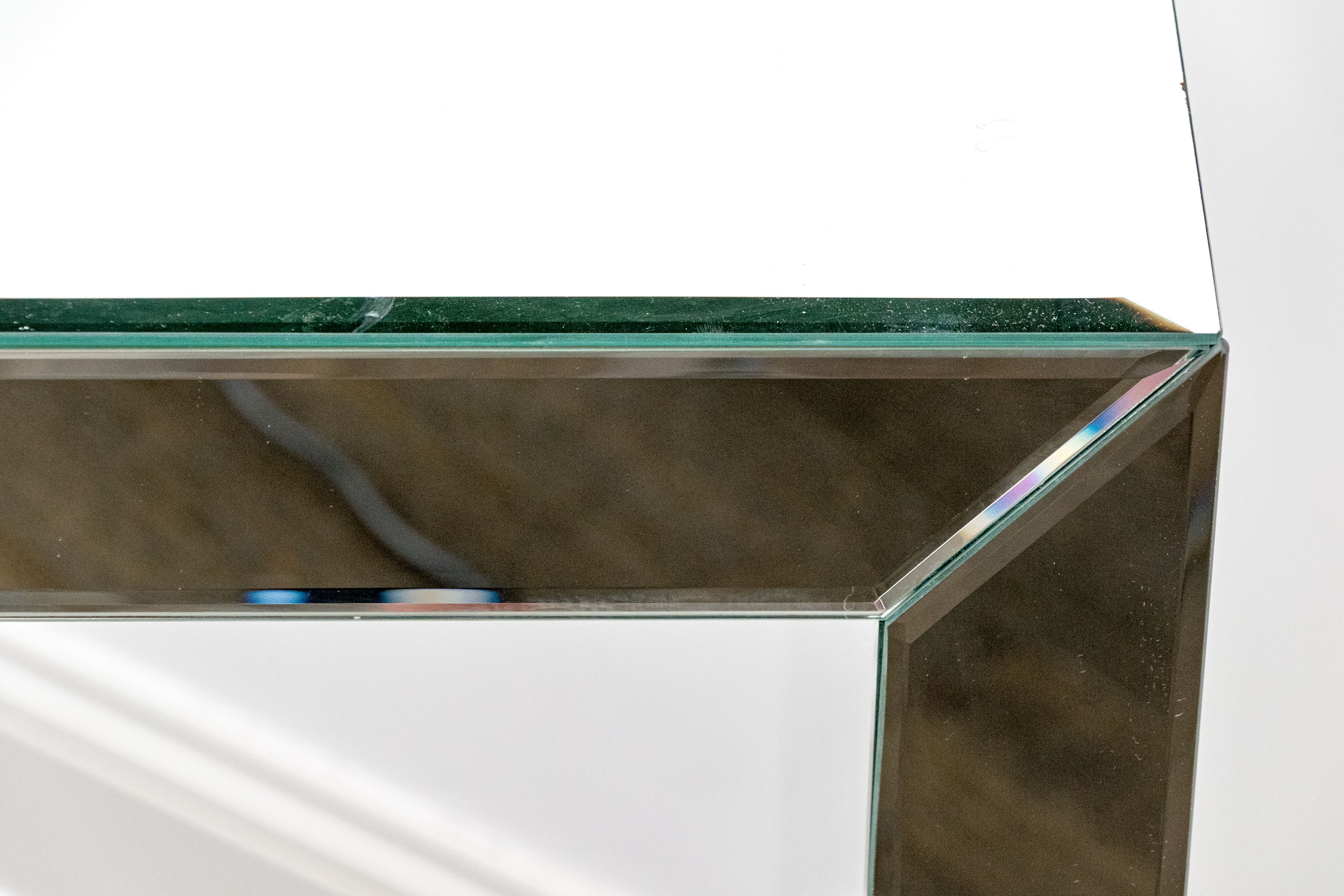Two ends with top. All surfaces of the table top have wonderful beveled mirrored panels. A chic desk with great Hollywood Regency appeal, designed with a sleek, minimalist rectangular profile finished with beveled mirror panels on all sides.