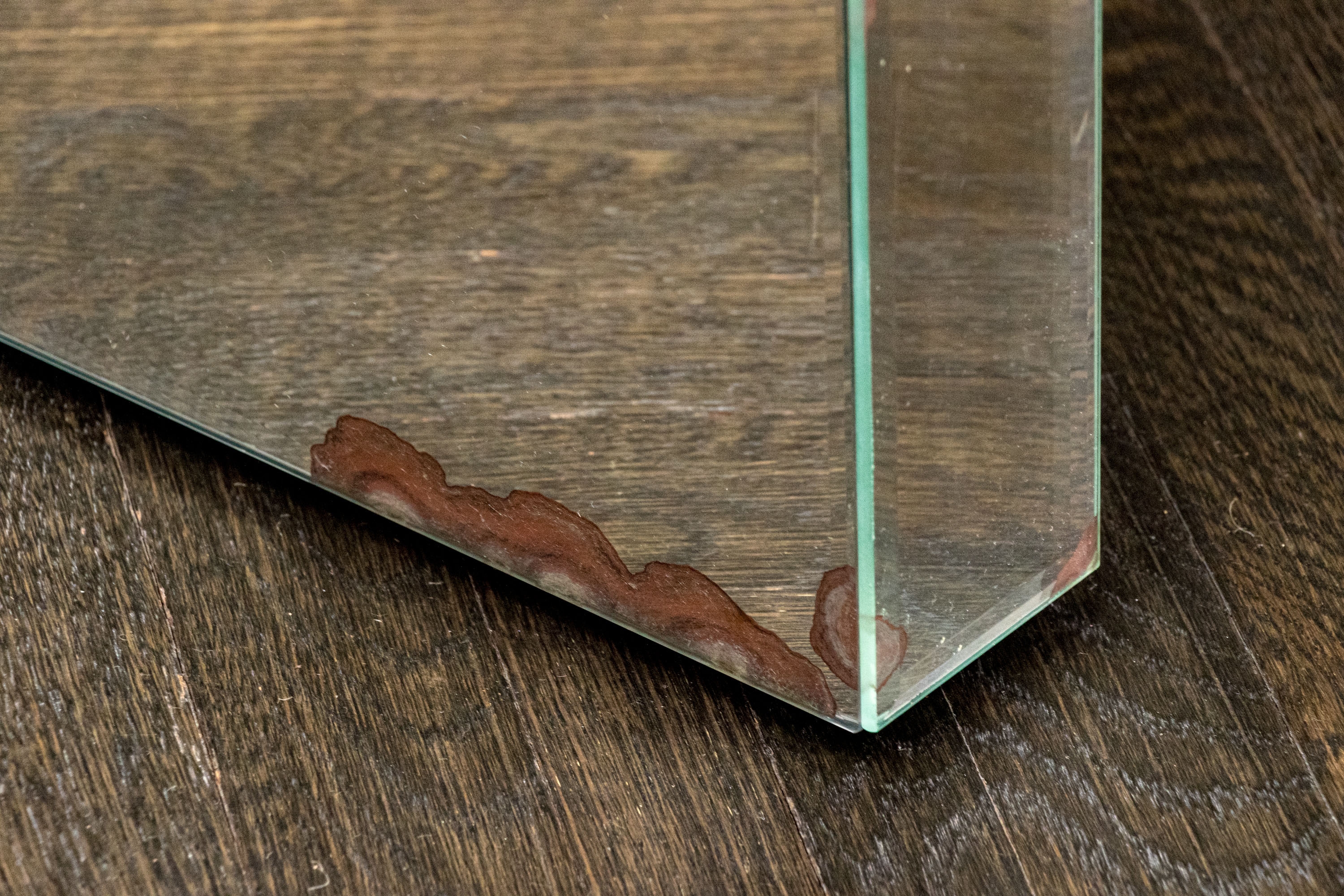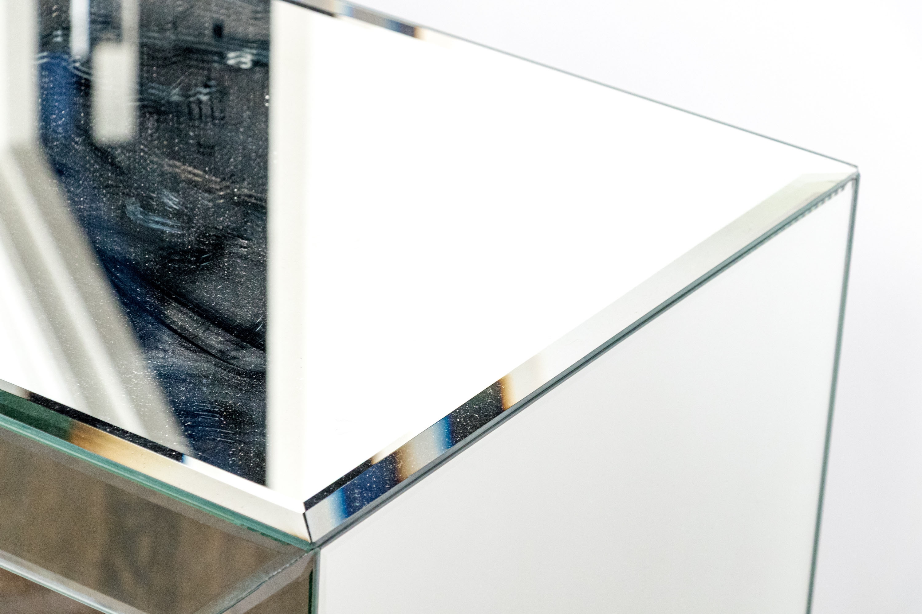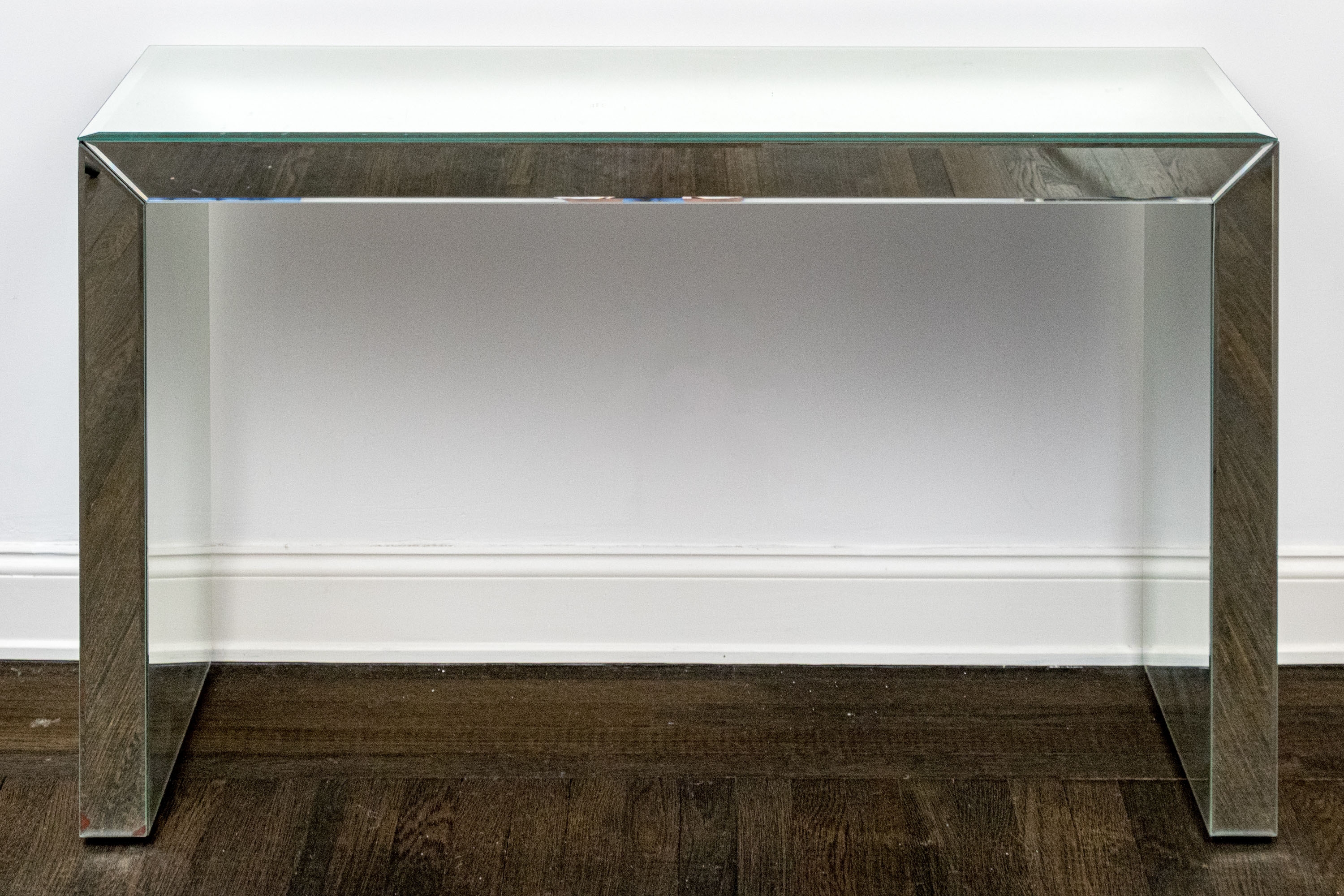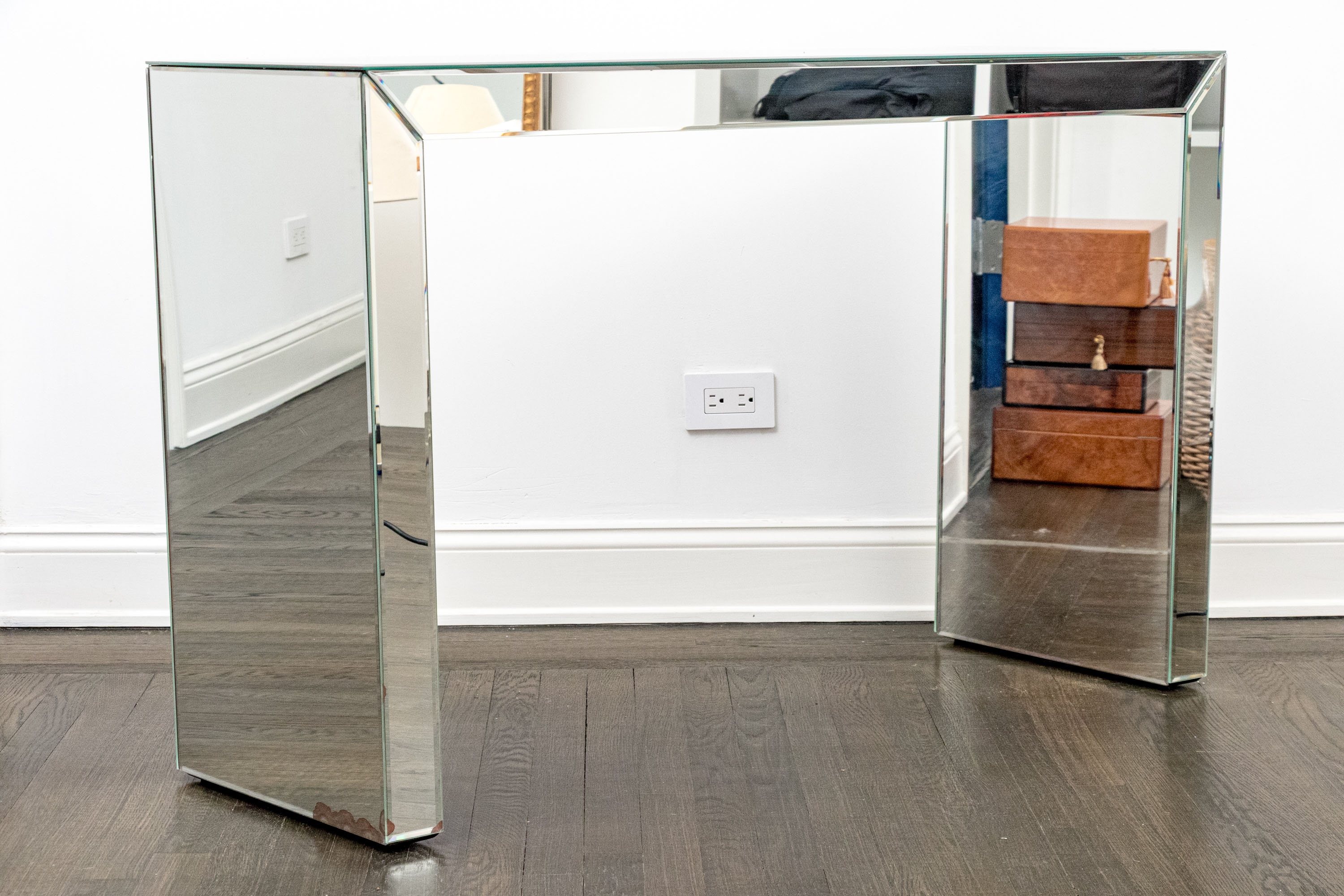 Two ends with top. All surfaces of the table top have wonderful beveled mirrored panels. A chic desk with great Hollywood Regency appeal, designed with a sleek, minimalist rectangular profile finished with beveled mirror panels on all sides.