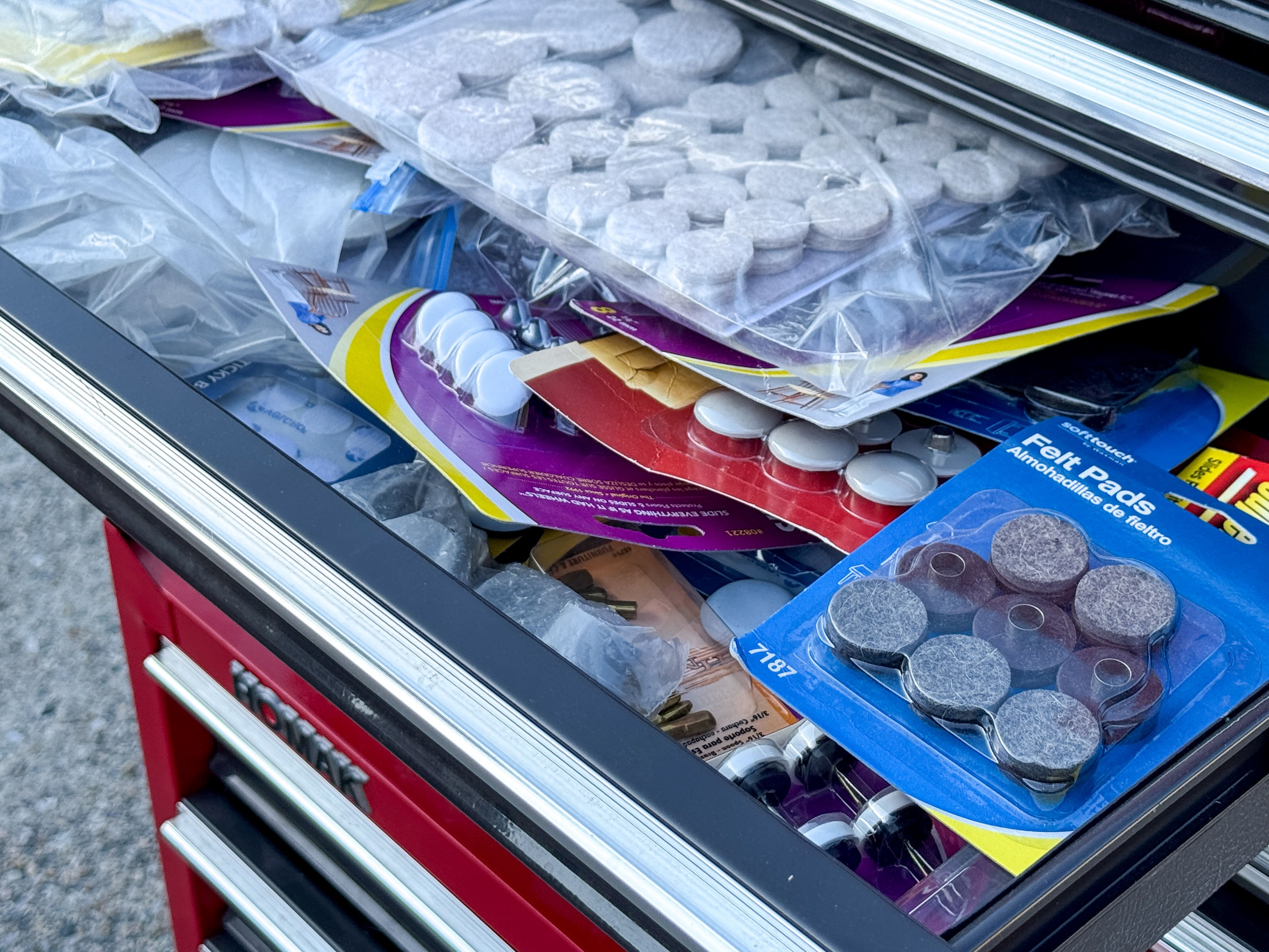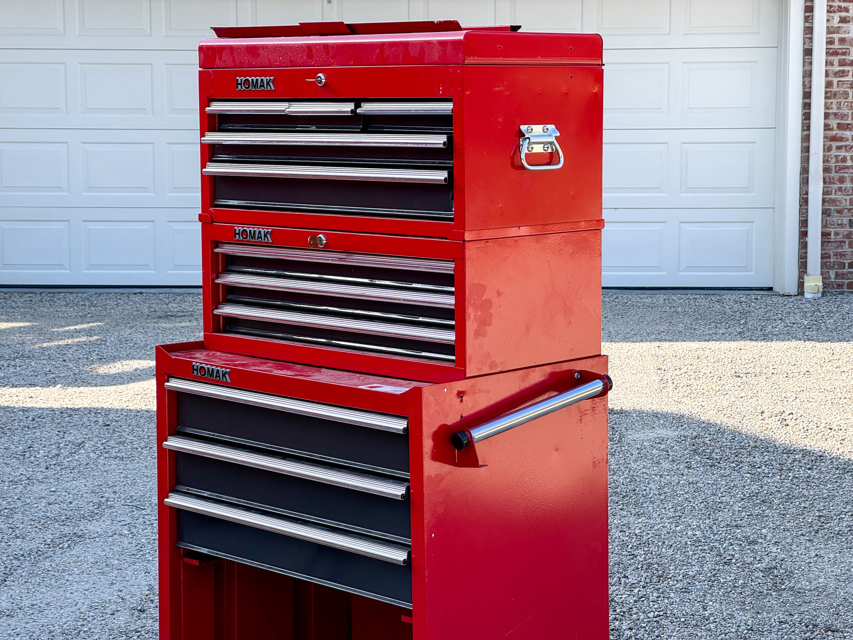 A wonderful Homak tool cabinet with a stacked hutch top and lower body with black drawers and sleek gray metal handles.