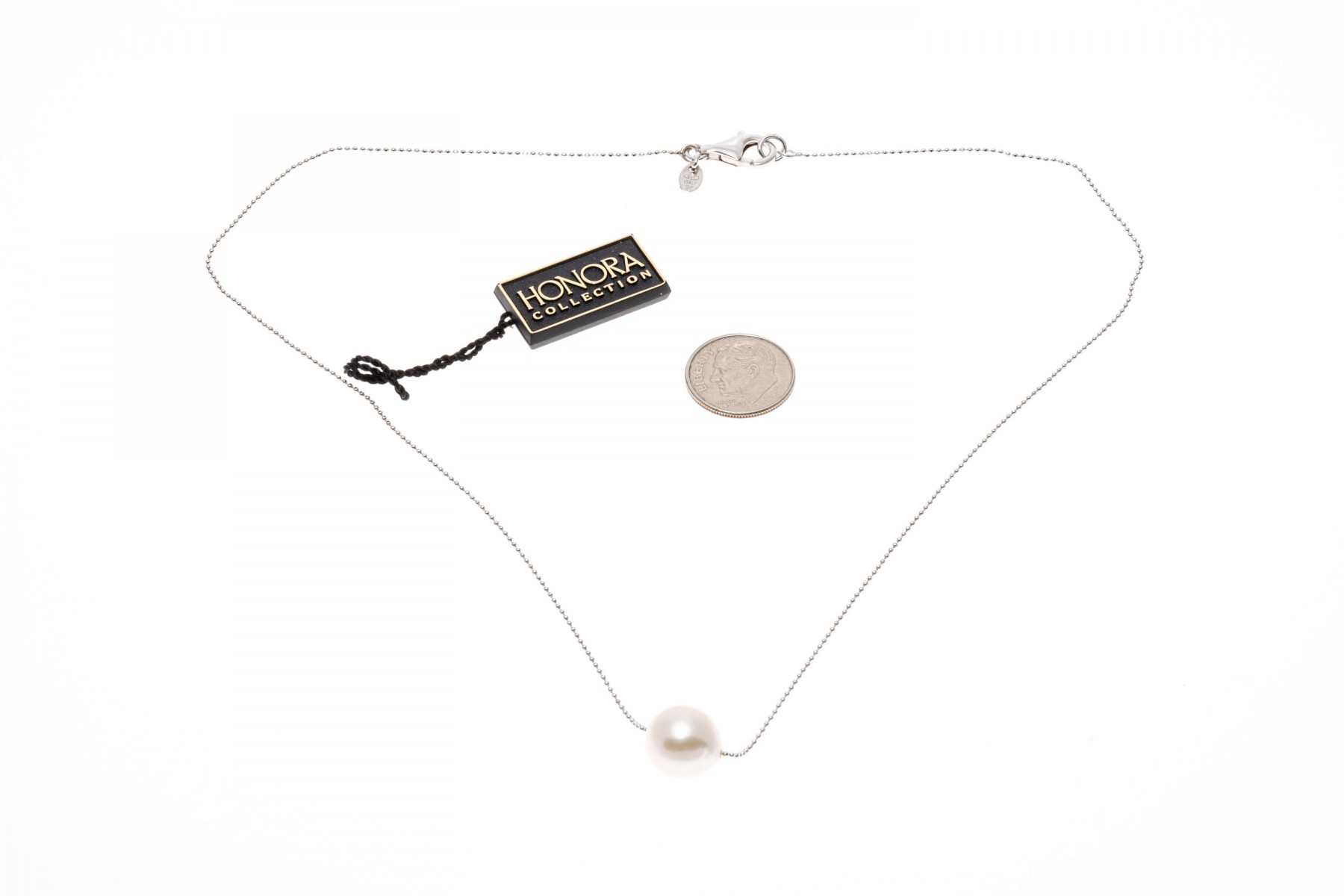 Cultured freshwater pearl necklace. This contemporary sterling silver necklace by Honora features a center 10.5 mm white cultured freshwater pearl center, displayed on a fine bead style chain and finished with a lobster claw style clasp. Accompanied by the box.
