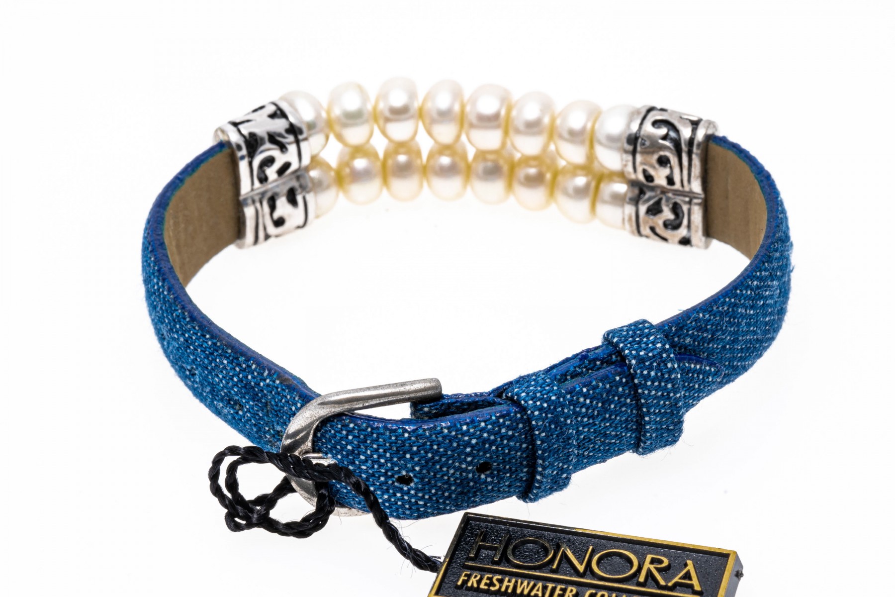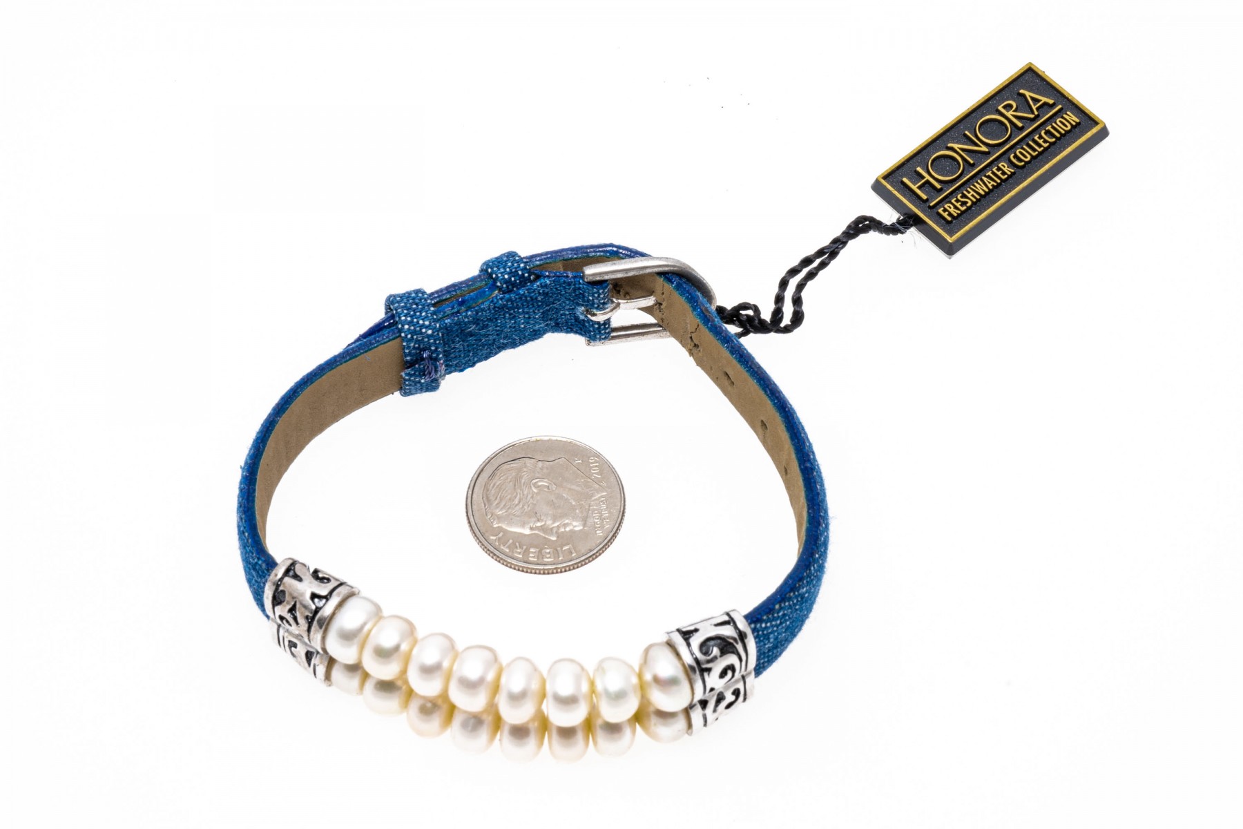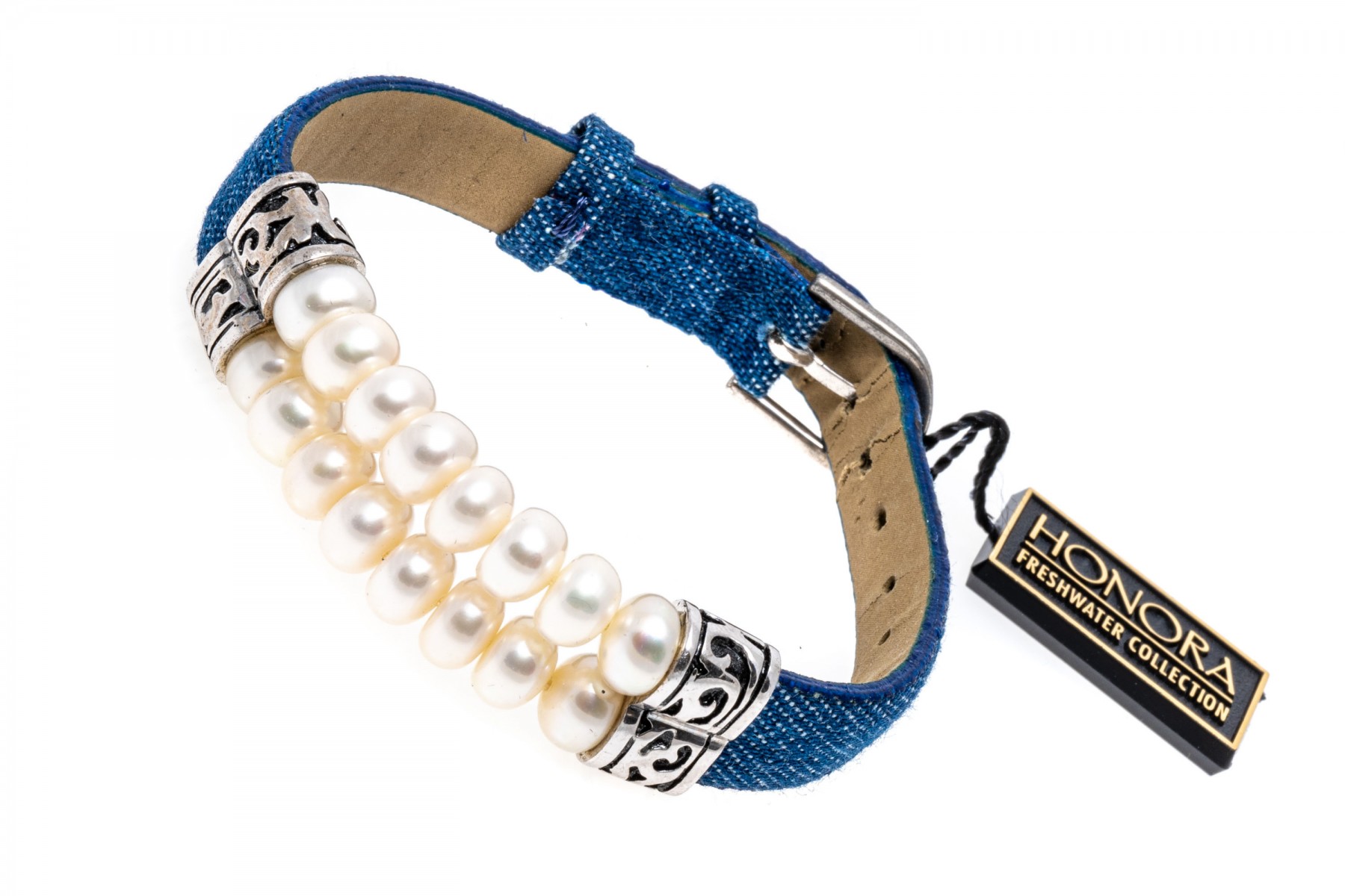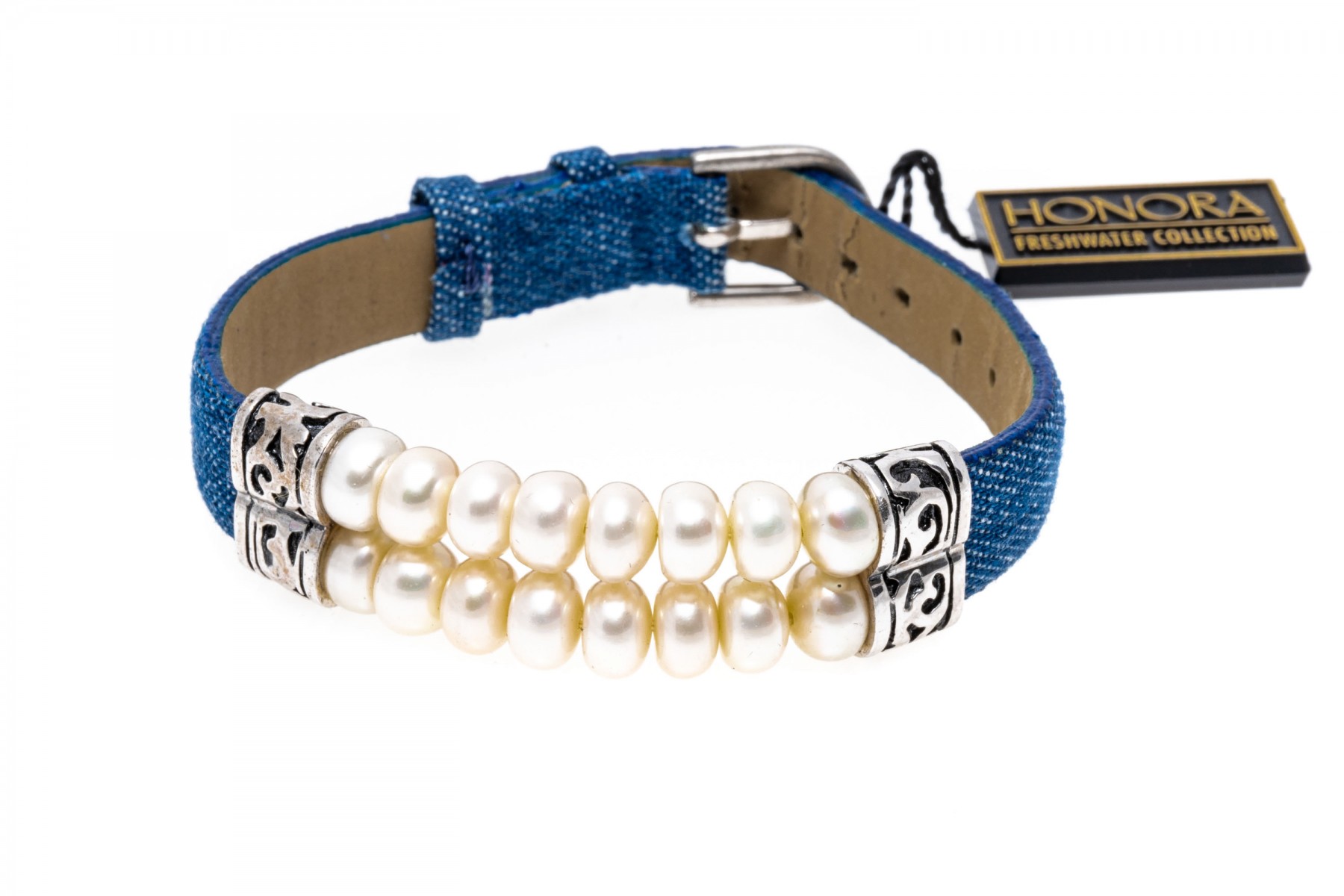 Cultured freshwater pearl bracelet. This fun bracelet by Honora features a center double row of white, cultured freshwater pearls, flanked by sterling silver scrolled patterned spacers, and finished by a denim strap with a base metal ardillon (tang) style strap. Accompanied by the box.