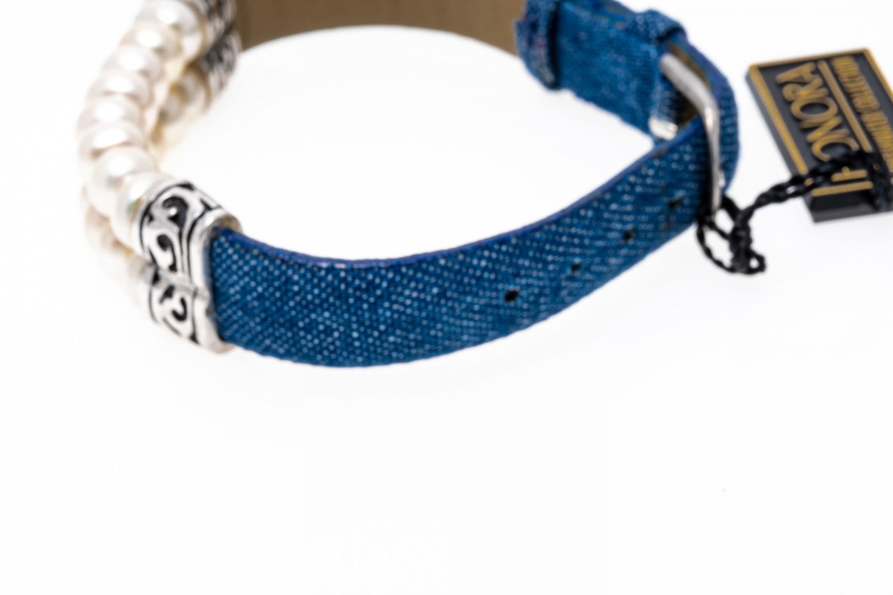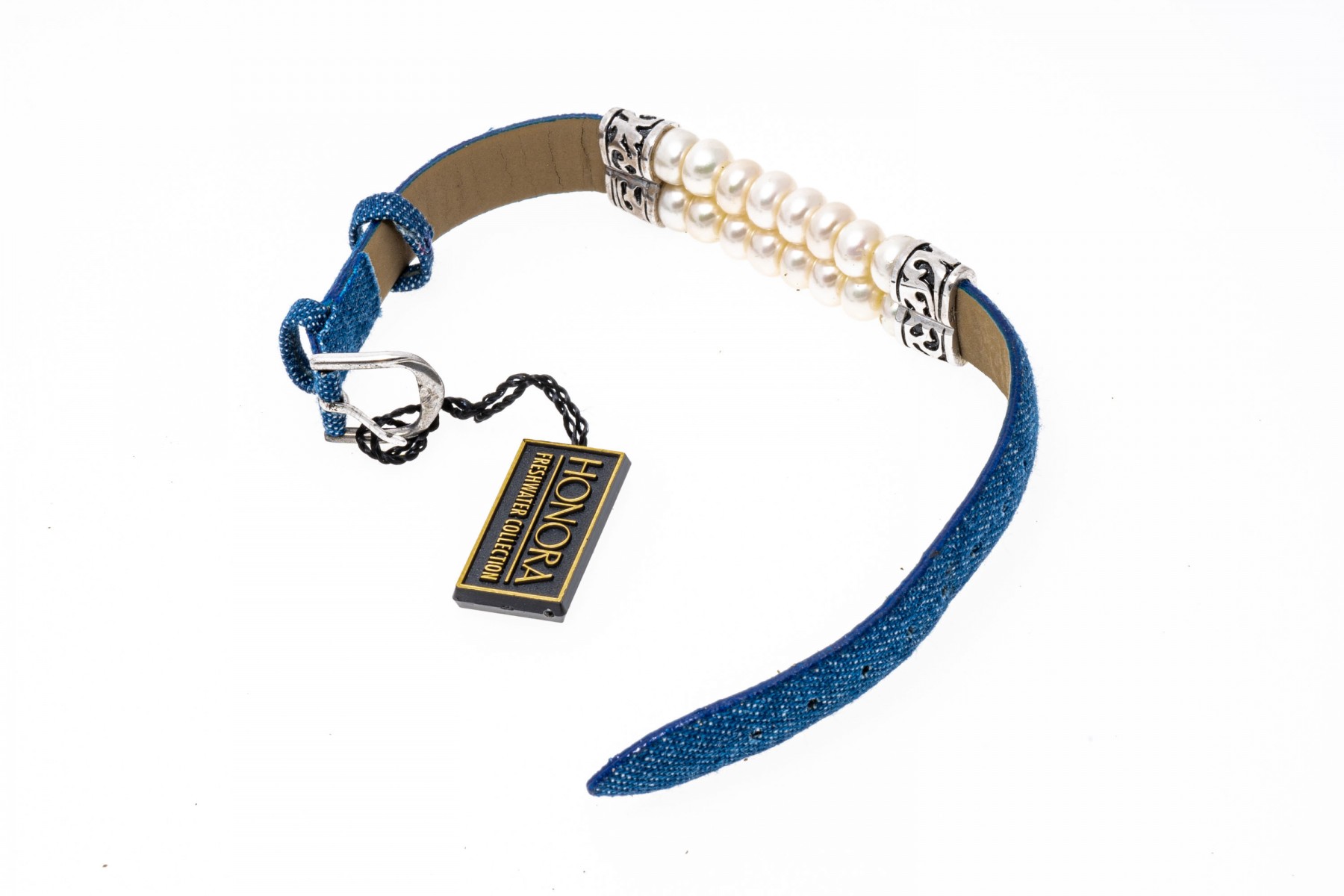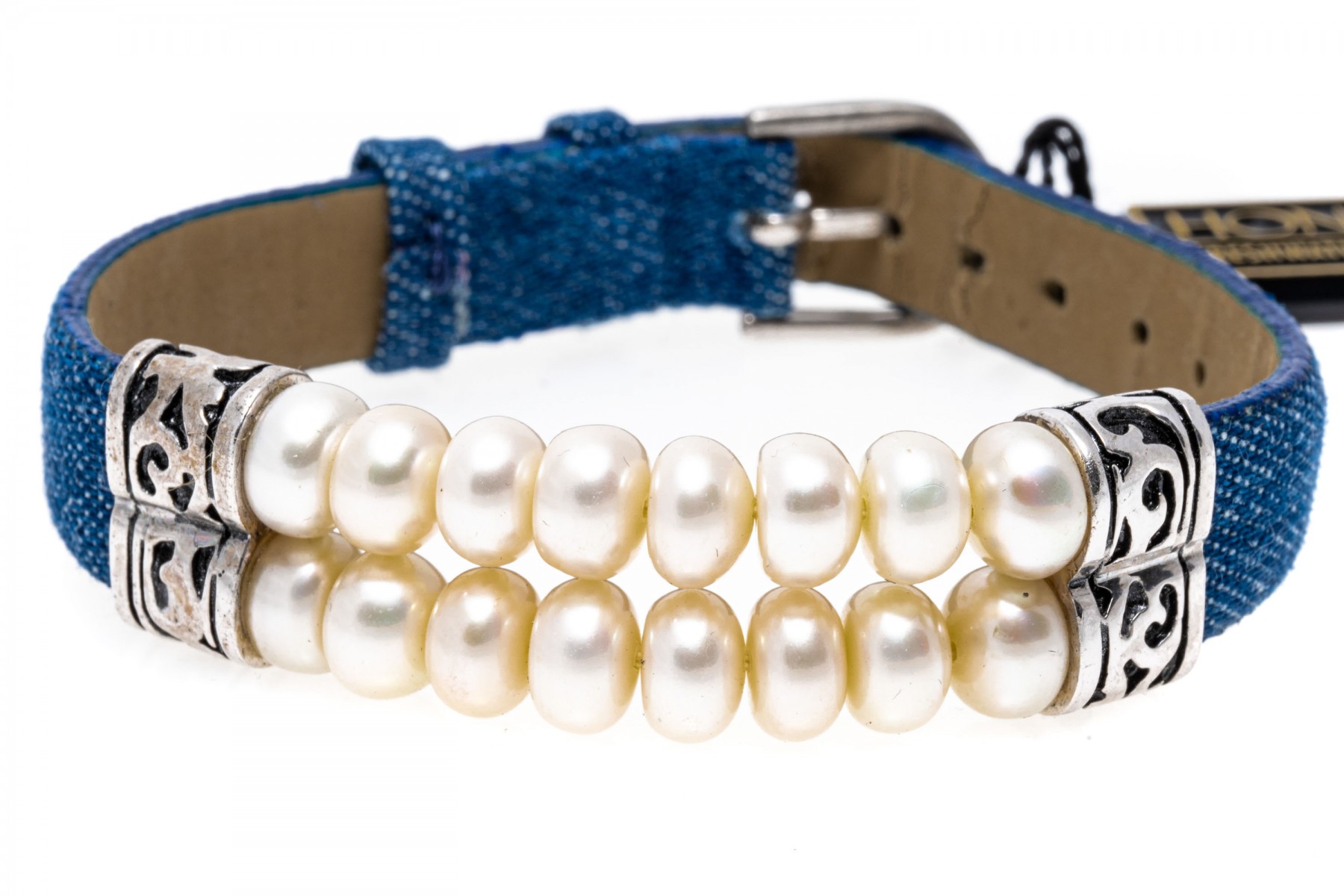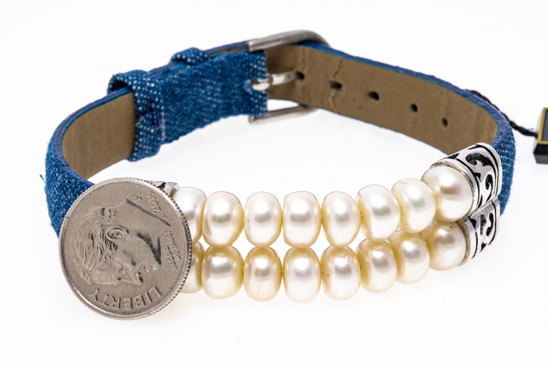 Cultured freshwater pearl bracelet. This fun bracelet by Honora features a center double row of white, cultured freshwater pearls, flanked by sterling silver scrolled patterned spacers, and finished by a denim strap with a base metal ardillon (tang) style strap. Accompanied by the box.