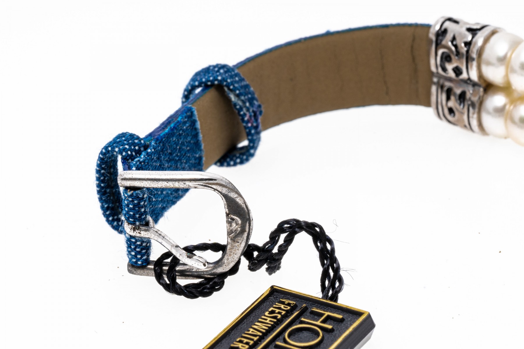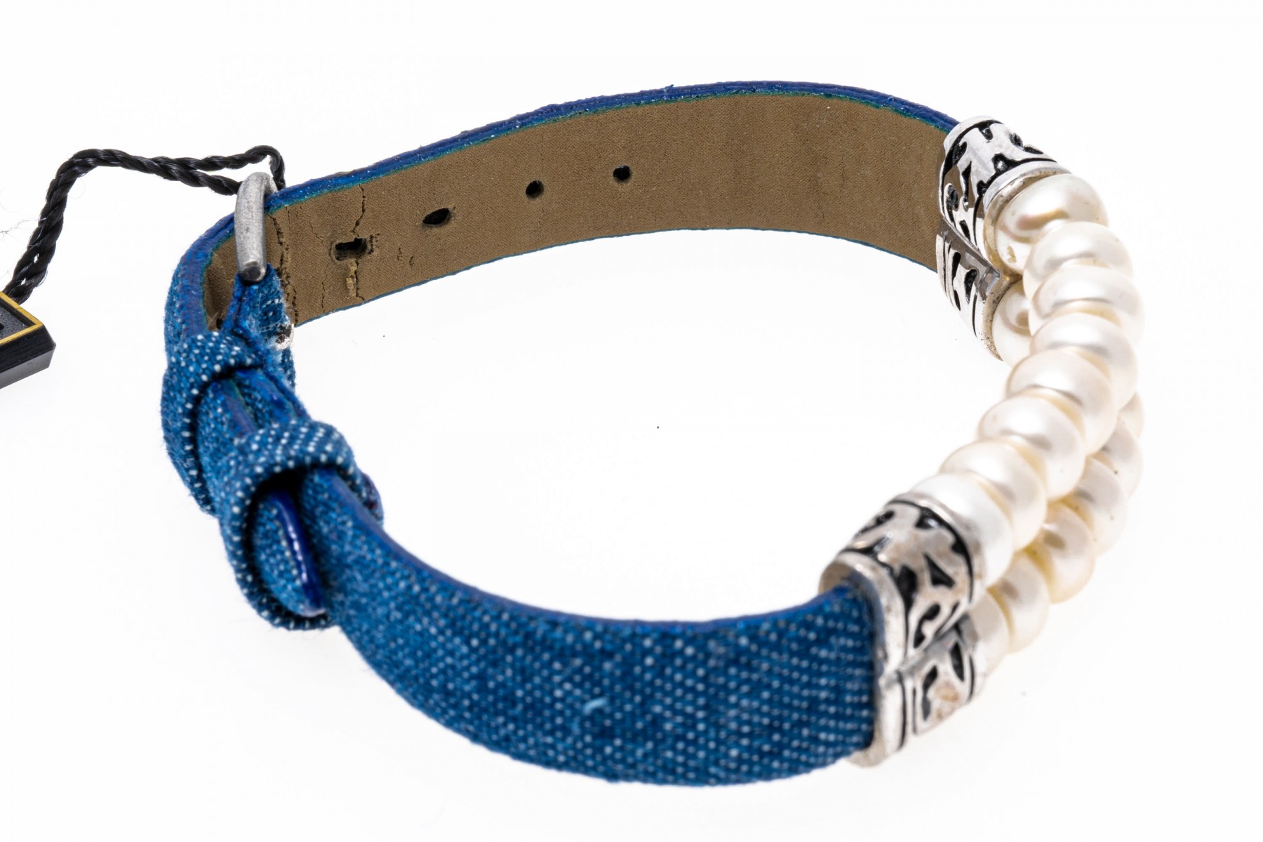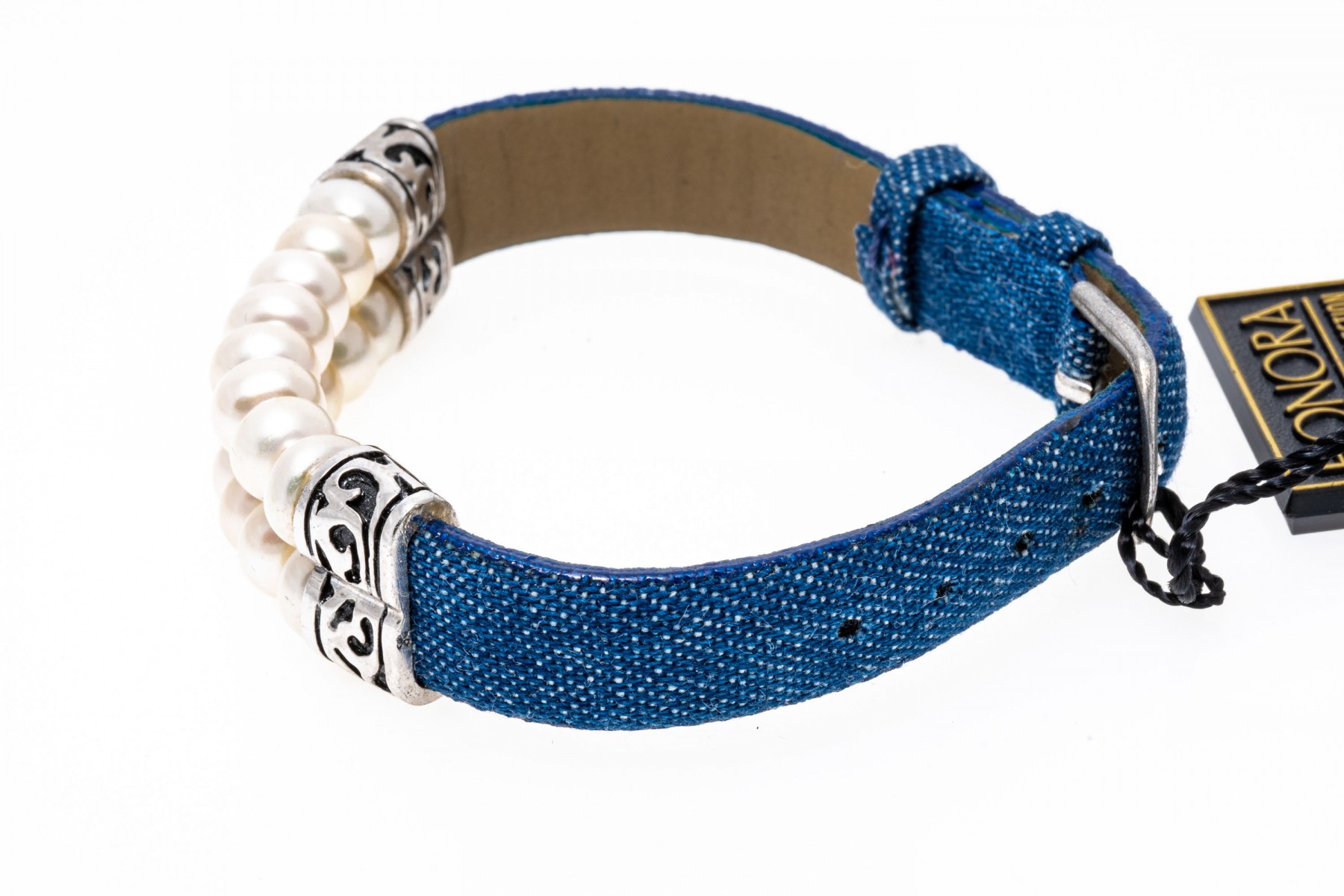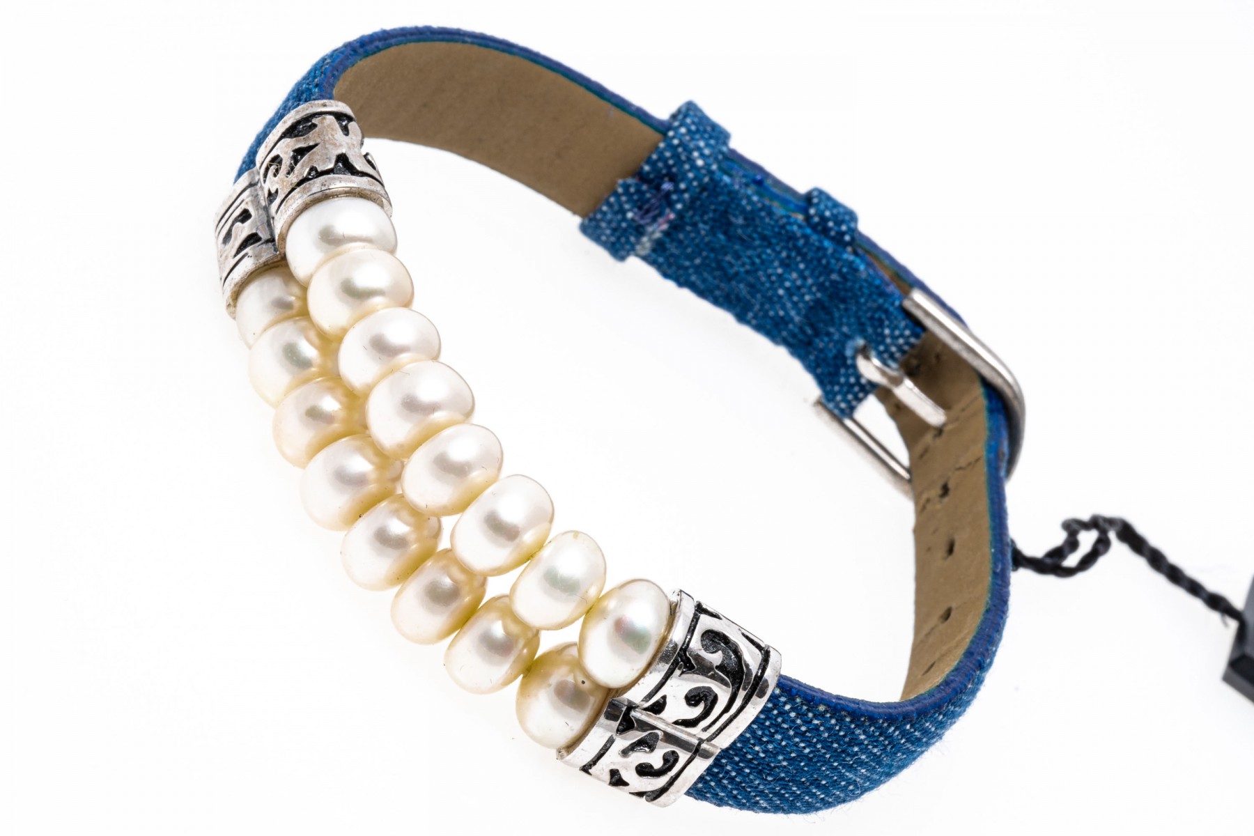 Cultured freshwater pearl bracelet. This fun bracelet by Honora features a center double row of white, cultured freshwater pearls, flanked by sterling silver scrolled patterned spacers, and finished by a denim strap with a base metal ardillon (tang) style strap. Accompanied by the box.