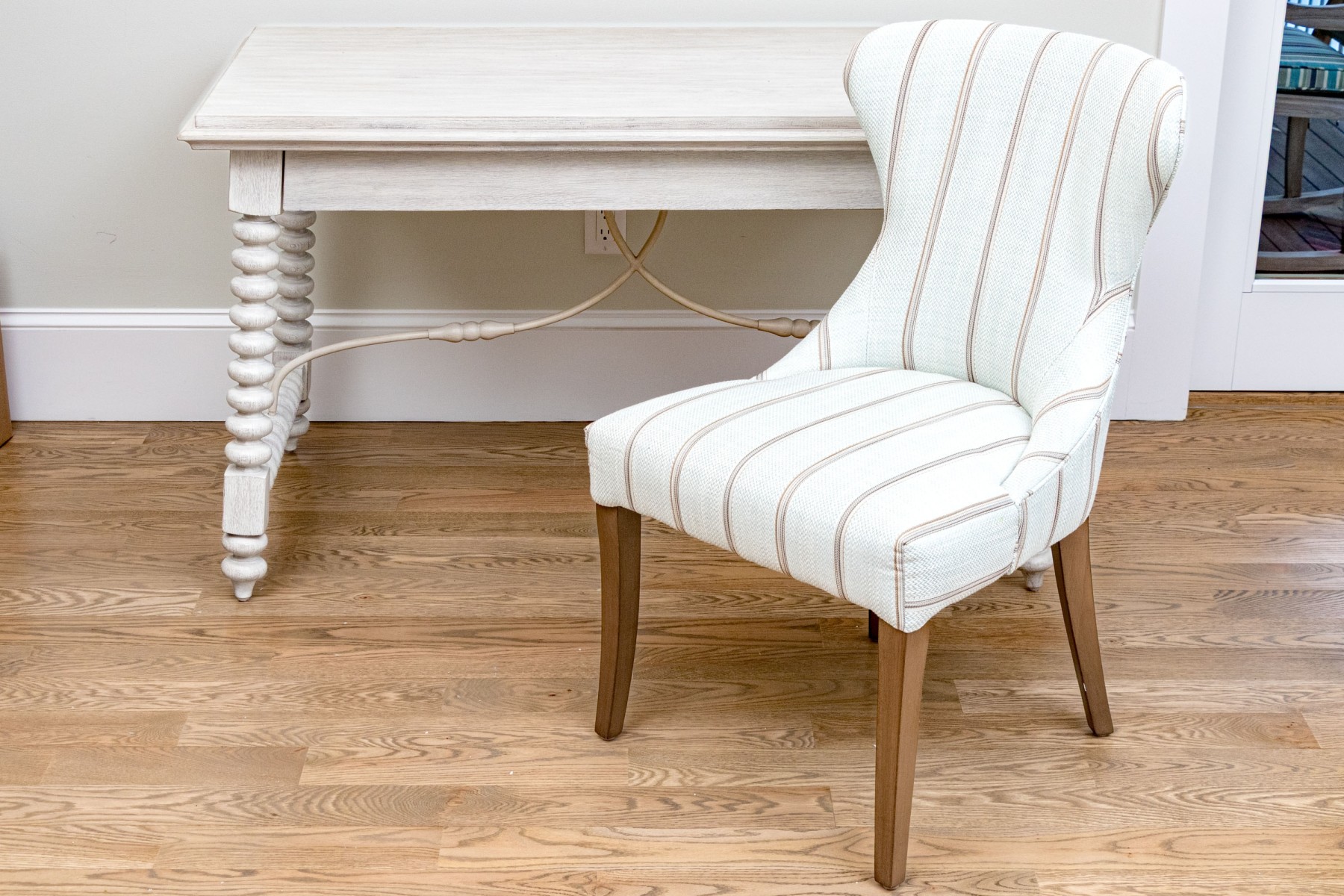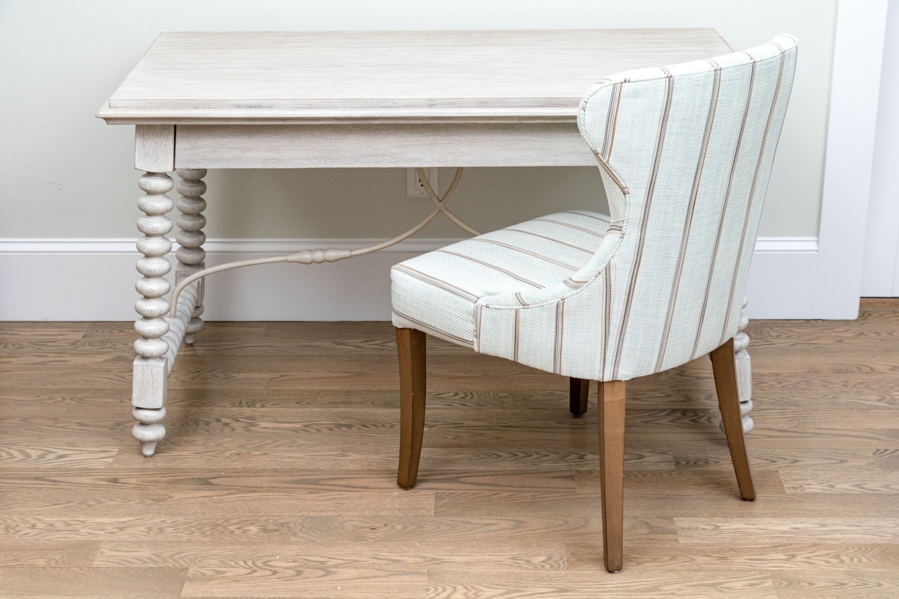 A fabulous duo of office furniture comprised of a charming Hooker Furniture desk painted rustic white and supported by bobbin turned legs. The writing desk has a single drawer.