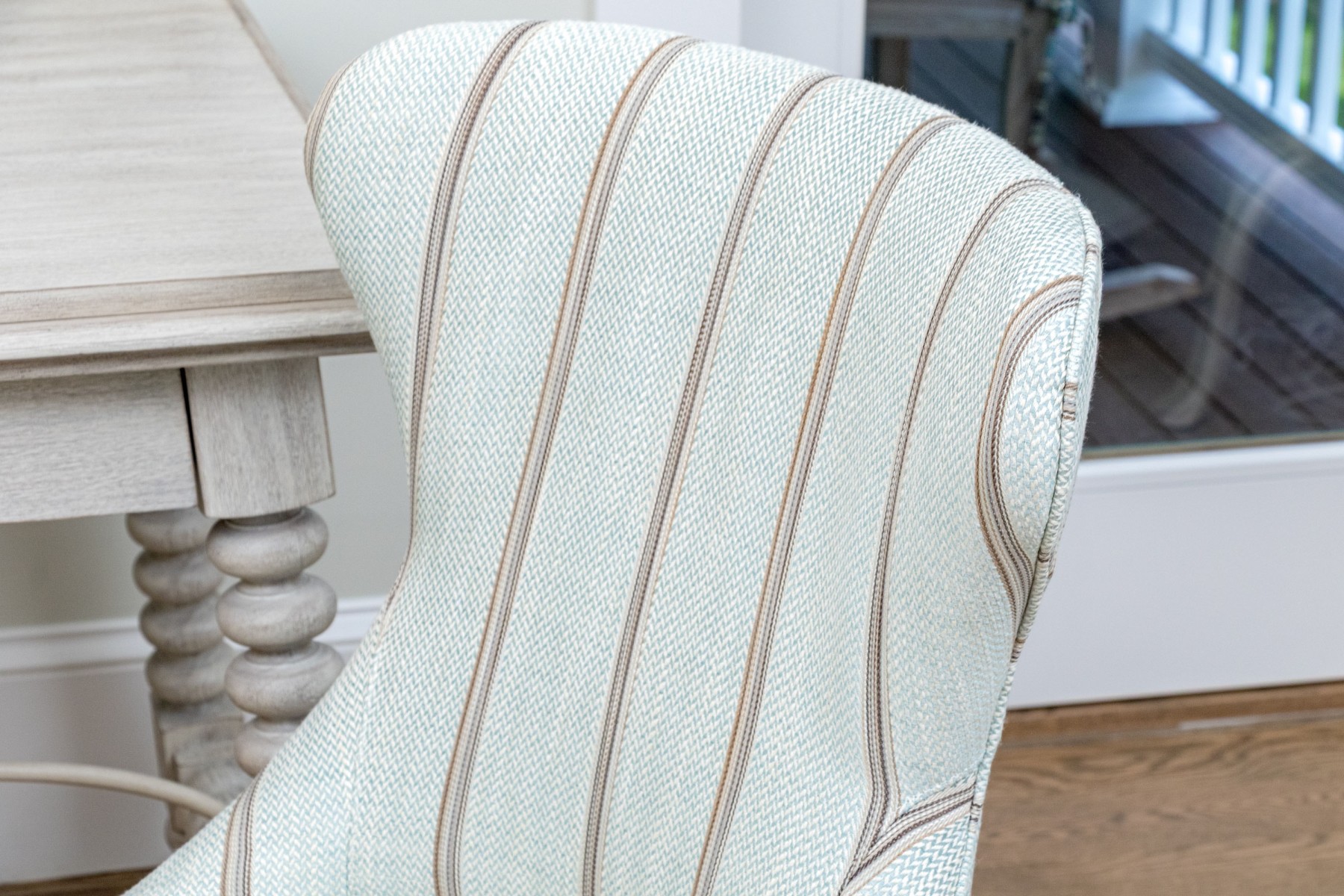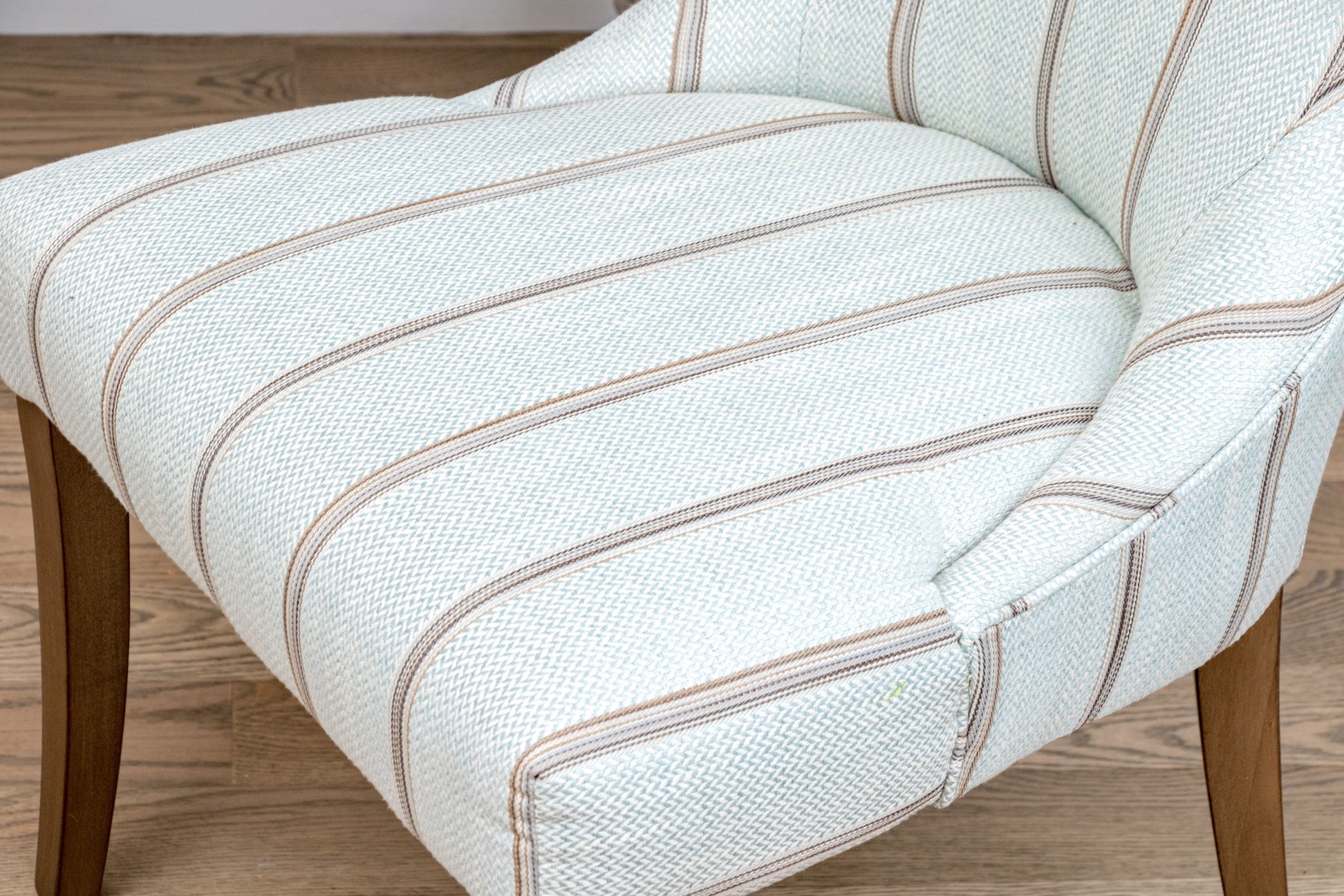 Accompanied by a handsome upholstered wing chair which is supported upon two front square, tapered legs and two back saber form legs. The chair has an upholstered seat and seat back with nice striped pattern upholstery.