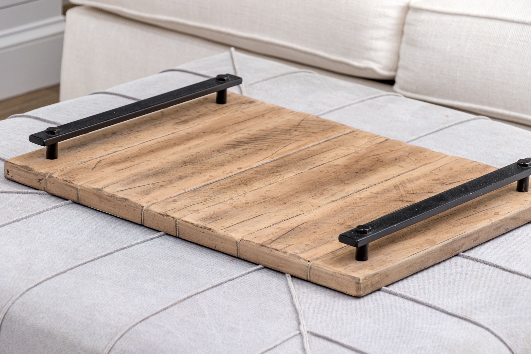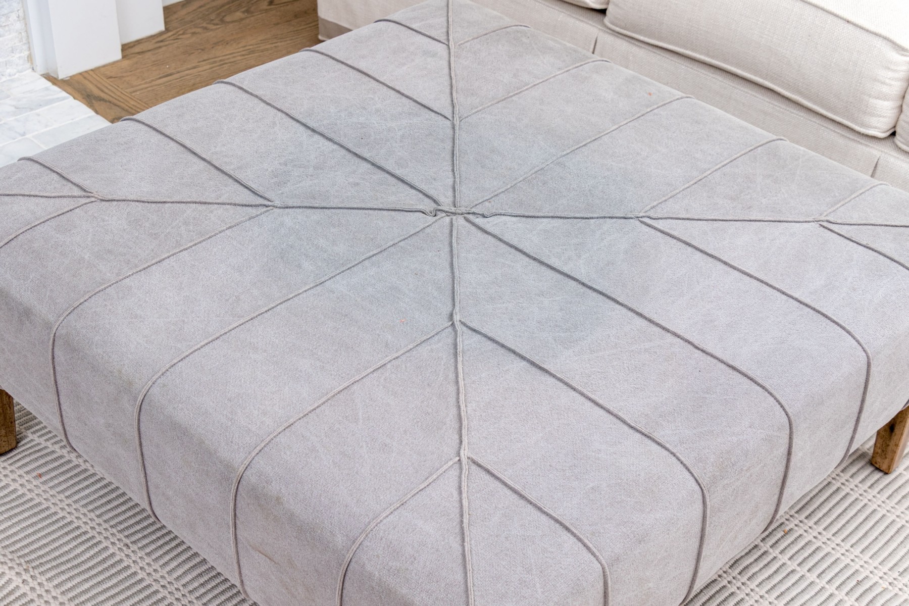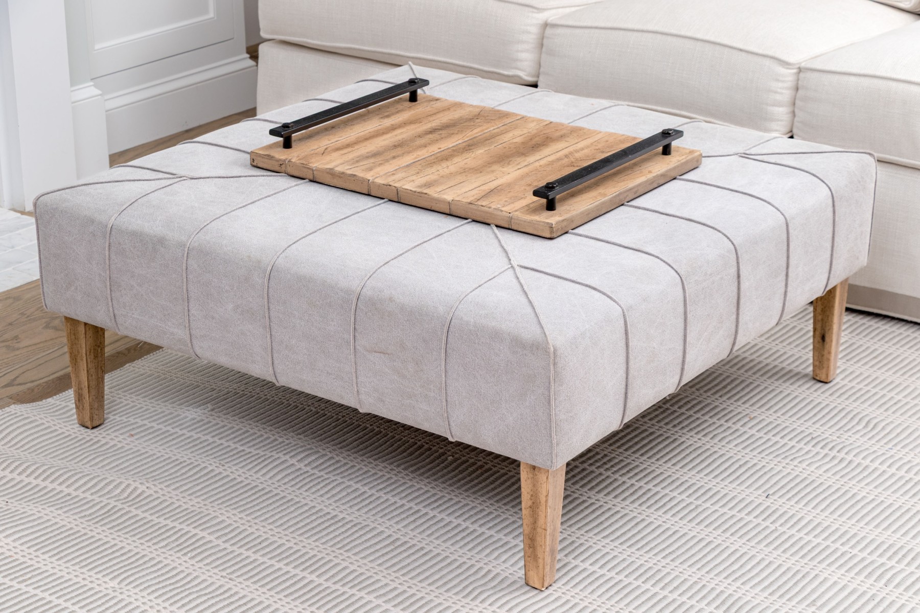 A wonderful Hooker Furniture American Life Urban Elevation Collection upholstered coffee table or oversized ottoman featuring a light gray upholstered square top with eye-catching raised seams creating leaf-like veining across. Raised on honeyed brown straight, tapered legs that compliment the accompanying tray perfectly. The tray sports a planked design with great farmhouse appeal, finished with industrial chic black twin handles.