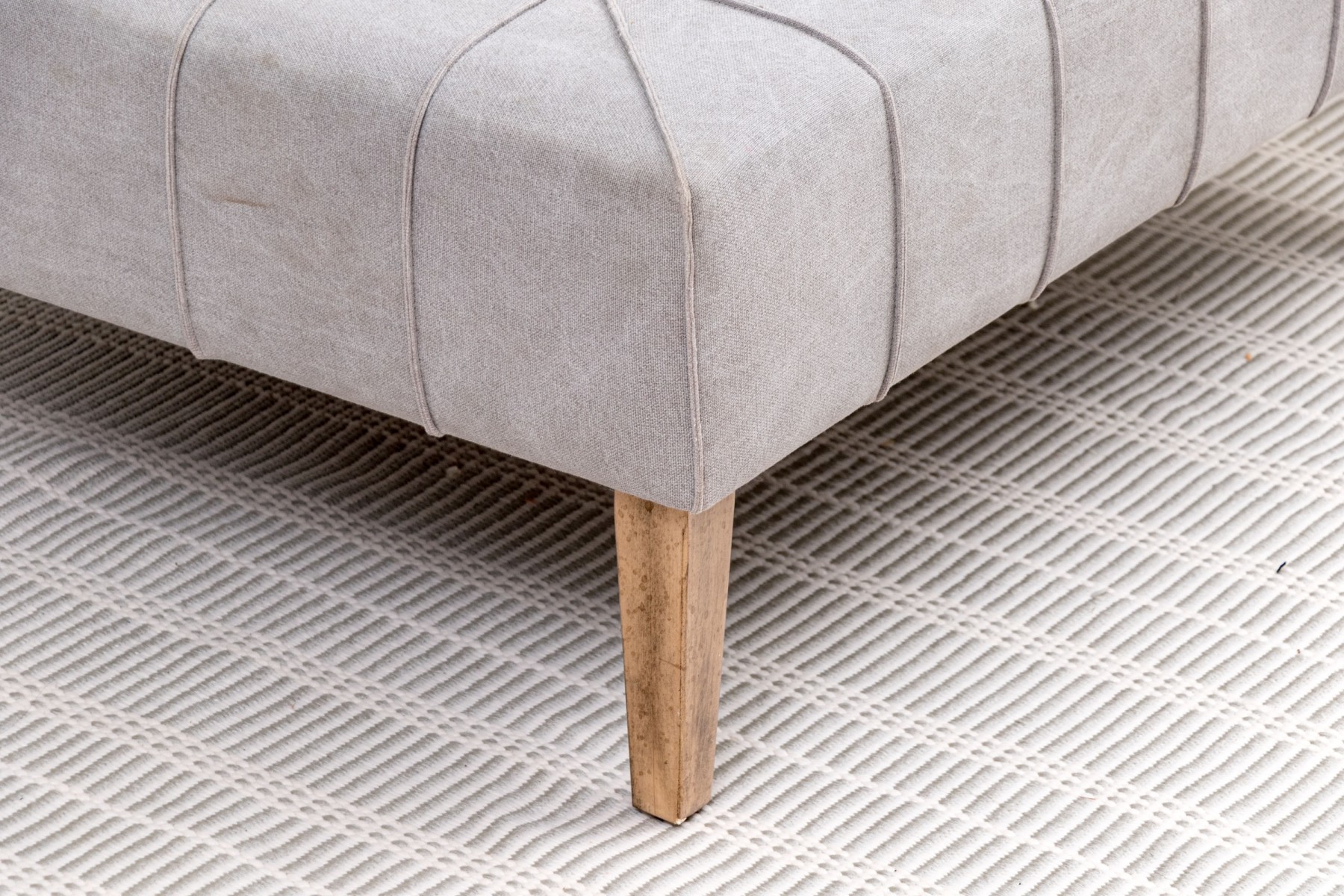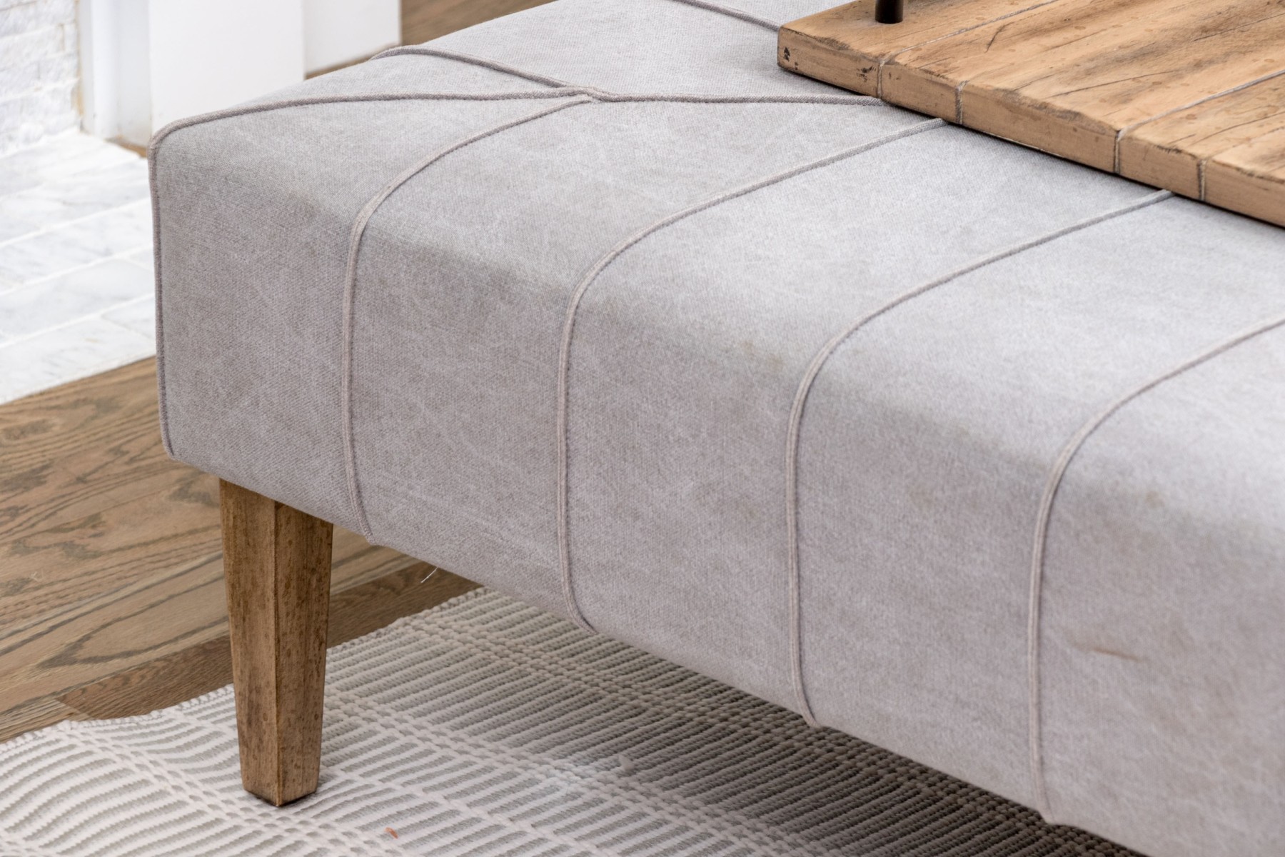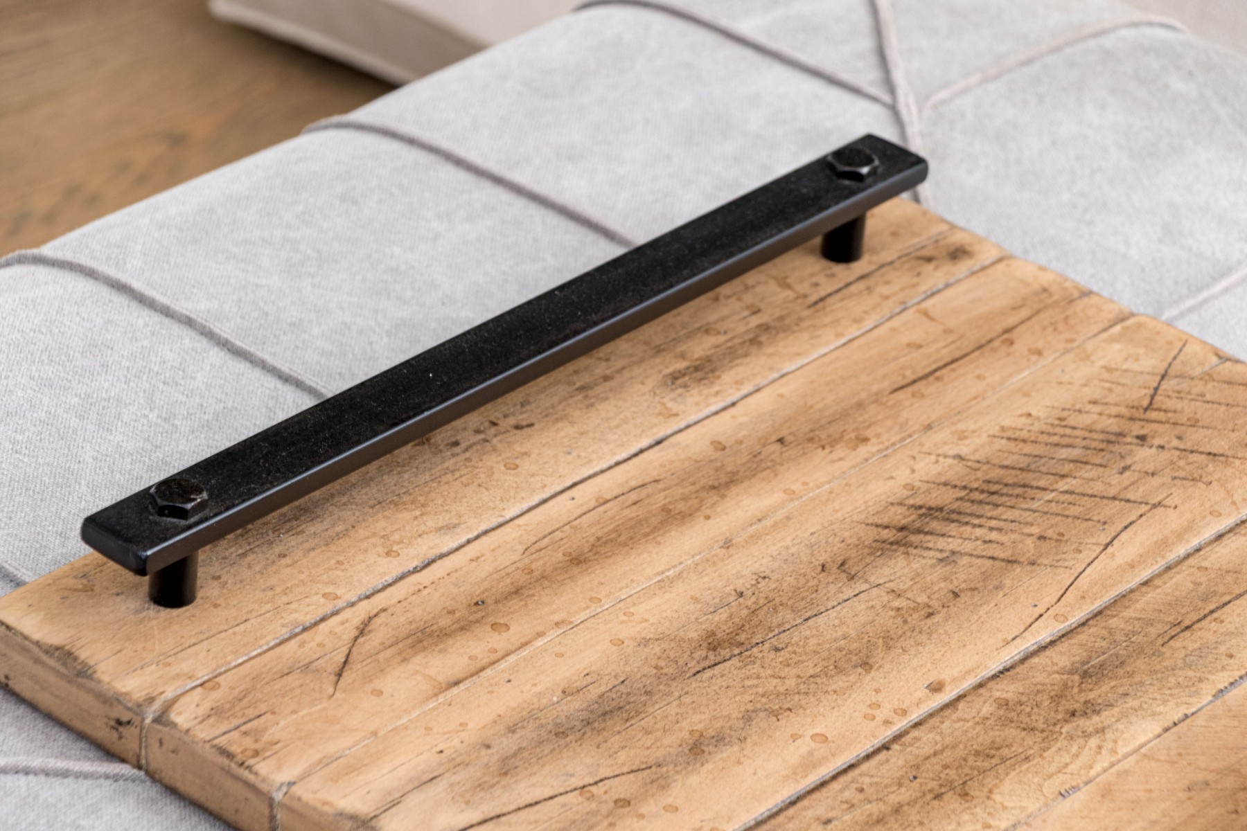 A wonderful Hooker Furniture American Life Urban Elevation Collection upholstered coffee table or oversized ottoman featuring a light gray upholstered square top with eye-catching raised seams creating leaf-like veining across. Raised on honeyed brown straight, tapered legs that compliment the accompanying tray perfectly. The tray sports a planked design with great farmhouse appeal, finished with industrial chic black twin handles.