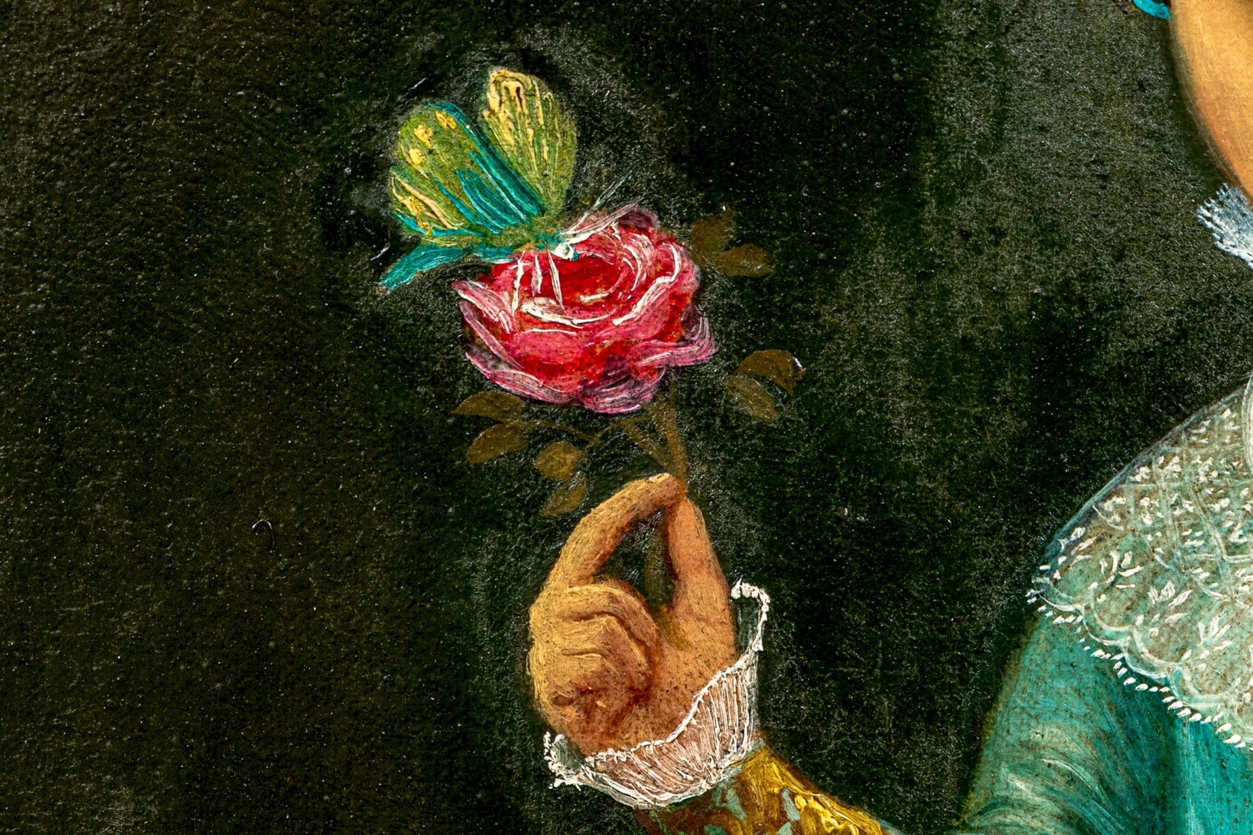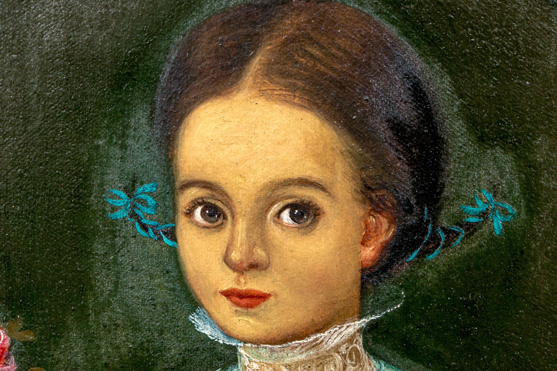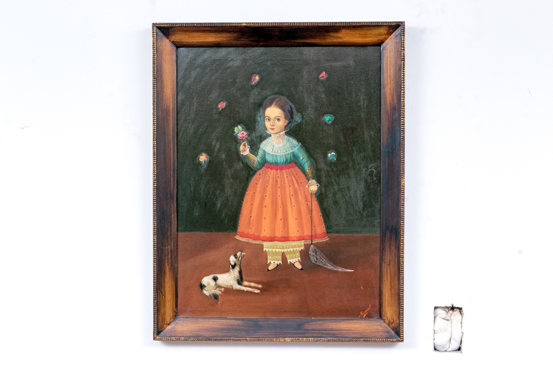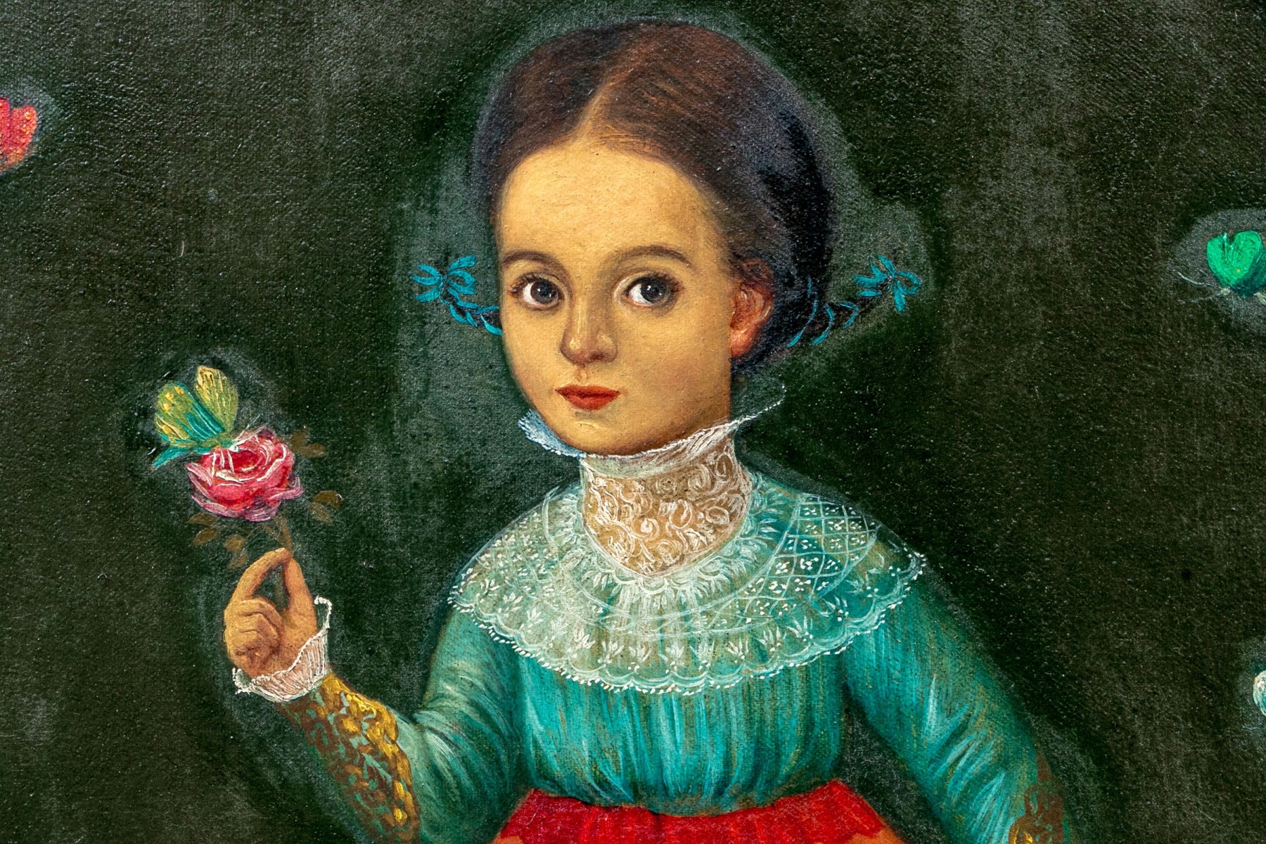 Horacio Rentería Rocha (Mexican, 1912-1972) oil painting on panel depicting a well dress girl in a lace high collar, blue blouse, and orange patterned skirt with yellow pants beneath, holding a net and a magenta rose while surrounded by colorful butterflies. The girl stands next to a small recumbent black and white dog, standing on a red-brown ground against a black background. Signed lower right.