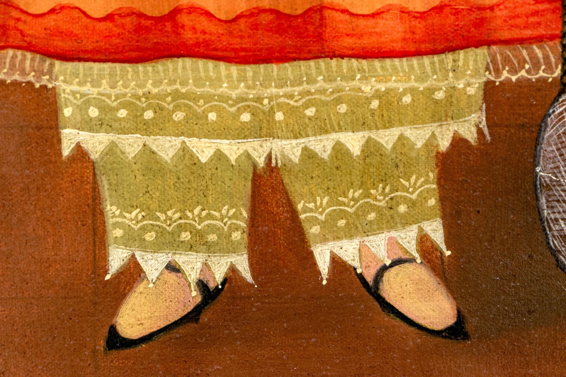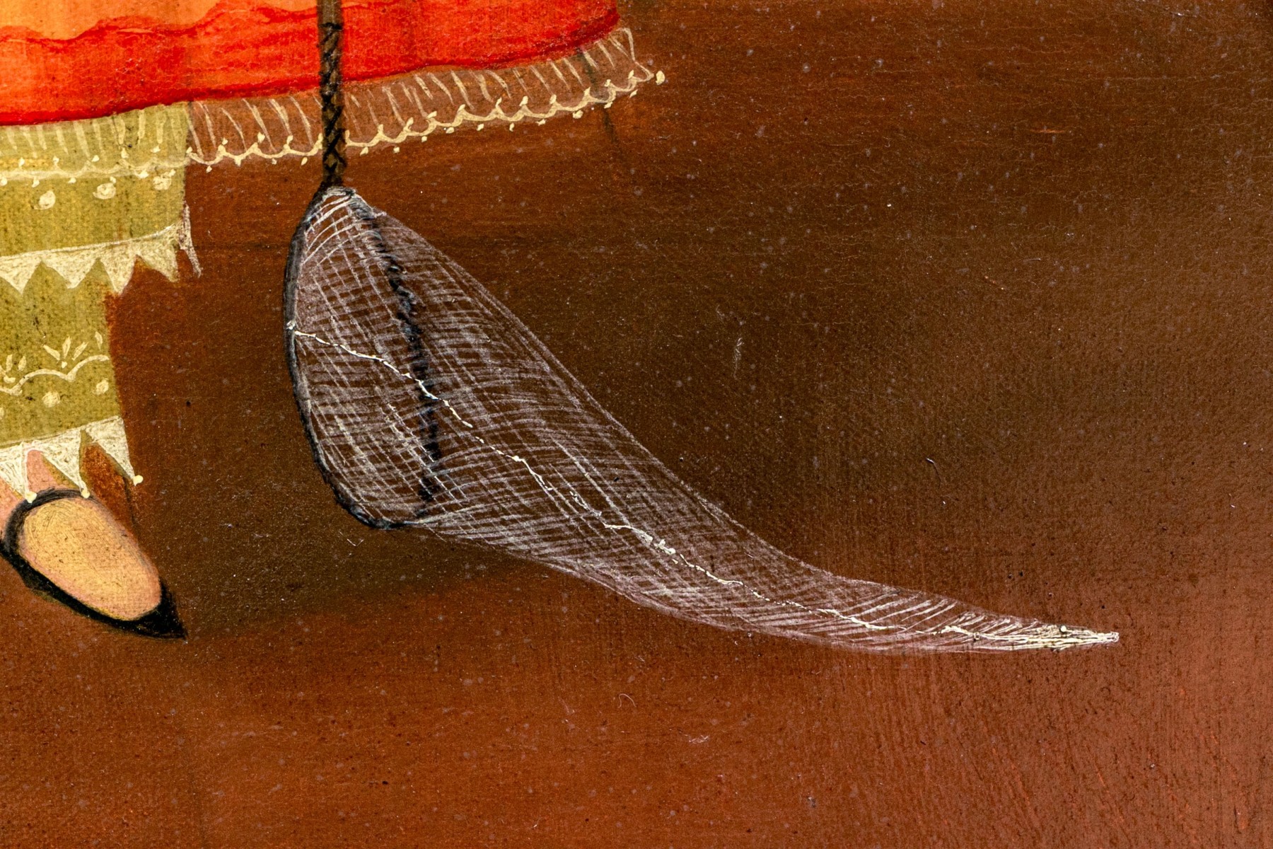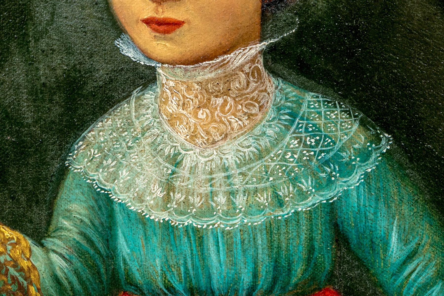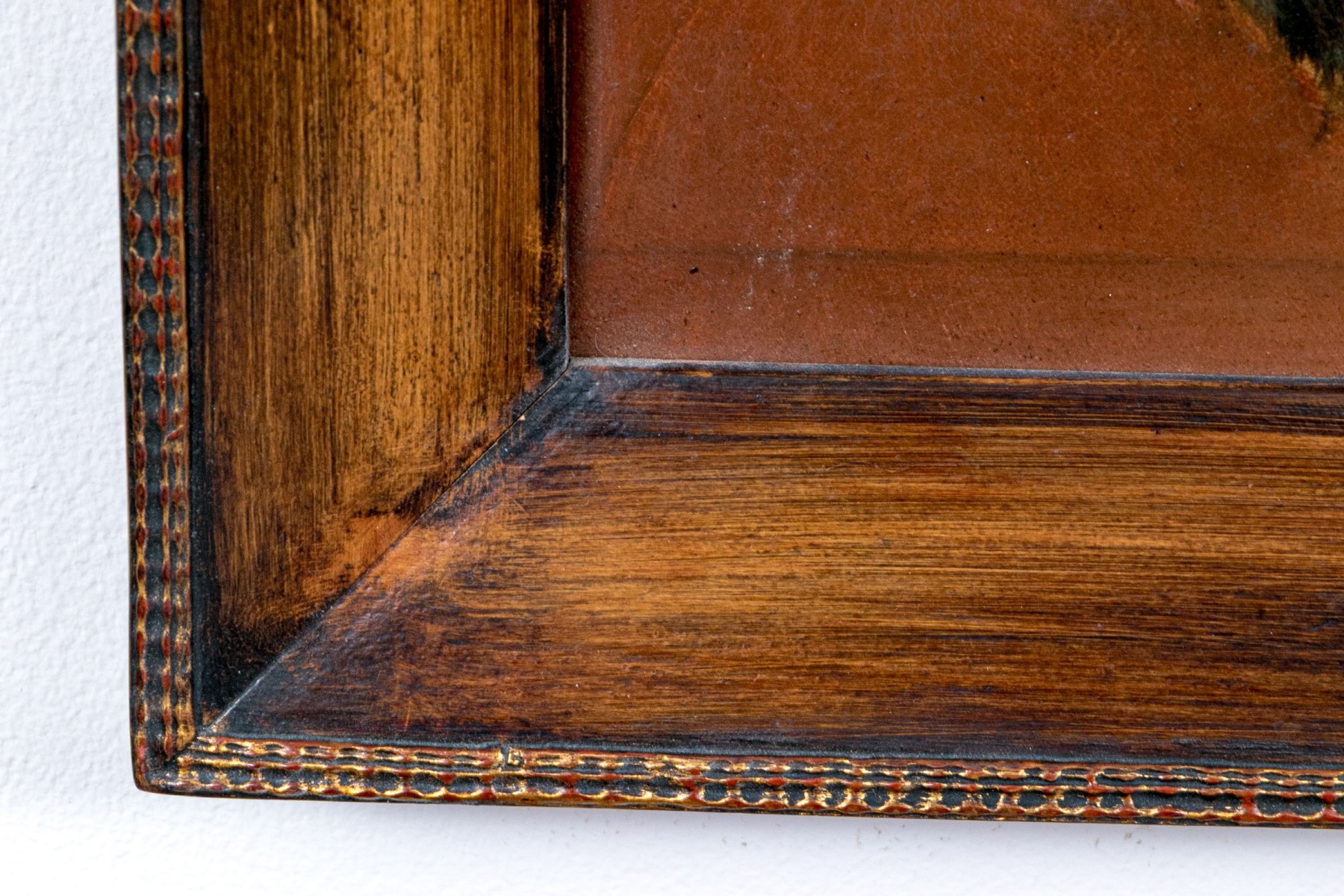 Horacio Rentería Rocha (Mexican, 1912-1972) oil painting on panel depicting a well dress girl in a lace high collar, blue blouse, and orange patterned skirt with yellow pants beneath, holding a net and a magenta rose while surrounded by colorful butterflies. The girl stands next to a small recumbent black and white dog, standing on a red-brown ground against a black background. Signed lower right.