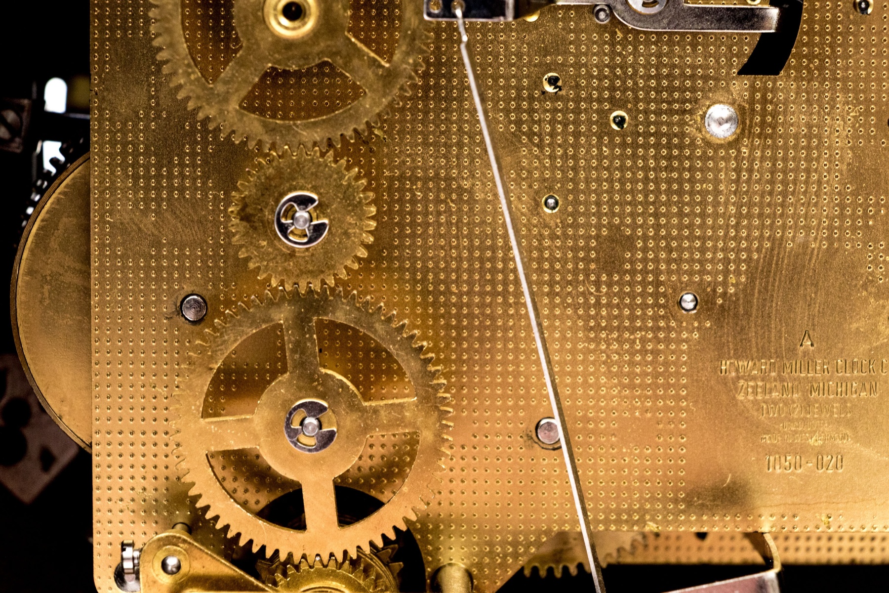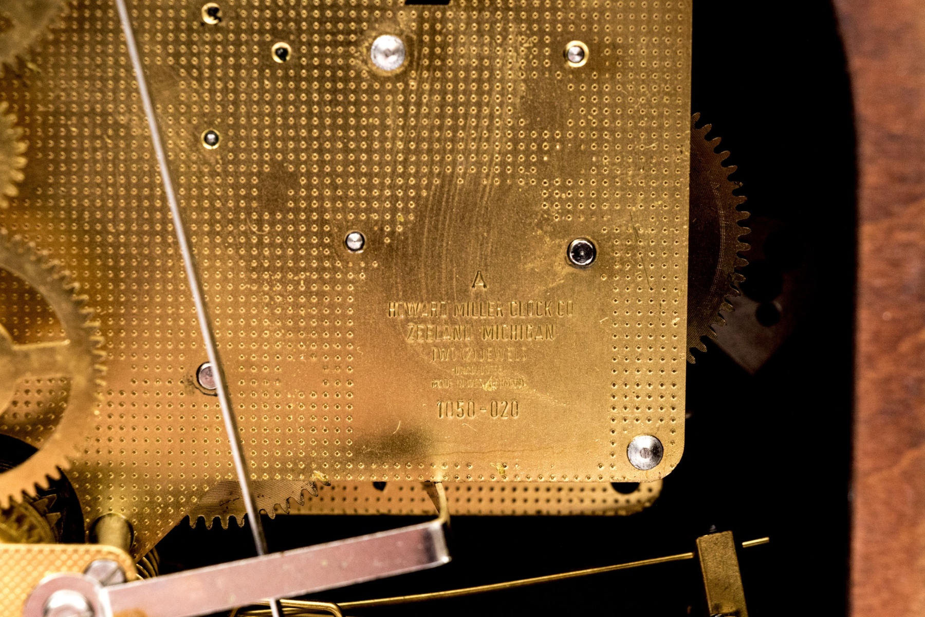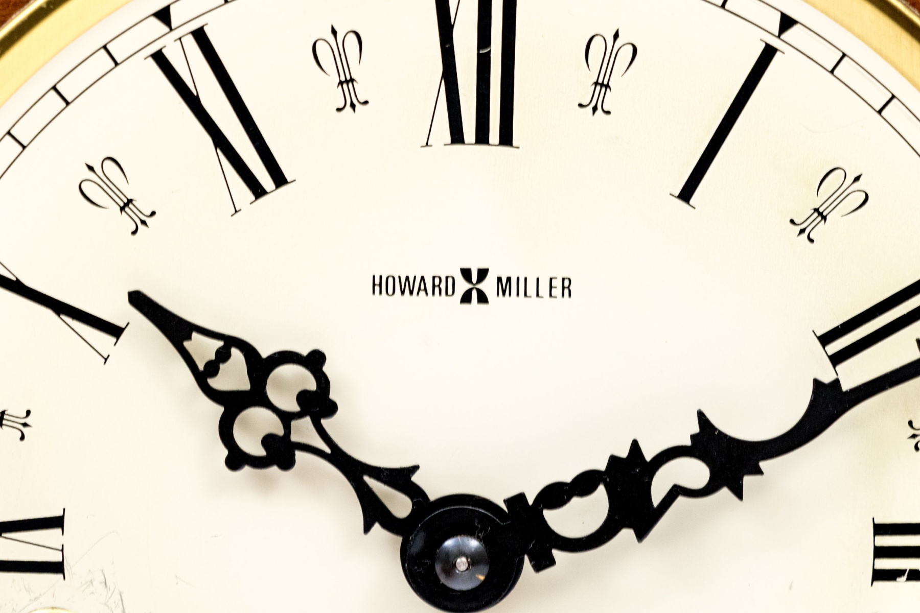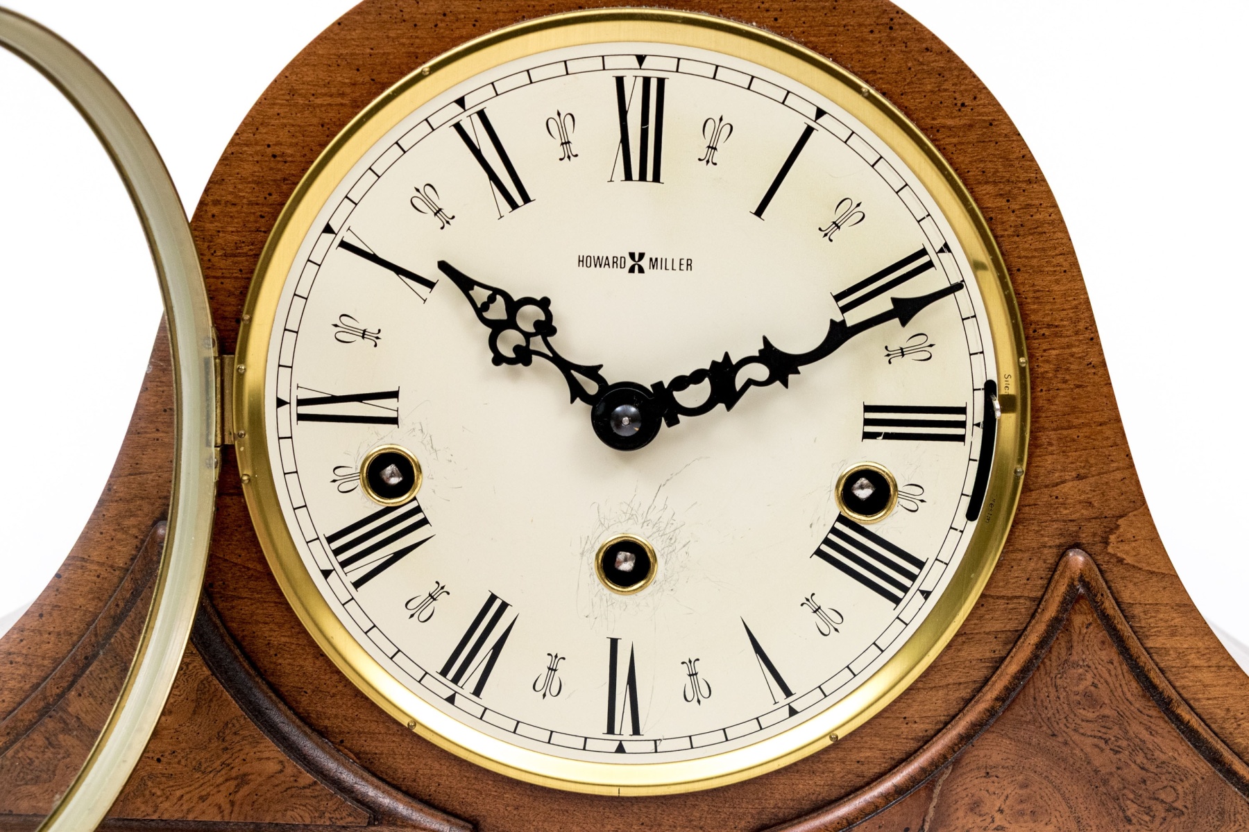 A wonderful Howard Miller mantel clock featuring a shaped wood case with brass trim and glass cover with Roman numerals to the dial. Verso opens to access the interior.