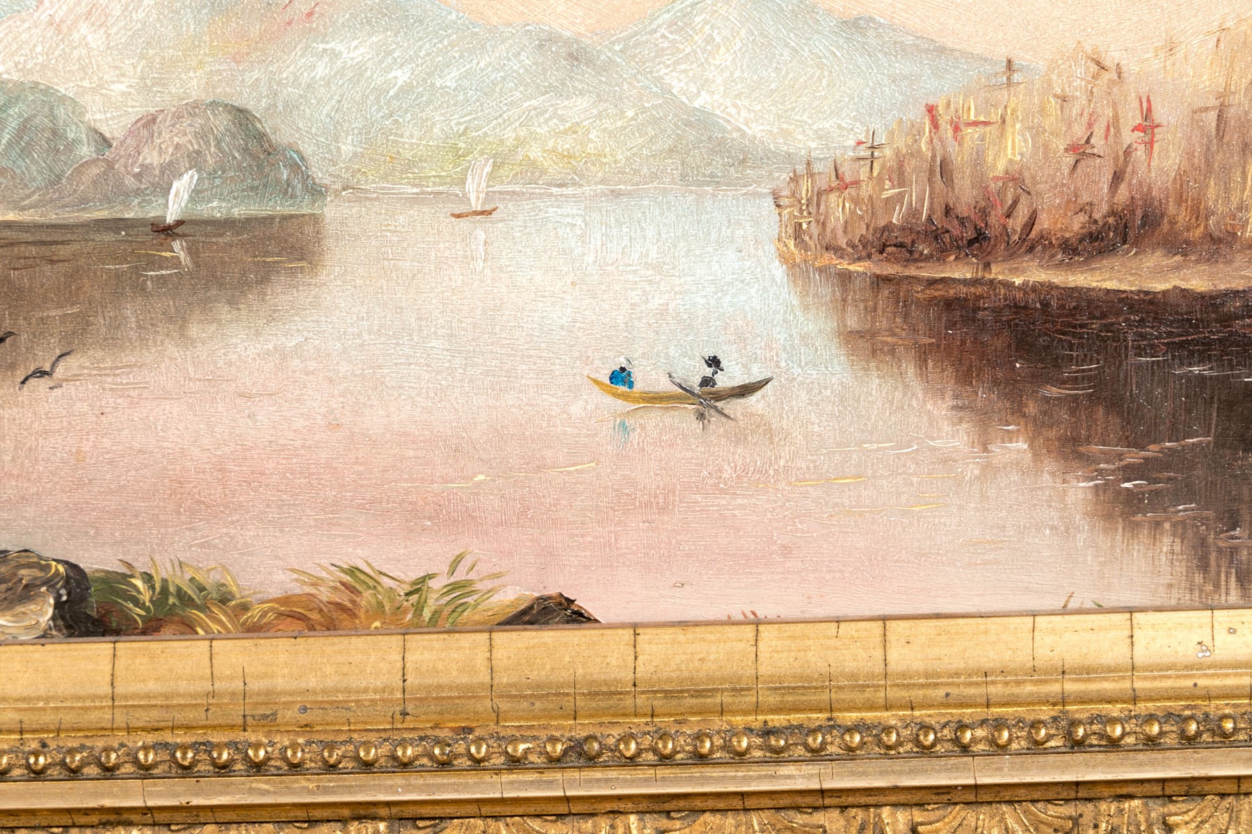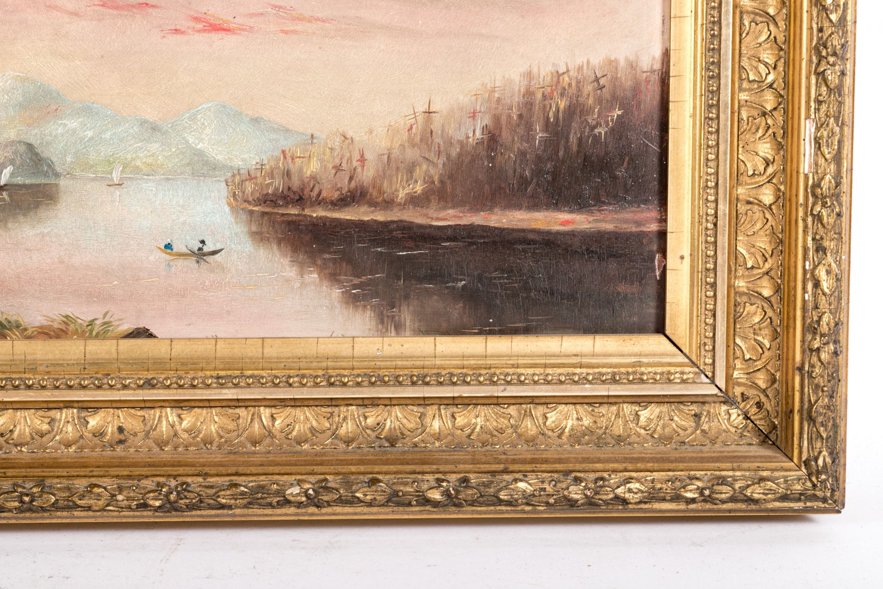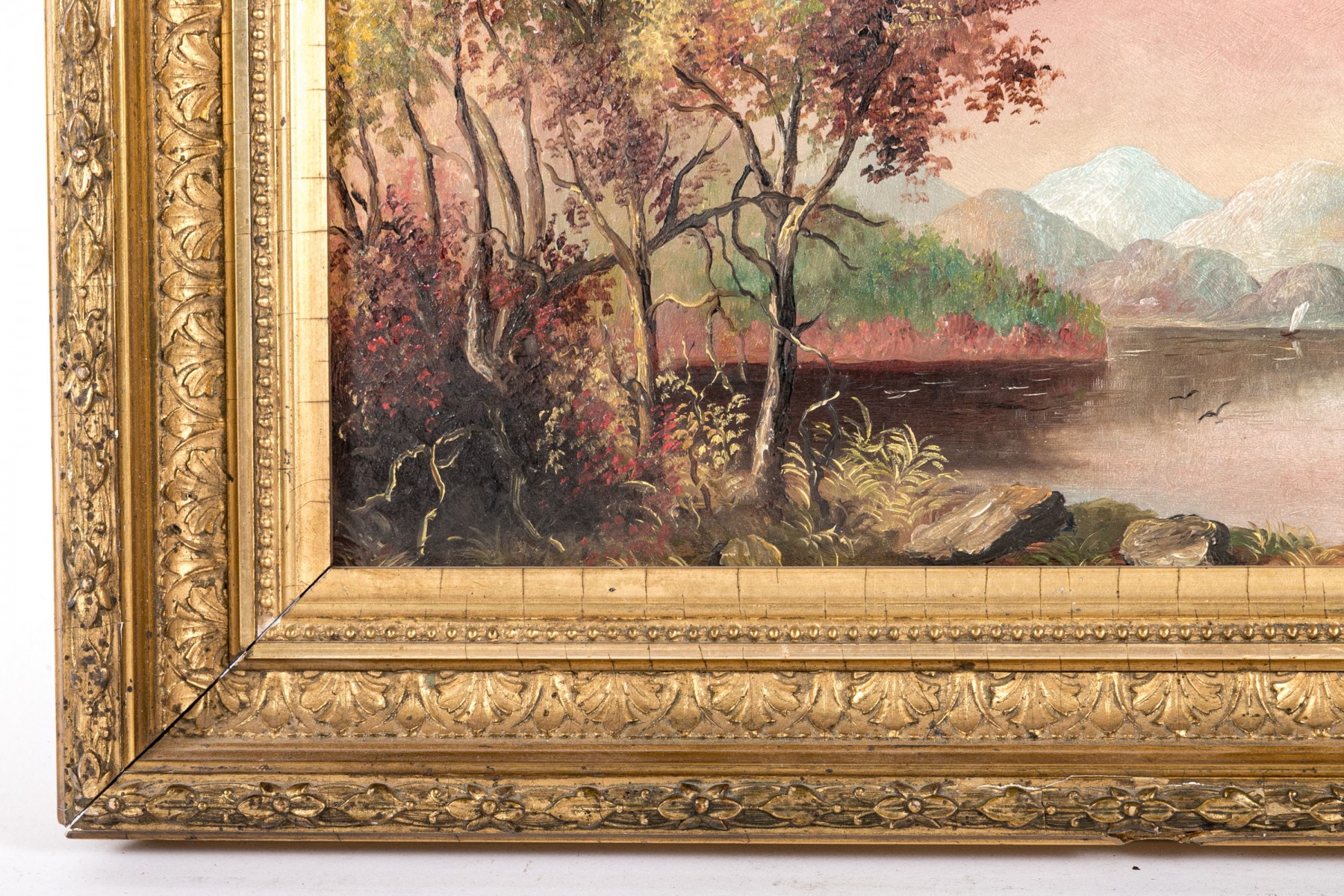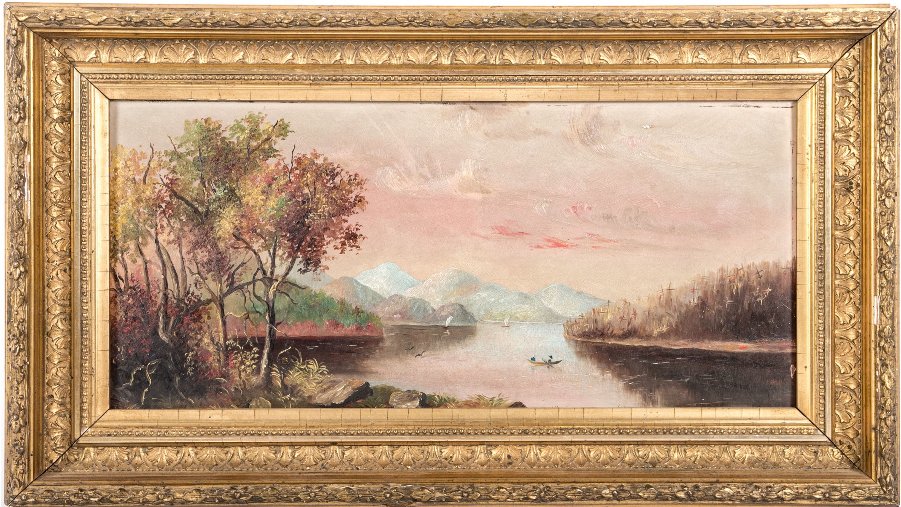 A beautiful Hudson River school oil on board depicting a calm lake surrounded by banks of lush autumnal foliage. The warm tones of the tree canopies compliment a pink and pale yellow sky at sunset, reflecting onto the water below. Icy blue mountains in the background echo the cooling temperatures of the season. Appears to be unsigned. Displayed without glass in a gilt frame with ornate borders of foliate relief.