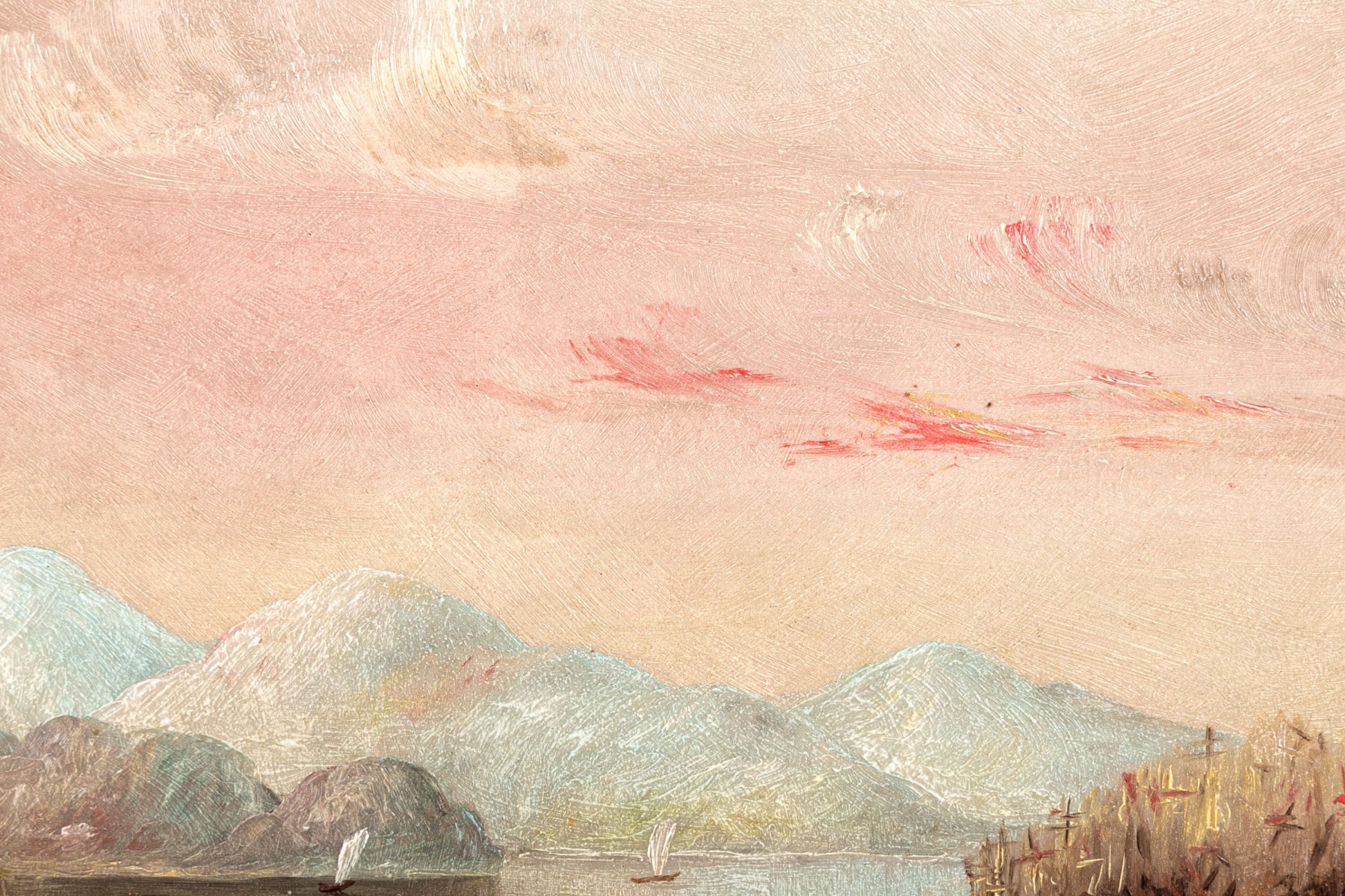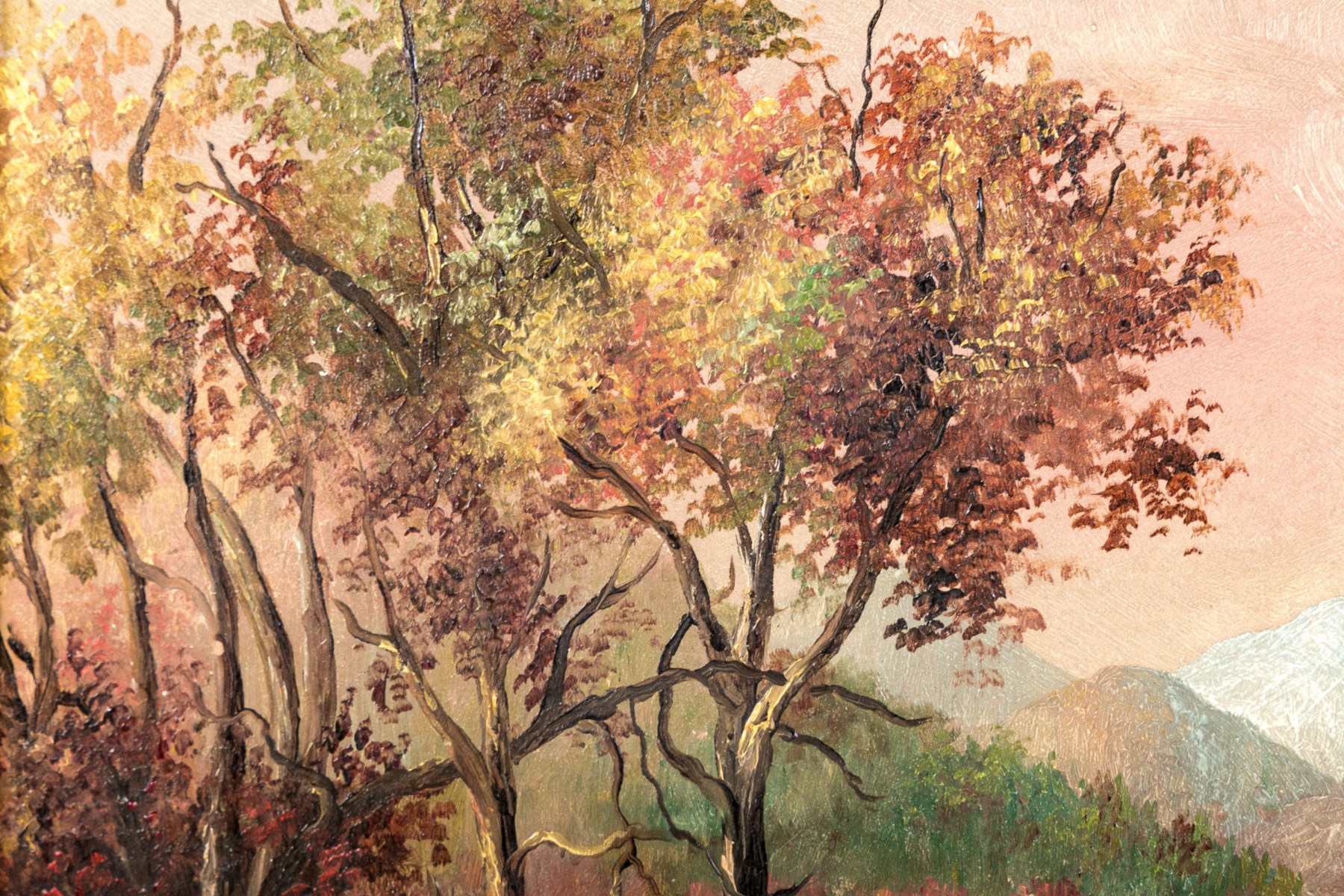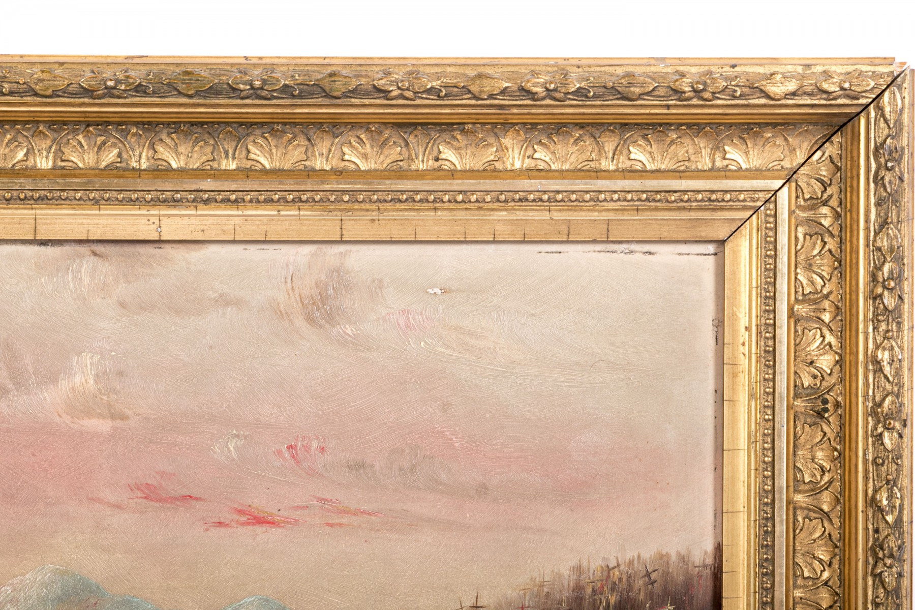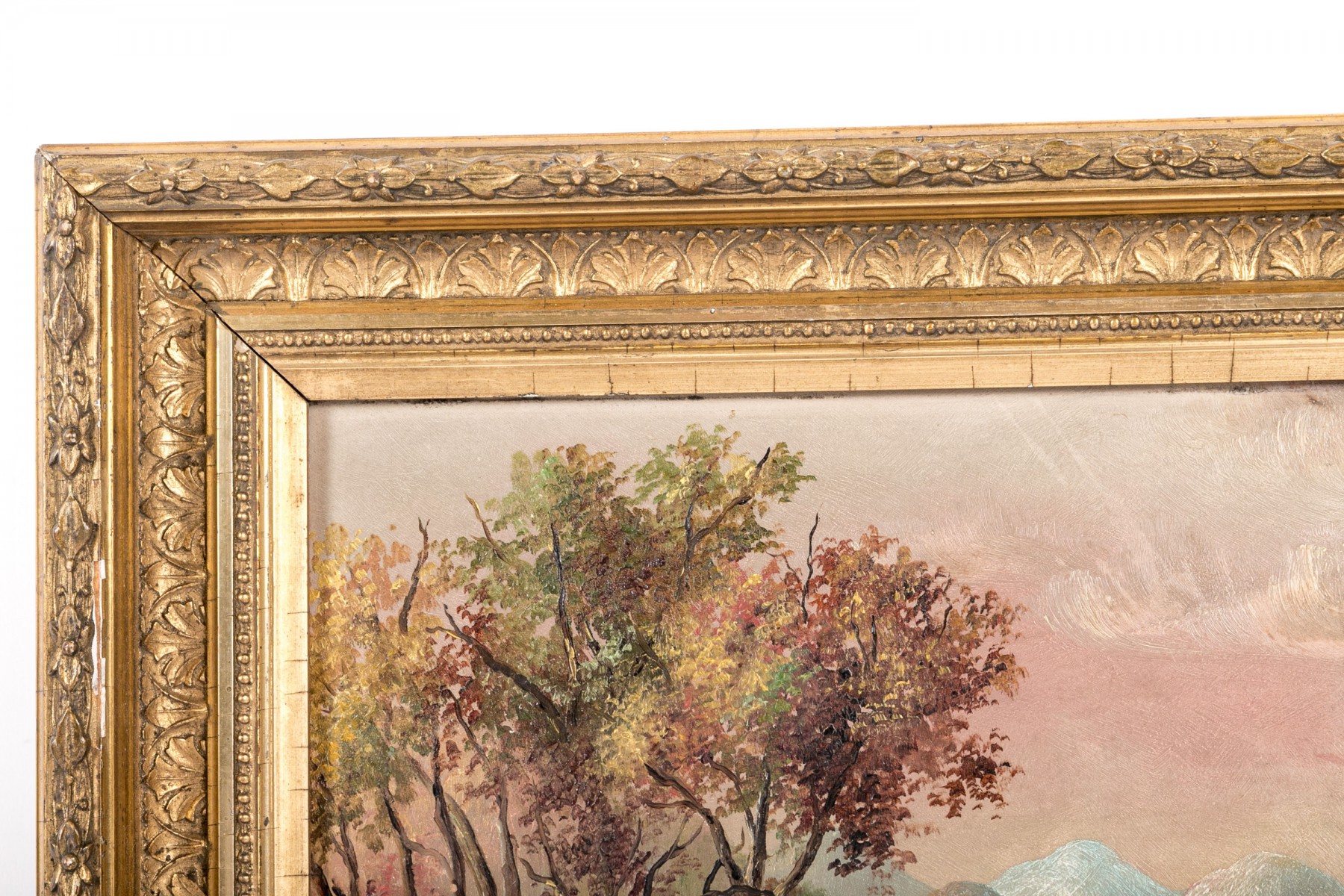 A beautiful Hudson River school oil on board depicting a calm lake surrounded by banks of lush autumnal foliage. The warm tones of the tree canopies compliment a pink and pale yellow sky at sunset, reflecting onto the water below. Icy blue mountains in the background echo the cooling temperatures of the season. Appears to be unsigned. Displayed without glass in a gilt frame with ornate borders of foliate relief.