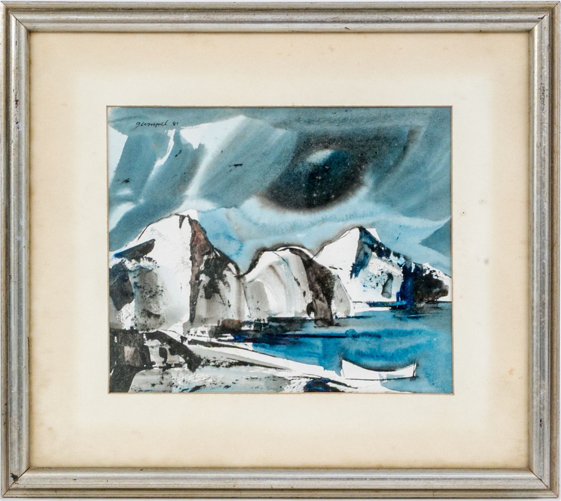 Hugh Gumpel (American, 1926-2011) watercolor painting on paper depicting a lone boat at the shore and jagged white rocks around calm blue water beneath a gray-blue sky. Signed upper left.