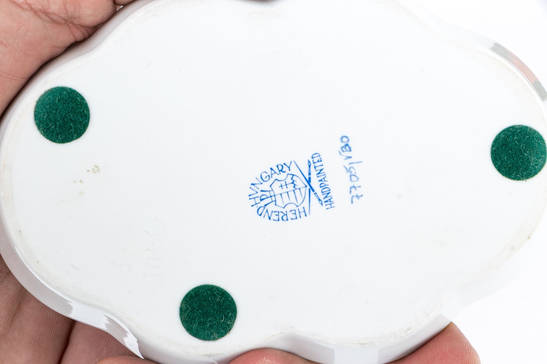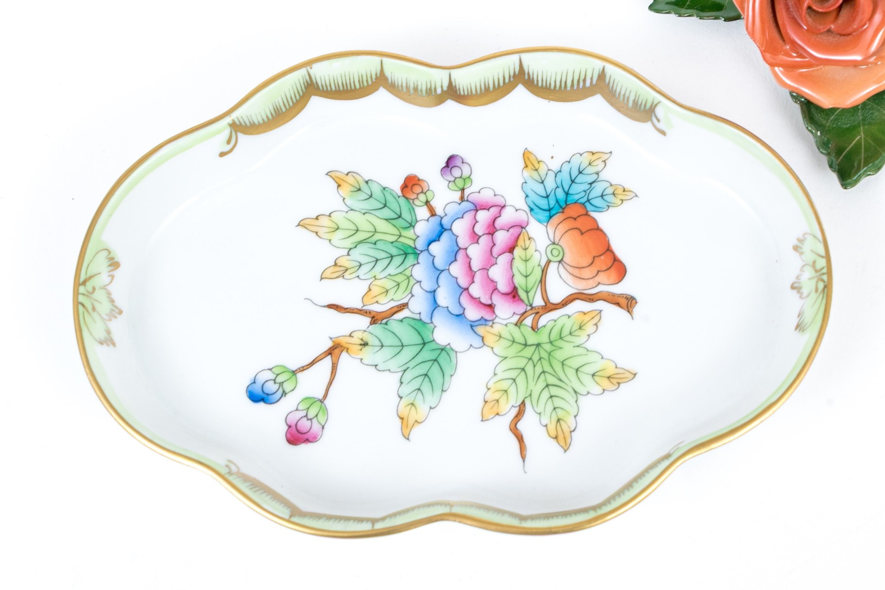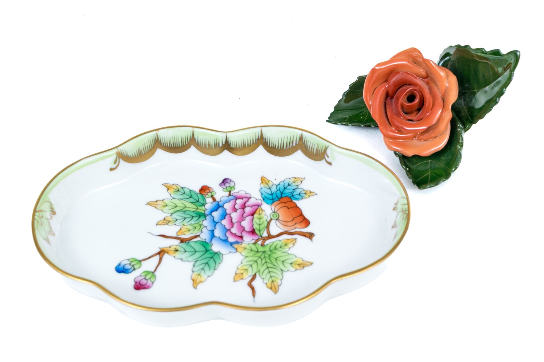 A wonderful duo of Herend porcelain including a small shaped tray decorated with a Queen Victoria pattern, showcasing a vibrant polychrome floral branch at the center and a spring grim trim with gilt rims. Accompanied by an orange rose place card holder with three dark green leaves.