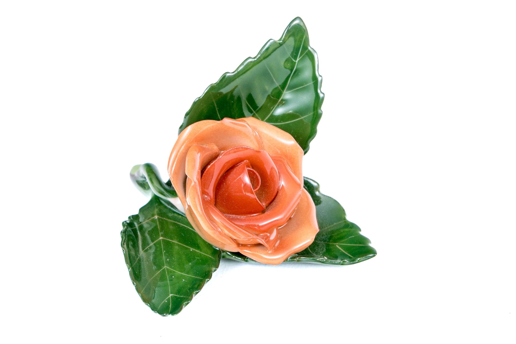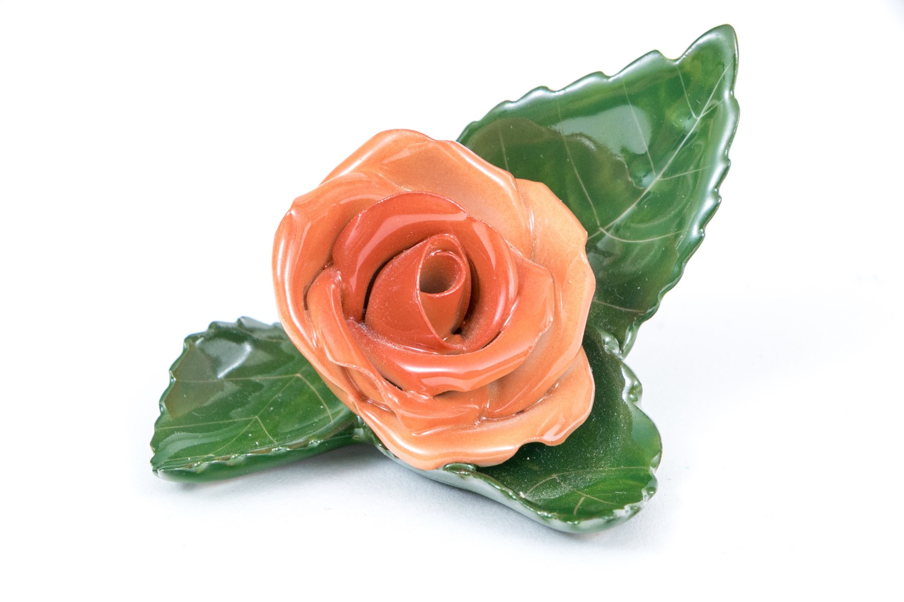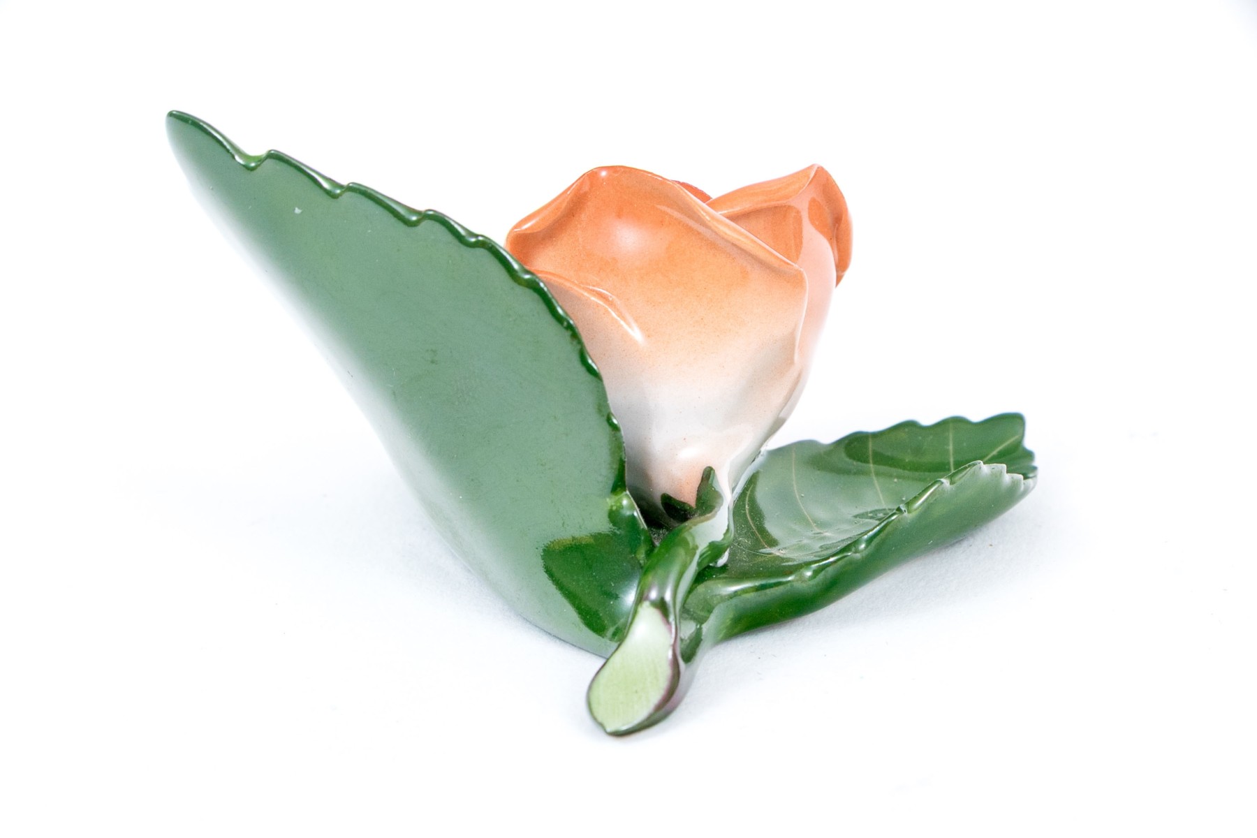 A wonderful duo of Herend porcelain including a small shaped tray decorated with a Queen Victoria pattern, showcasing a vibrant polychrome floral branch at the center and a spring grim trim with gilt rims. Accompanied by an orange rose place card holder with three dark green leaves.