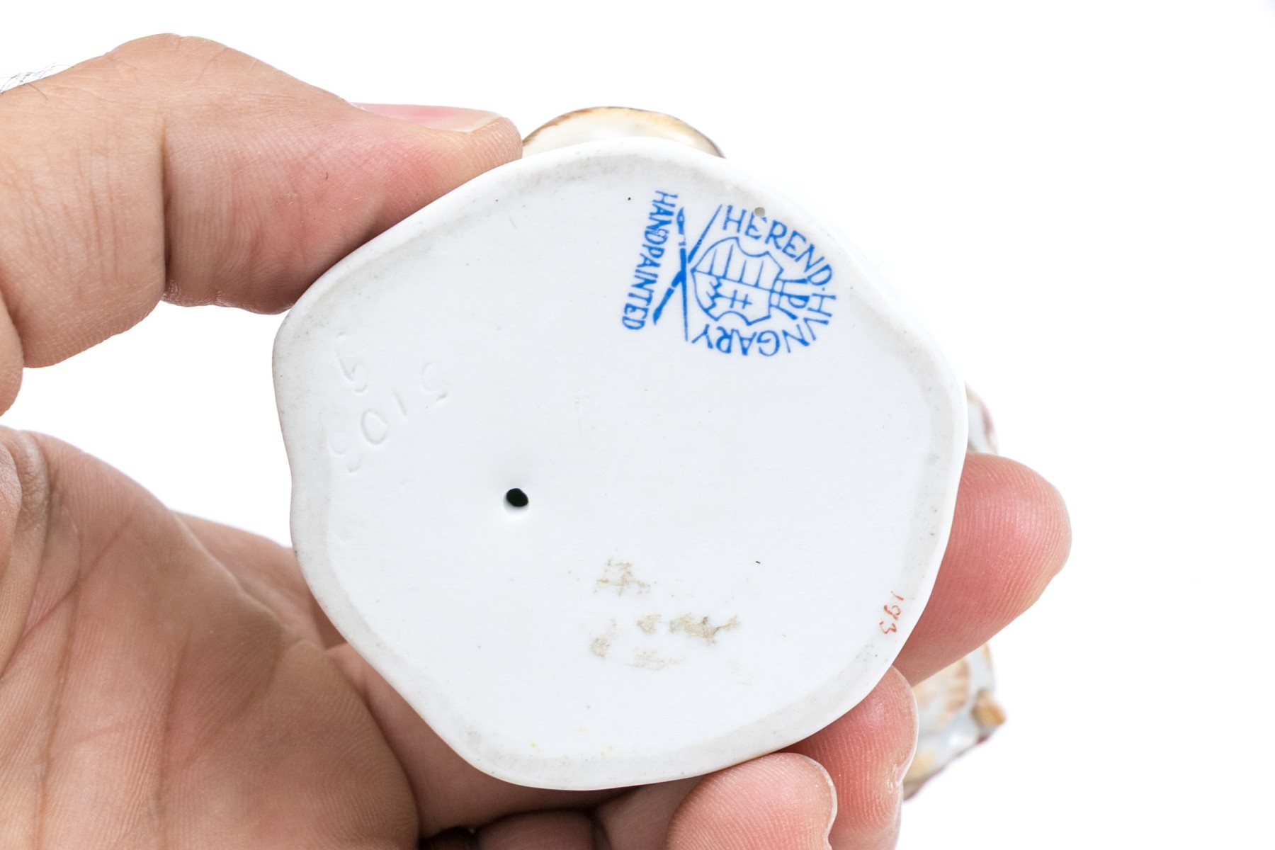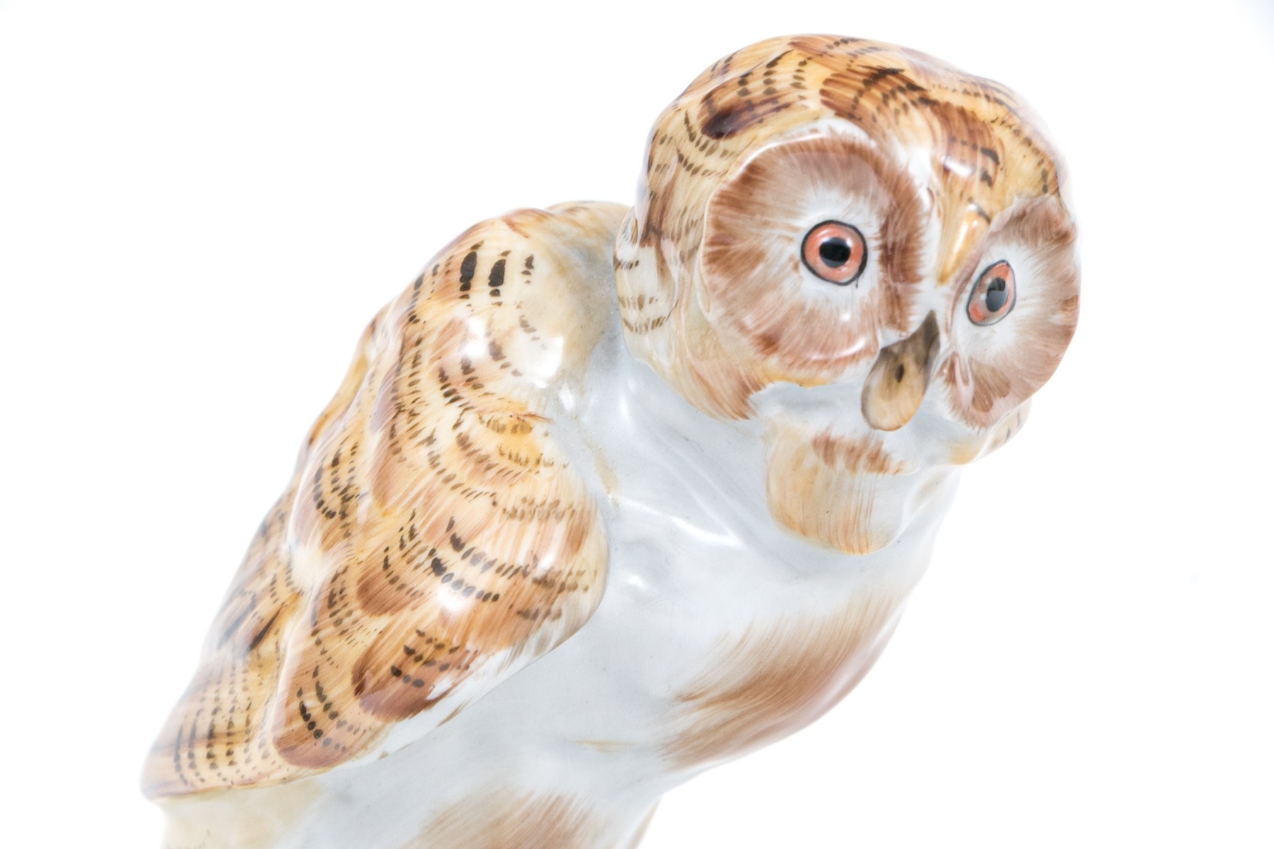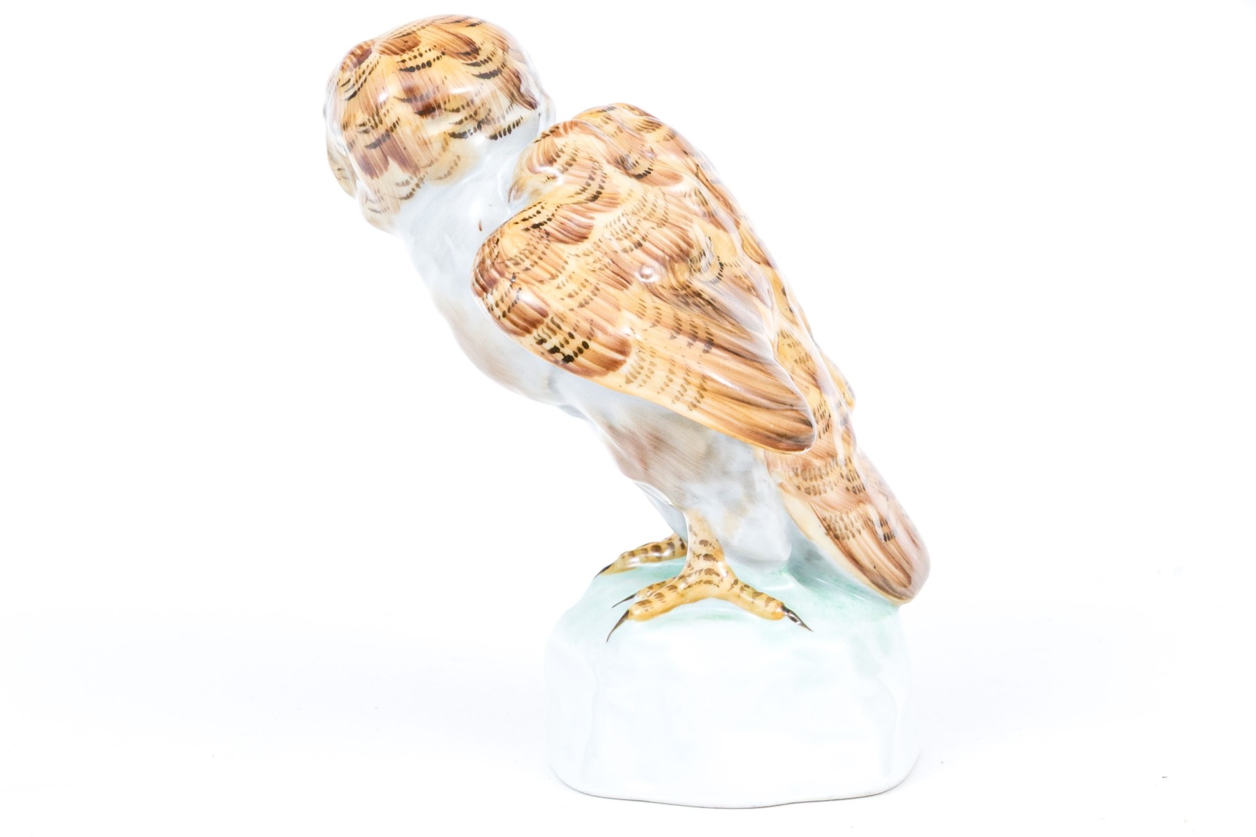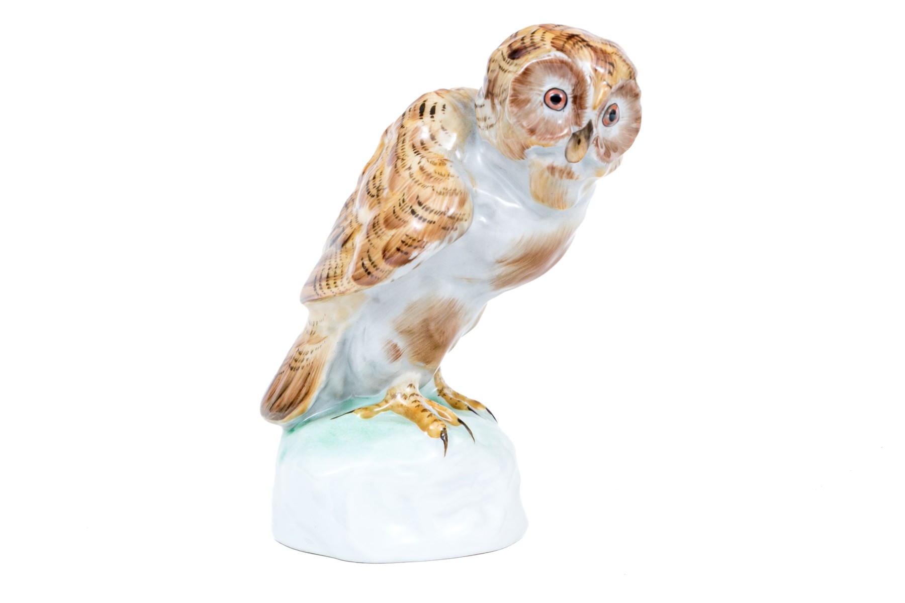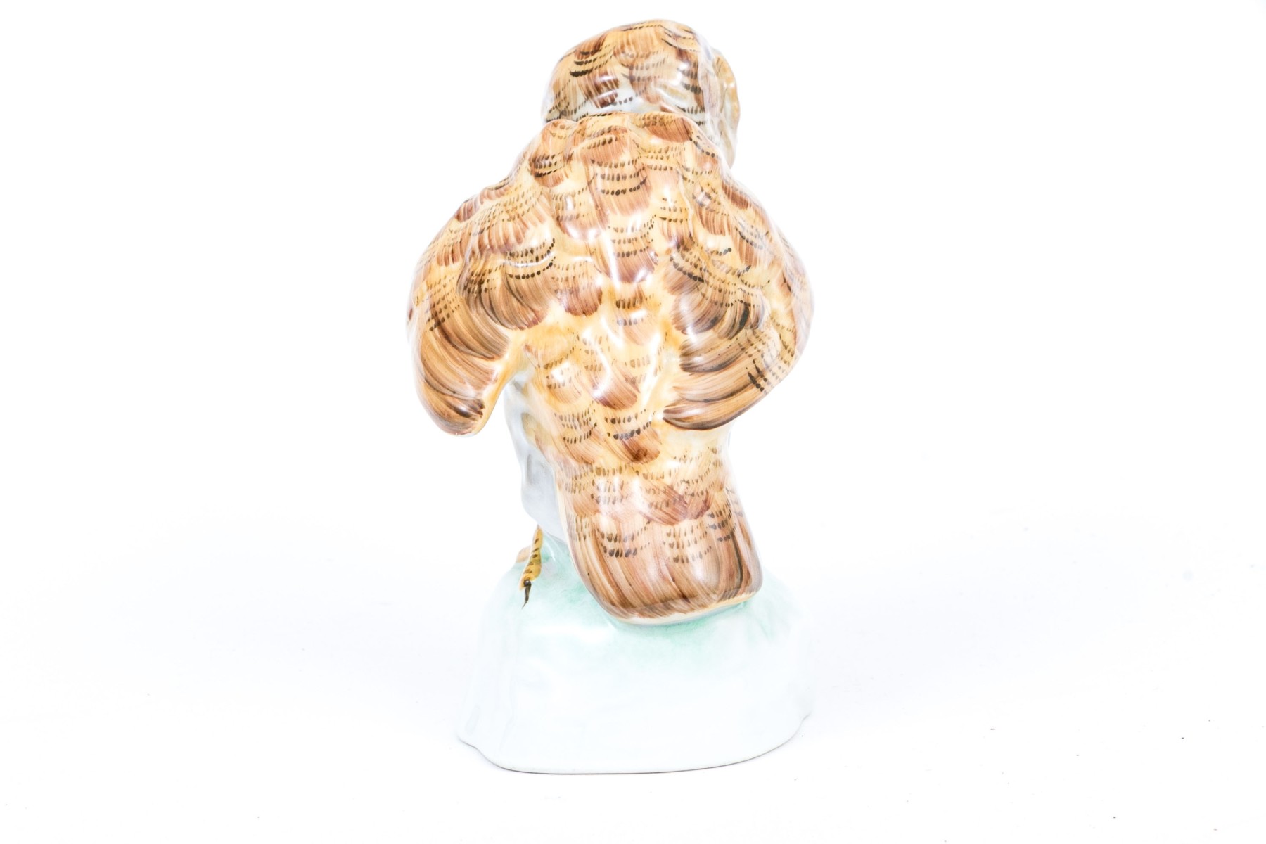 A charming Herend porcelain figurine of an owl perched over a domed base, beautifully hand-painted with naturalistic detail. The owl poses leaned slightly forward with an attentive expresion, beautifully rendered with brown and black striped feathers and yellow clawed feet over a pale green naturalistic ground. Marked underfoot.