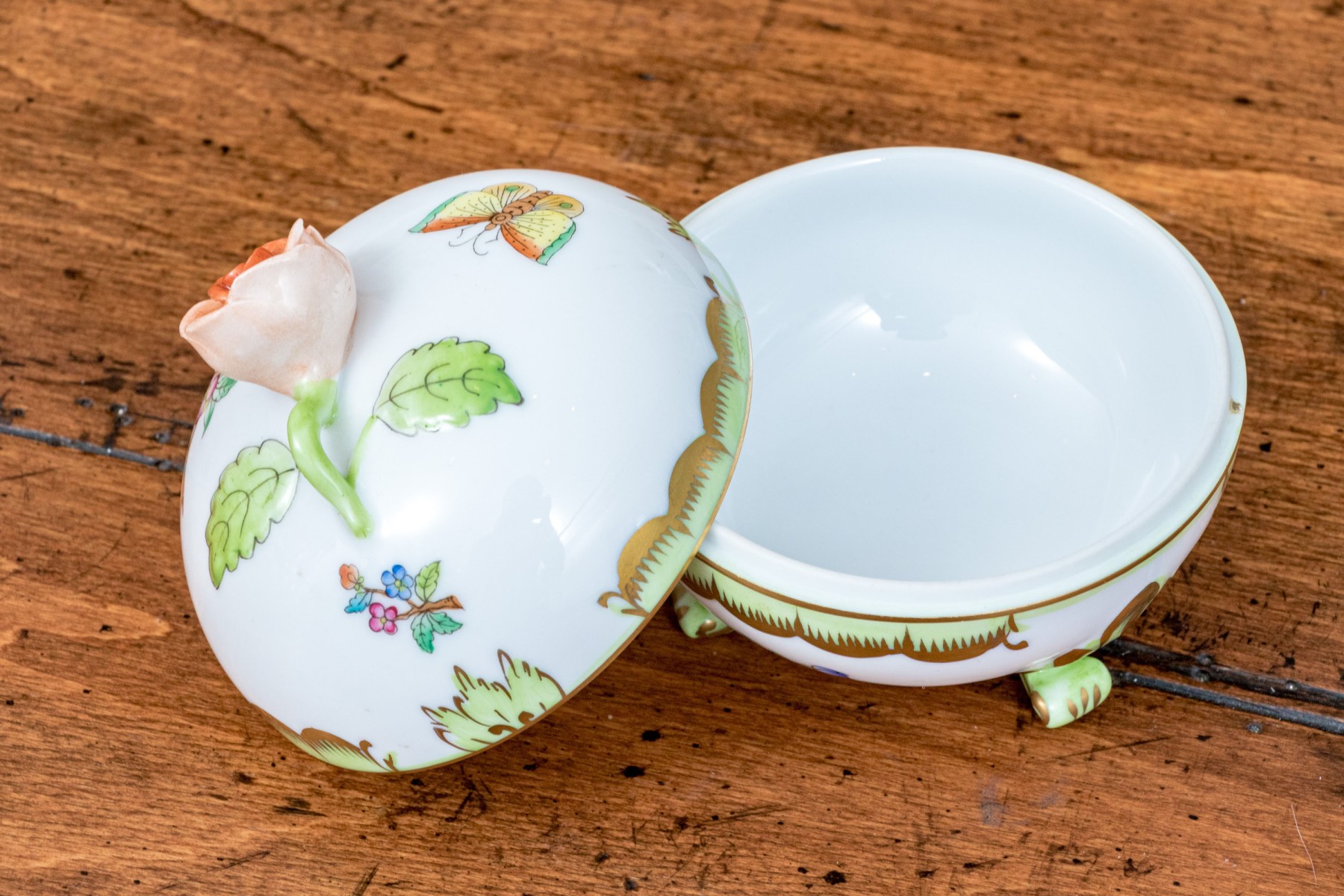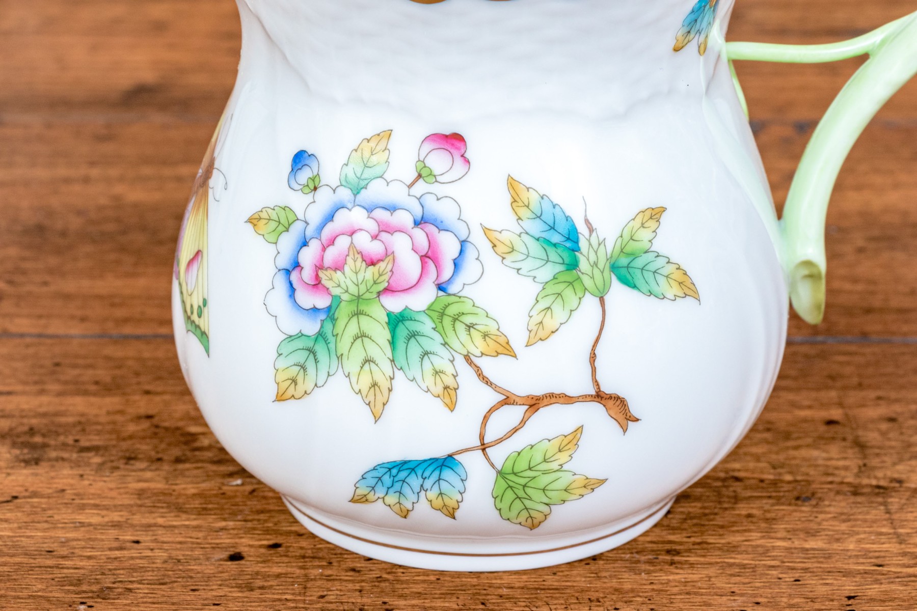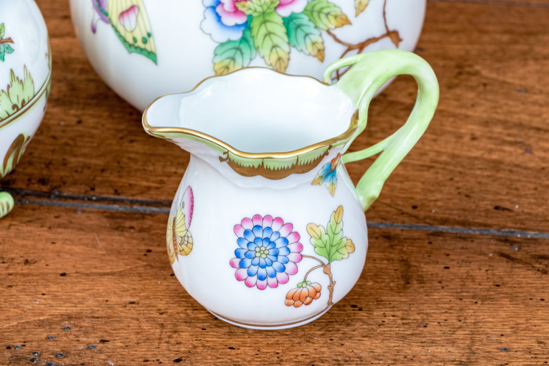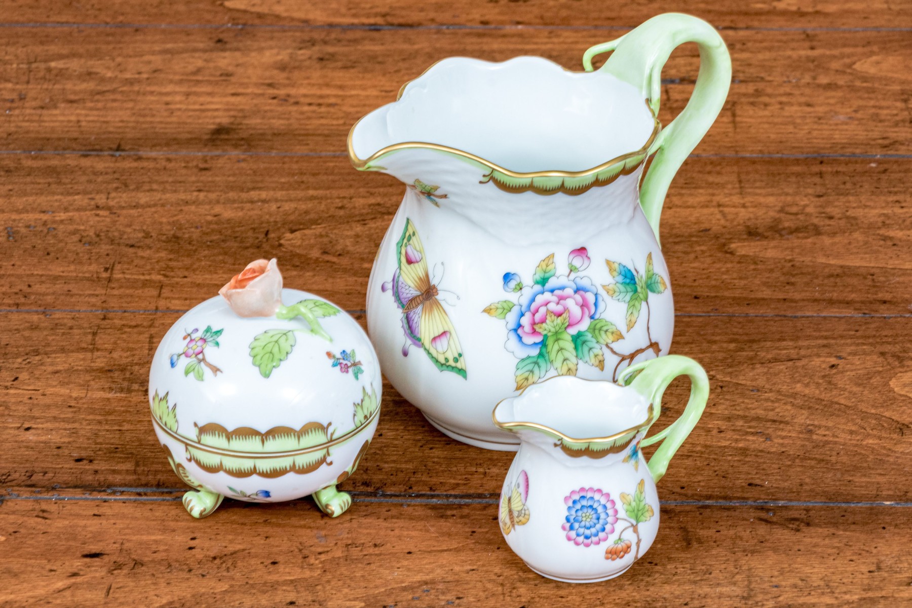 A delightful trio of Herend "Queen Victoria" porcelain serving pieces for coffee or tea. Includes a small pitcher, diminutive creamer, and lidded sugar bowl. All pieces are beautifully designed with bright white bodies, gilt trims, and polychrome butterfly and flower motifs. The pitcher and creamer had sculptural vine handles in spring green, while the sugar bowl has a dainty peachy orange rose handle and is raised on scrolled feet. Marked underfoot.
