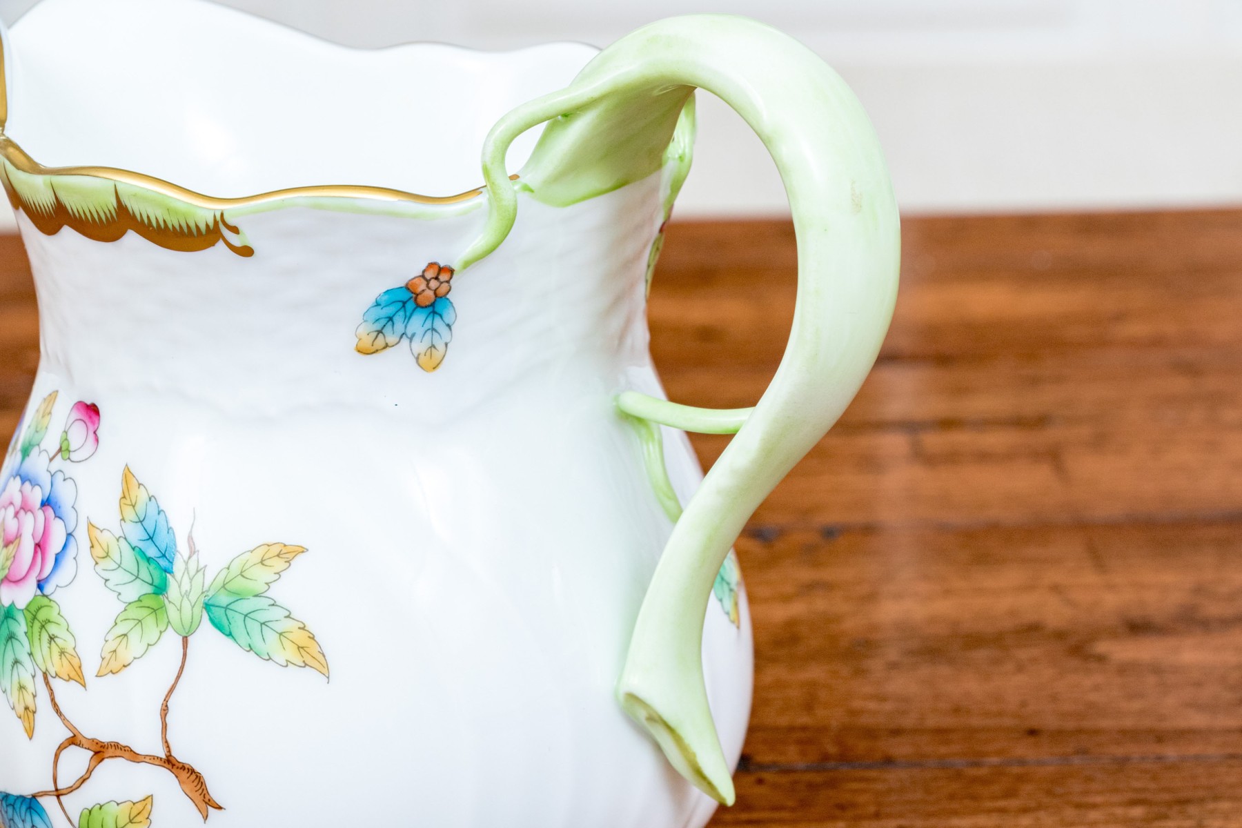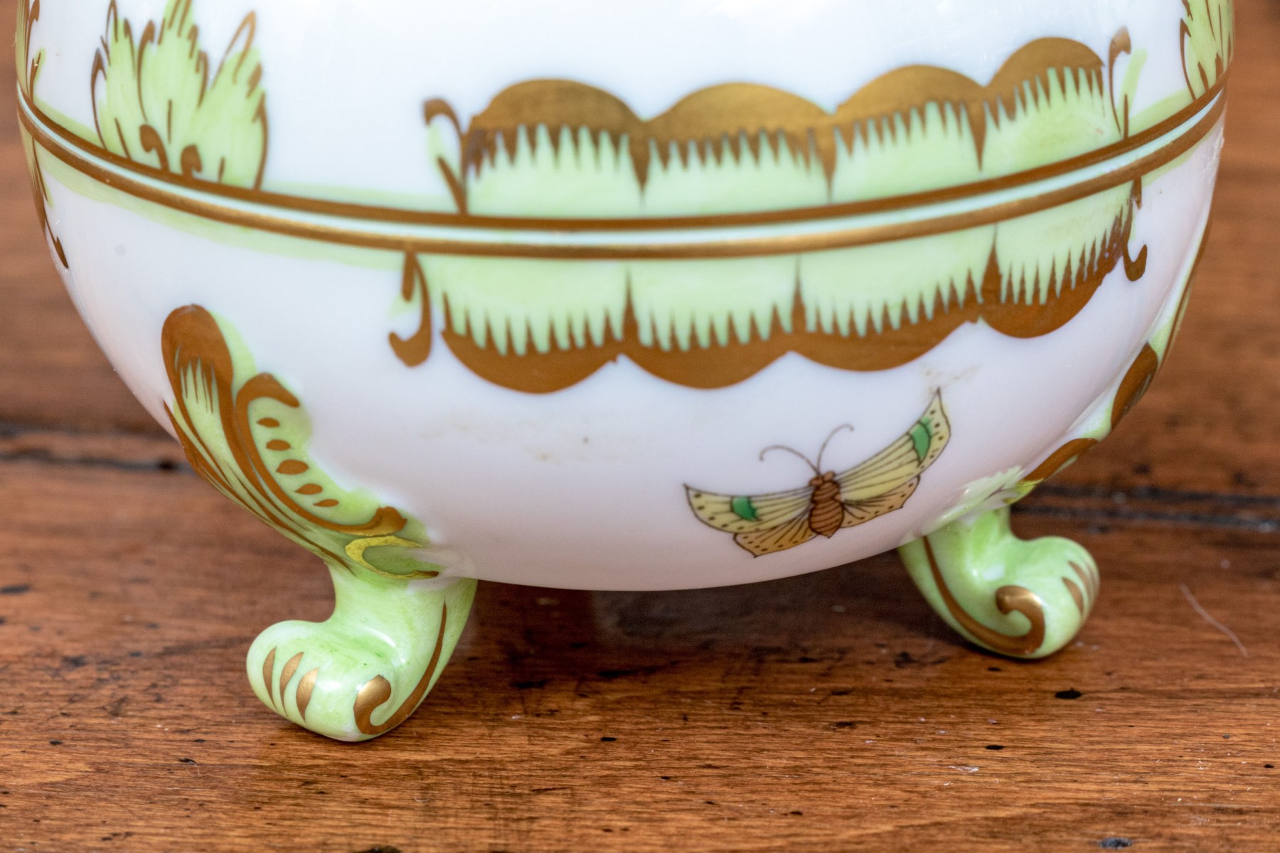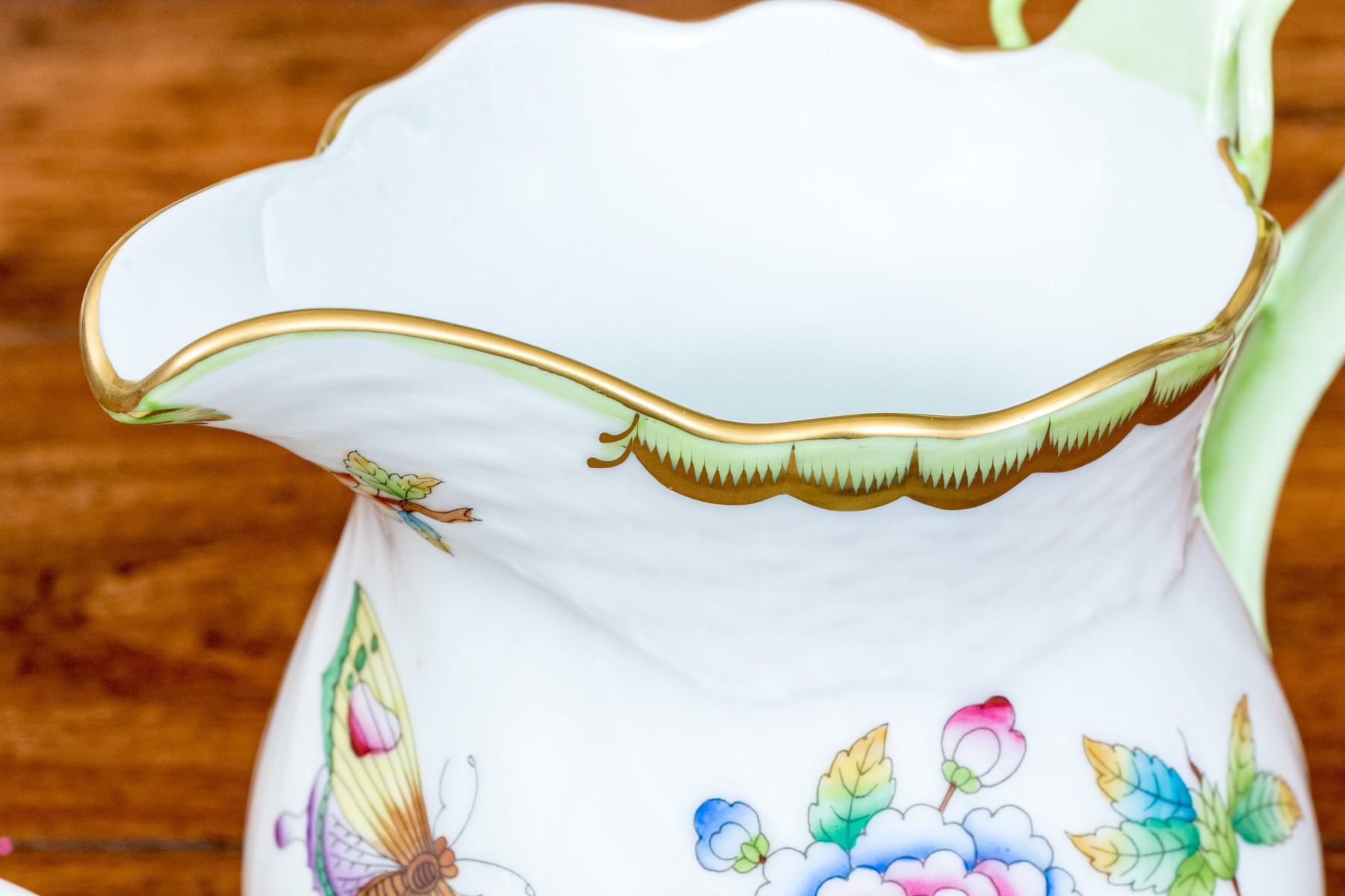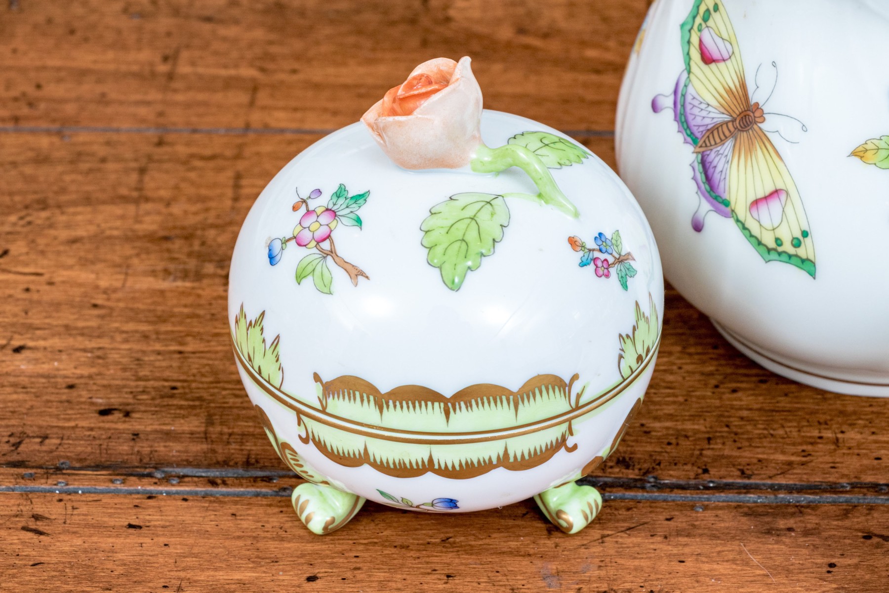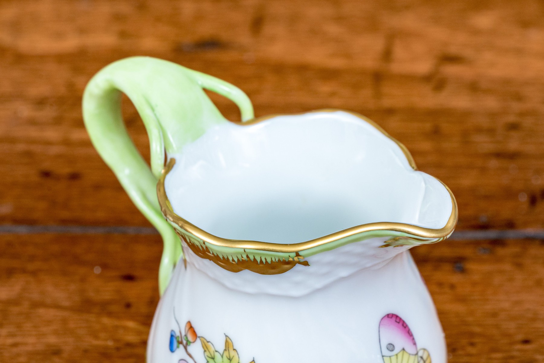 A delightful trio of Herend "Queen Victoria" porcelain serving pieces for coffee or tea. Includes a small pitcher, diminutive creamer, and lidded sugar bowl. All pieces are beautifully designed with bright white bodies, gilt trims, and polychrome butterfly and flower motifs. The pitcher and creamer had sculptural vine handles in spring green, while the sugar bowl has a dainty peachy orange rose handle and is raised on scrolled feet. Marked underfoot.