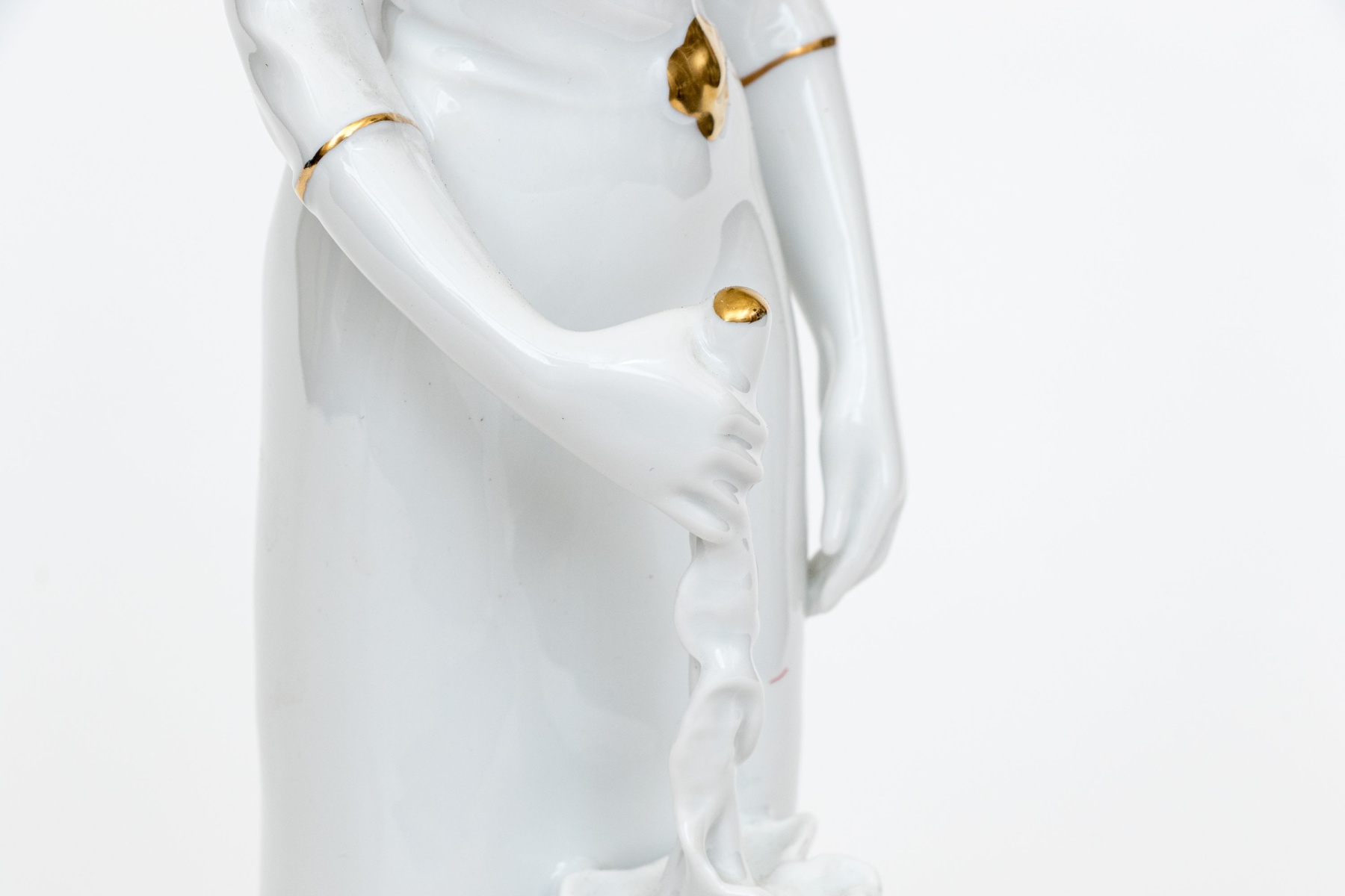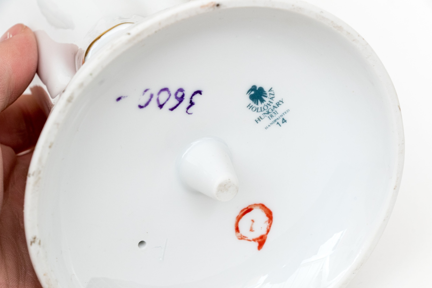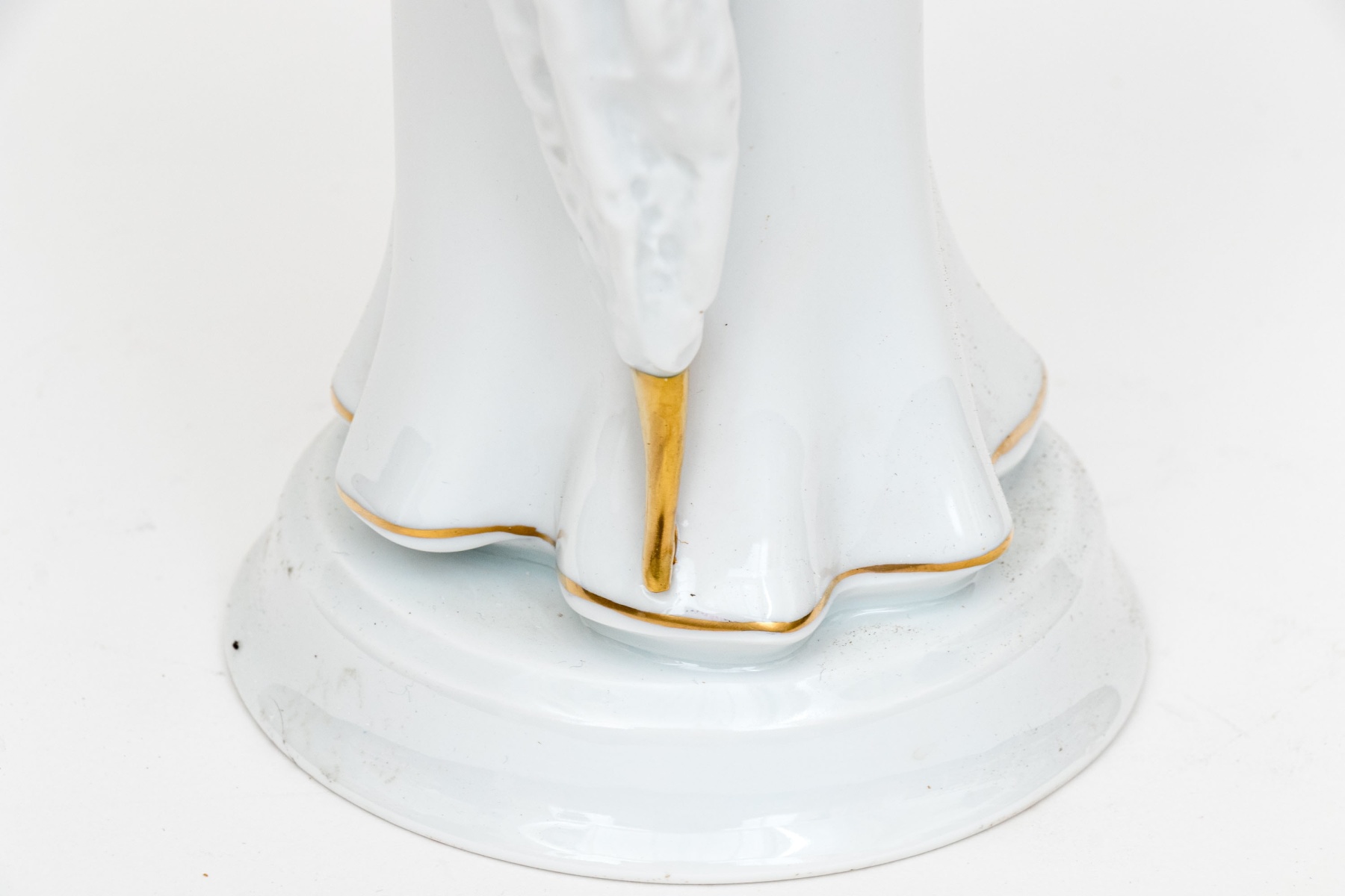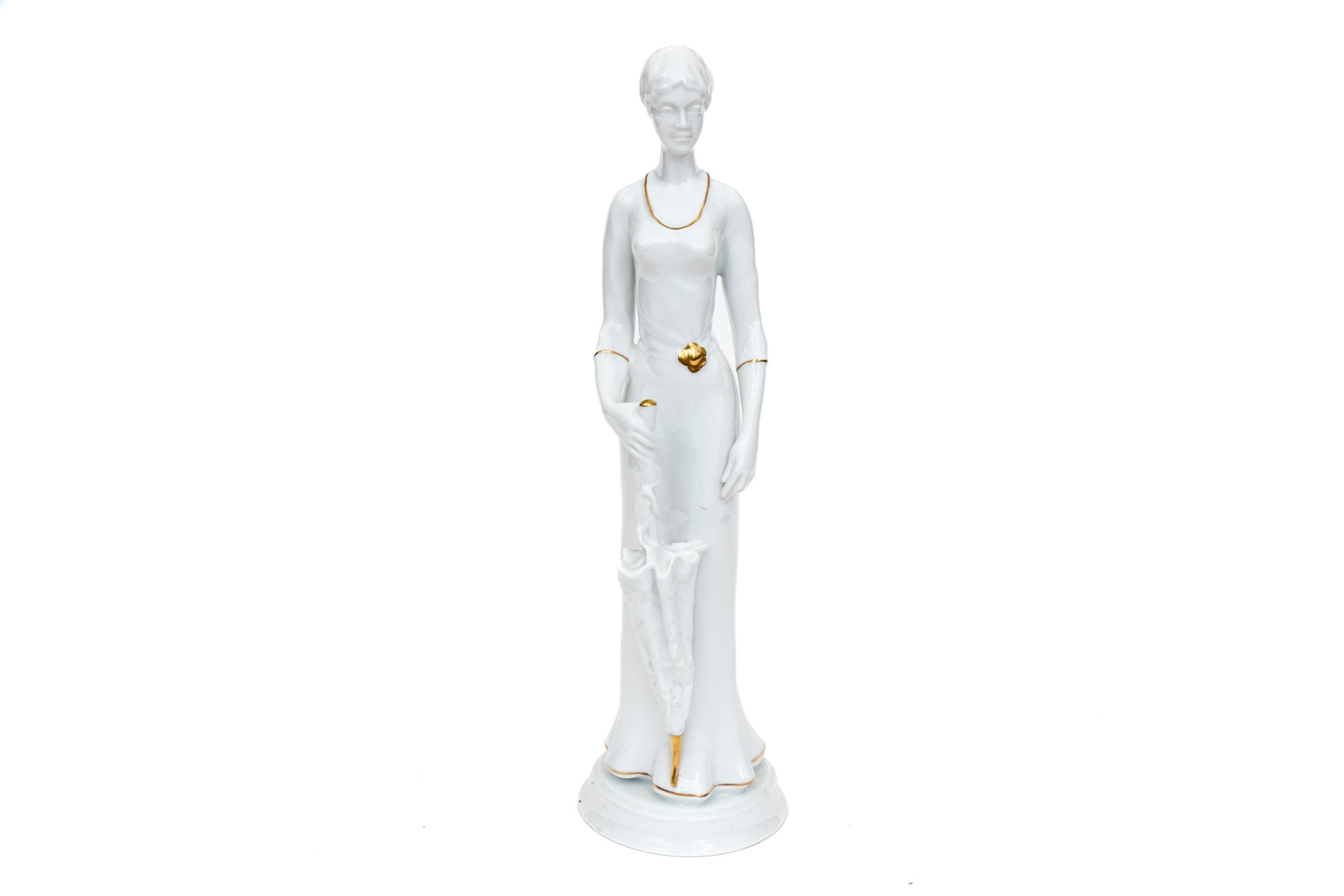 An elegant Hollóháza porcelain figurine depicting an elegant woman with an updo and long gown detailed with gilt edges and a flower at her waist, holding an umbrella while standing over a circular base. Marked underfoot.
