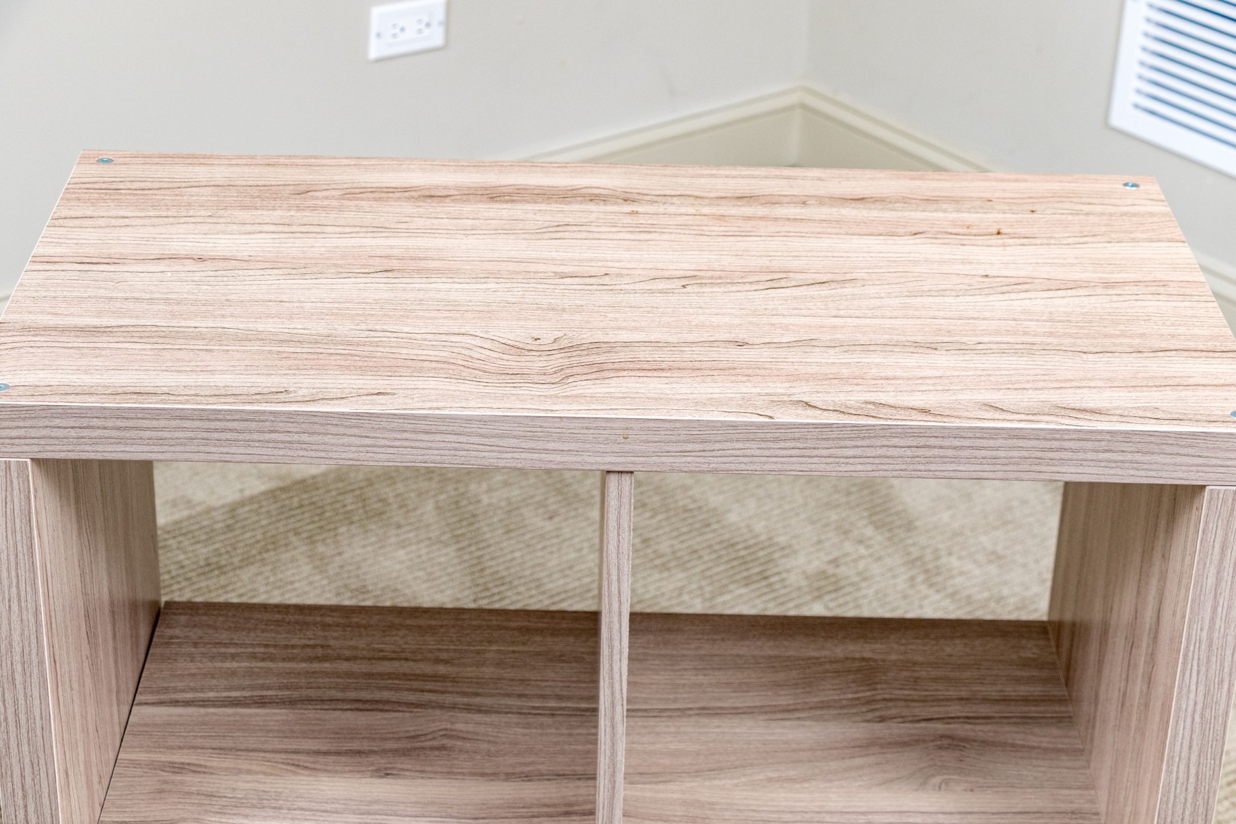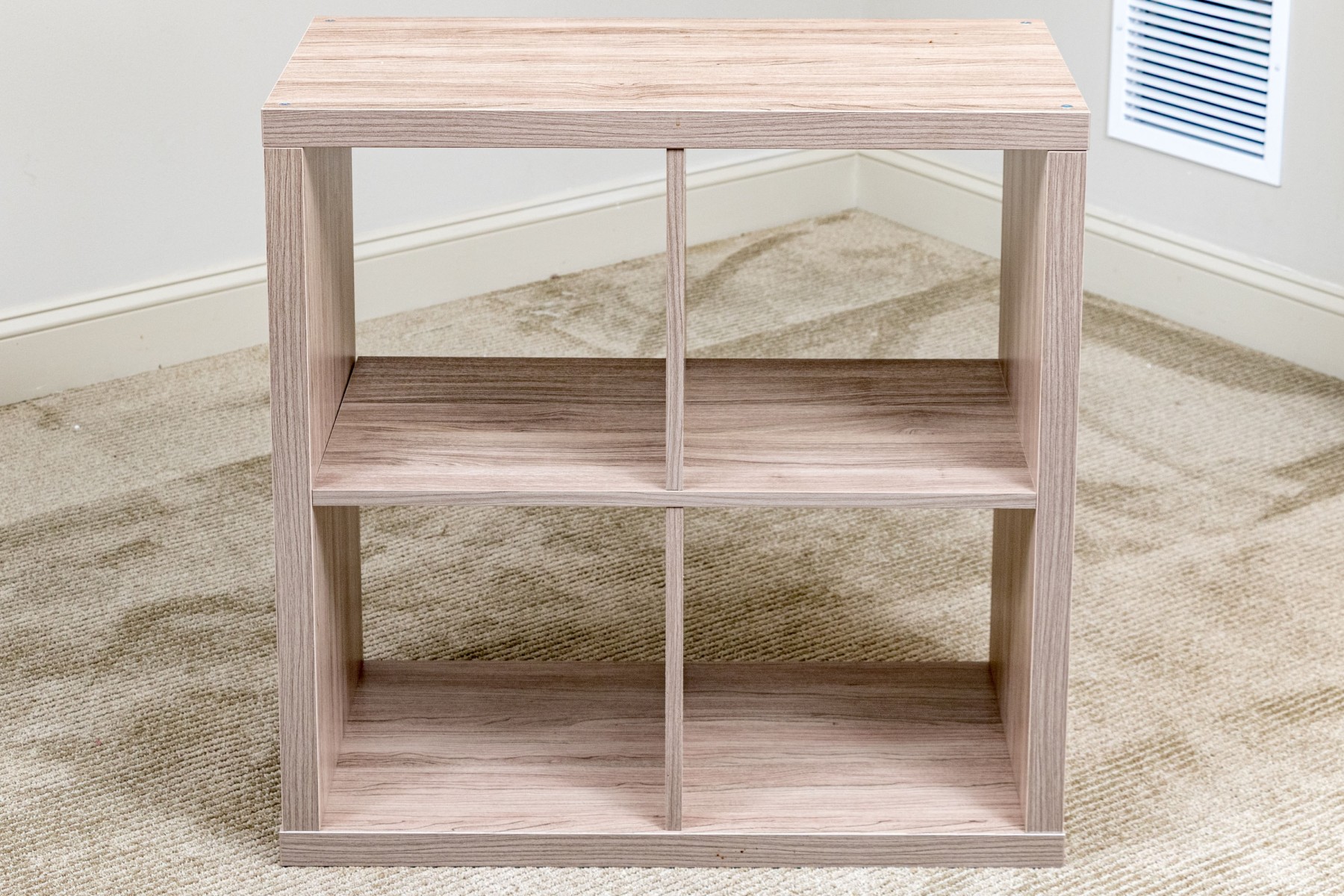 A lovely IKEA Kallax shelf unit in a white stained oak effect finish featuring four square cubbies.