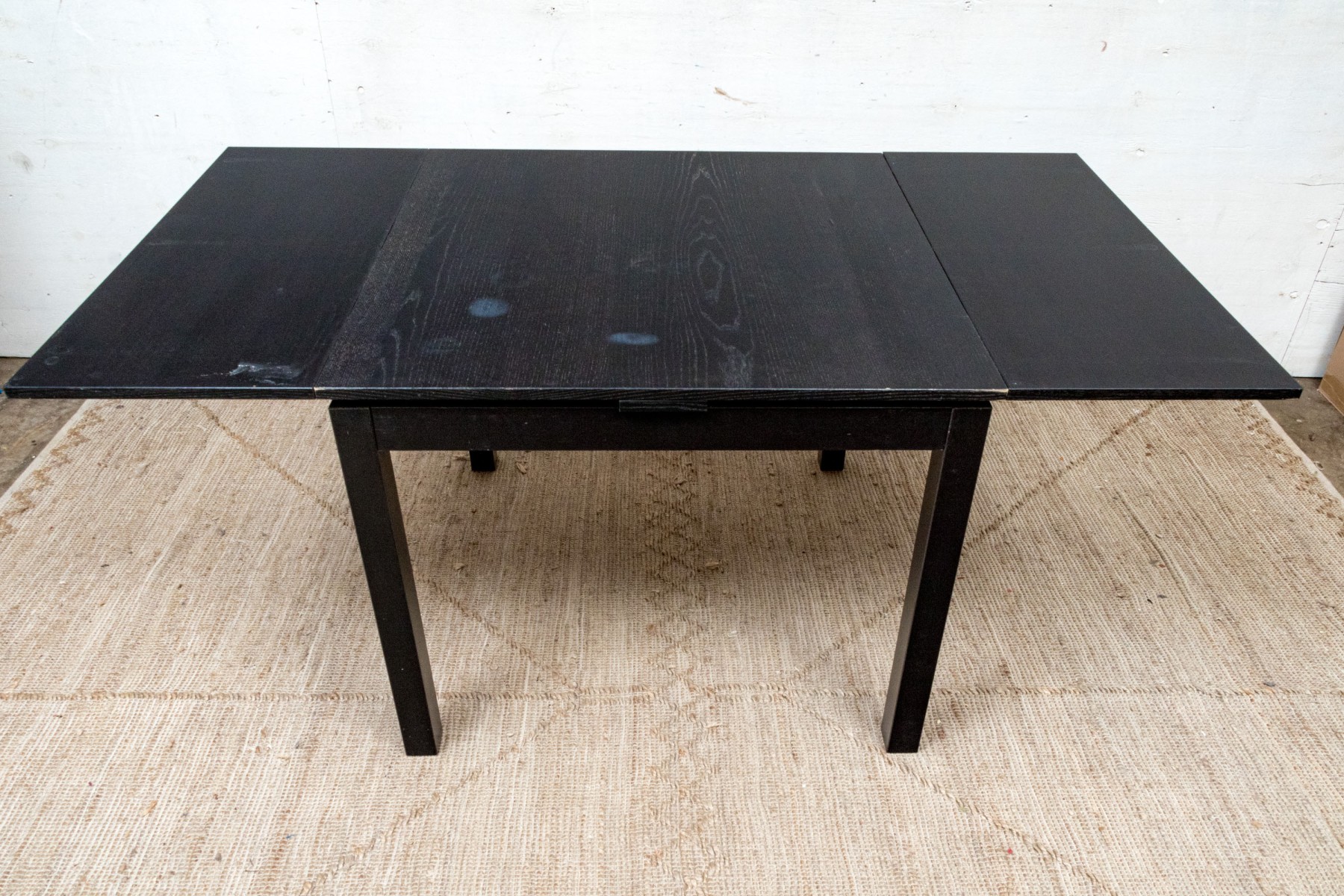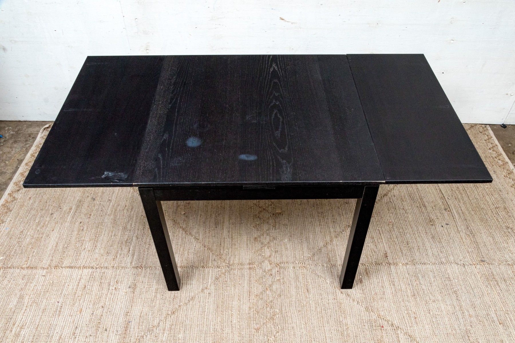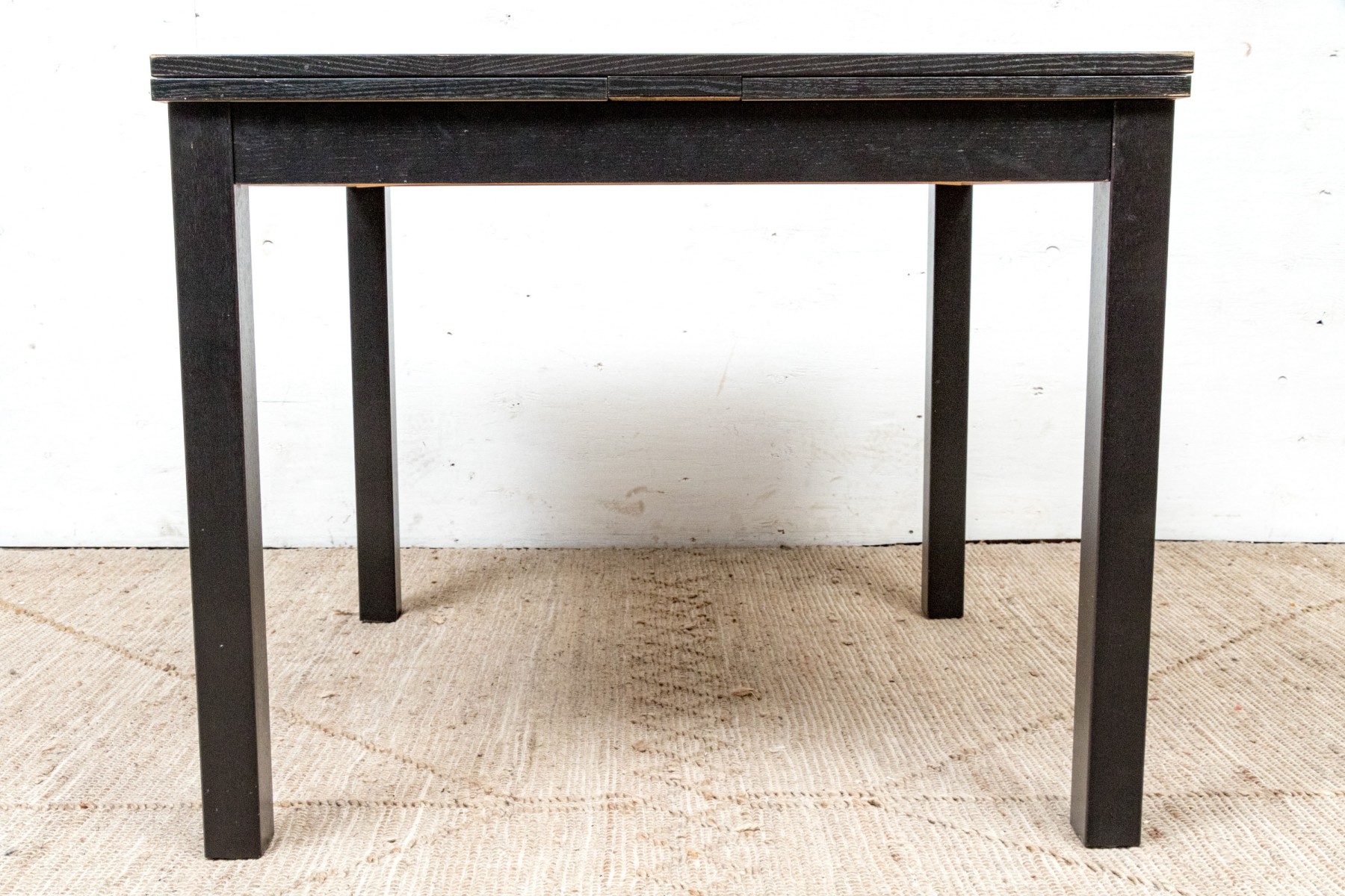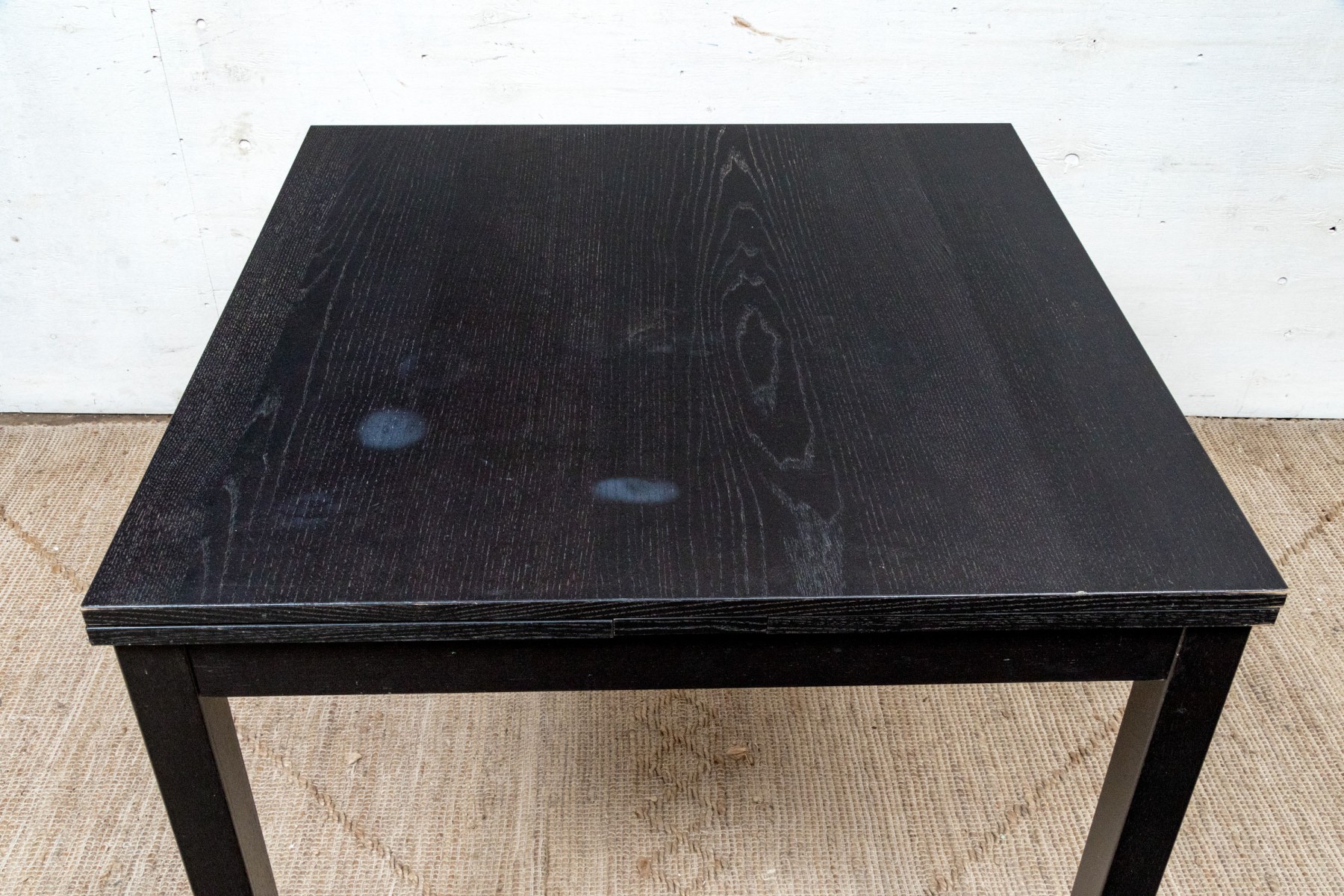 The square form table is raised on four squared legs. The whole is ebonized and presents handsomely for use in a variety capacities.