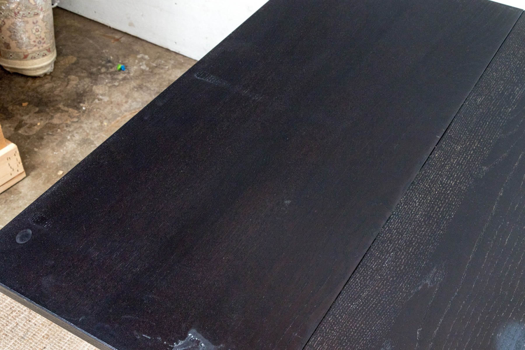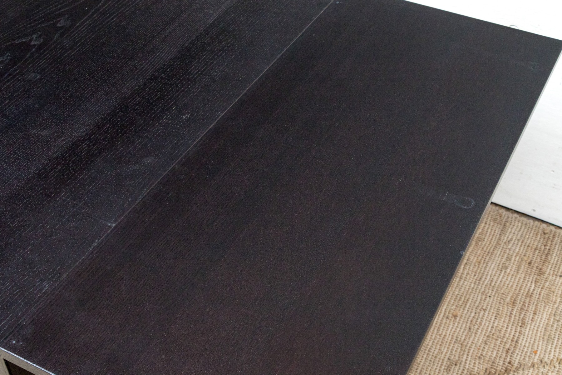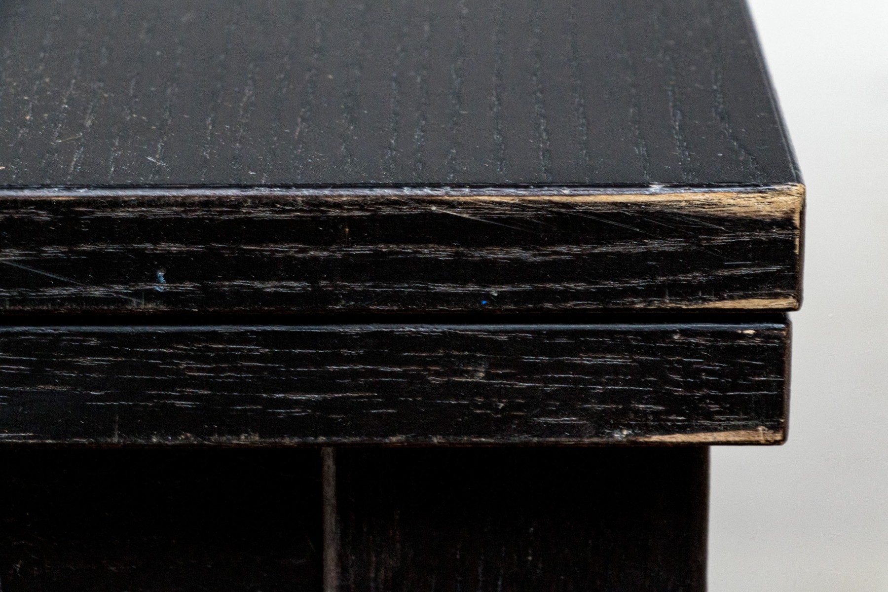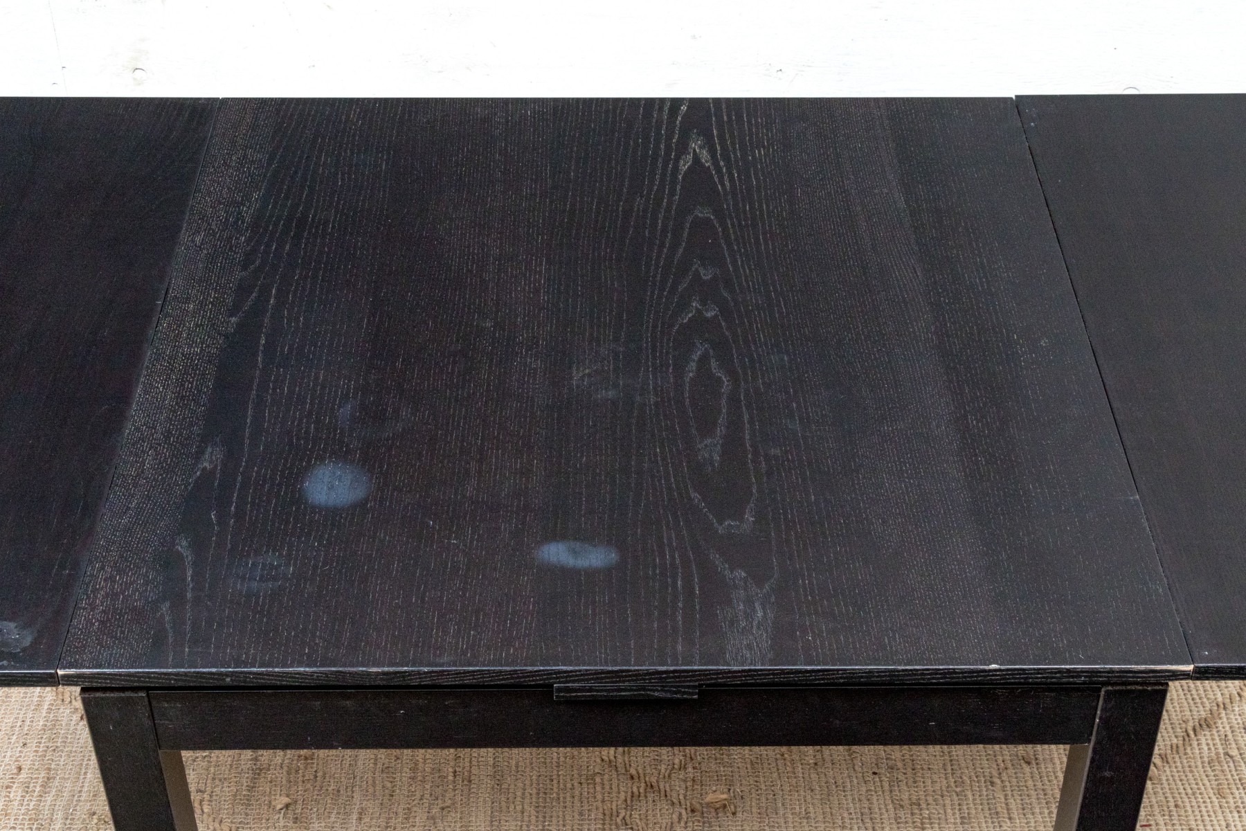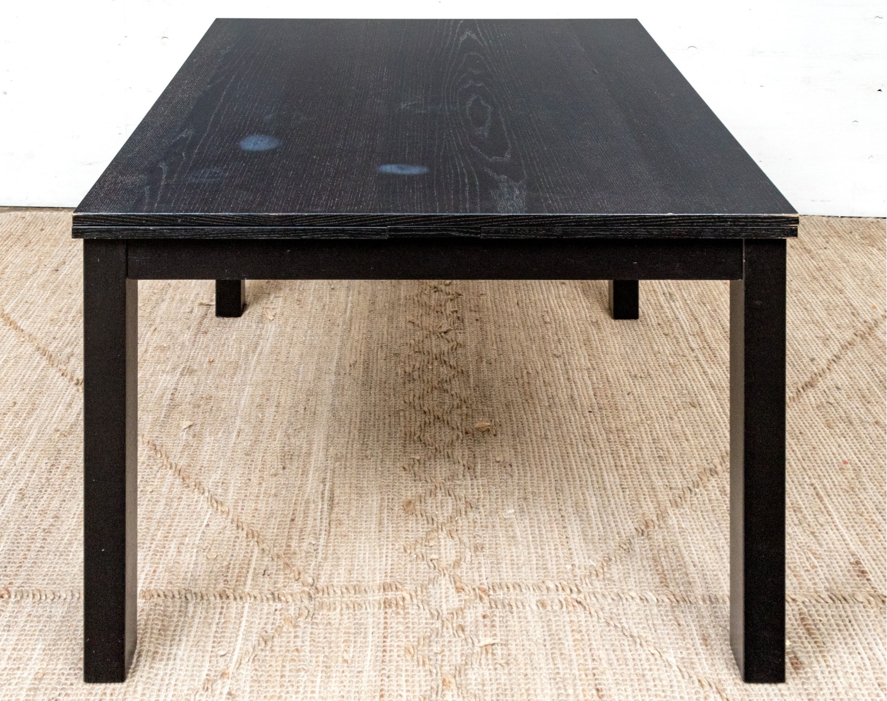 The square form table is raised on four squared legs. The whole is ebonized and presents handsomely for use in a variety capacities.