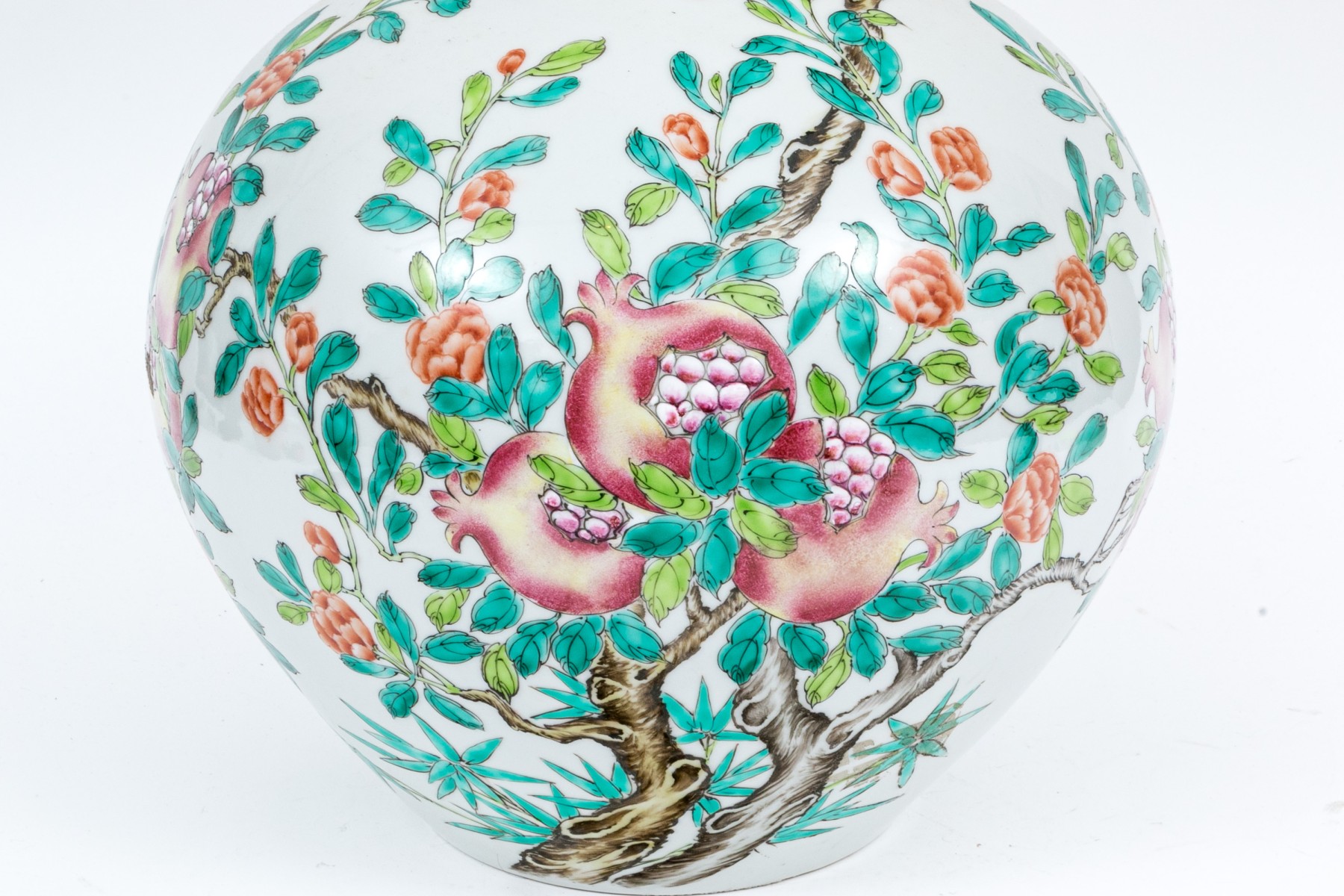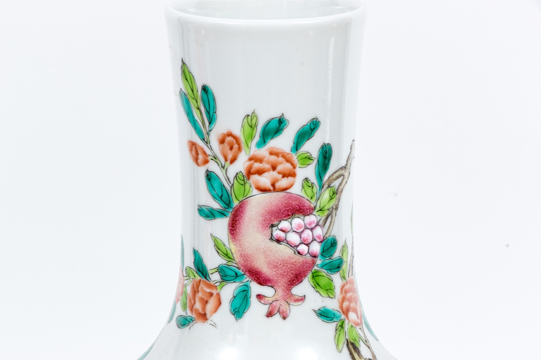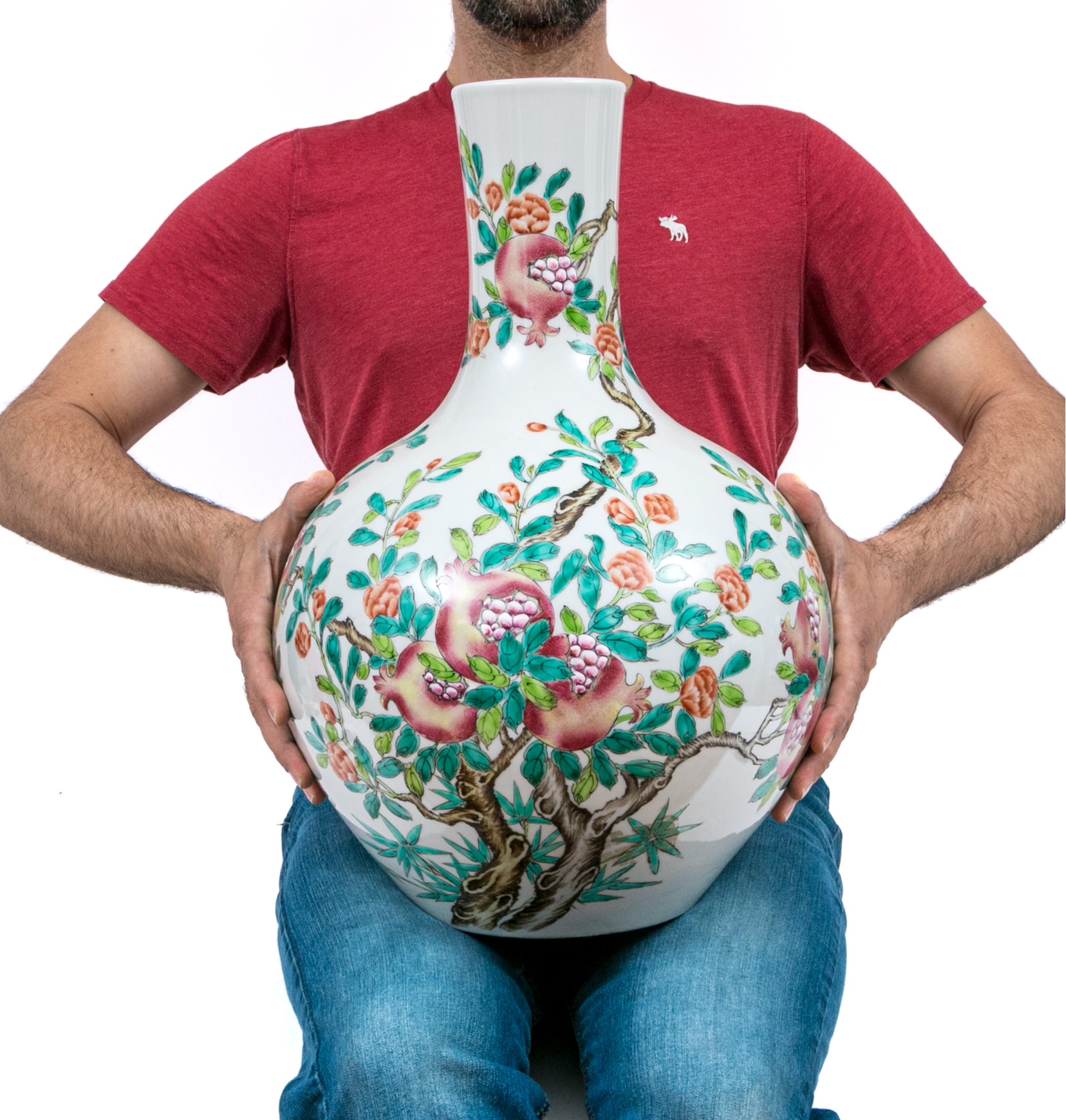 Impactful large pomegranate motif tianqiuping vase, green and rose tones on a white field, decorators piece
