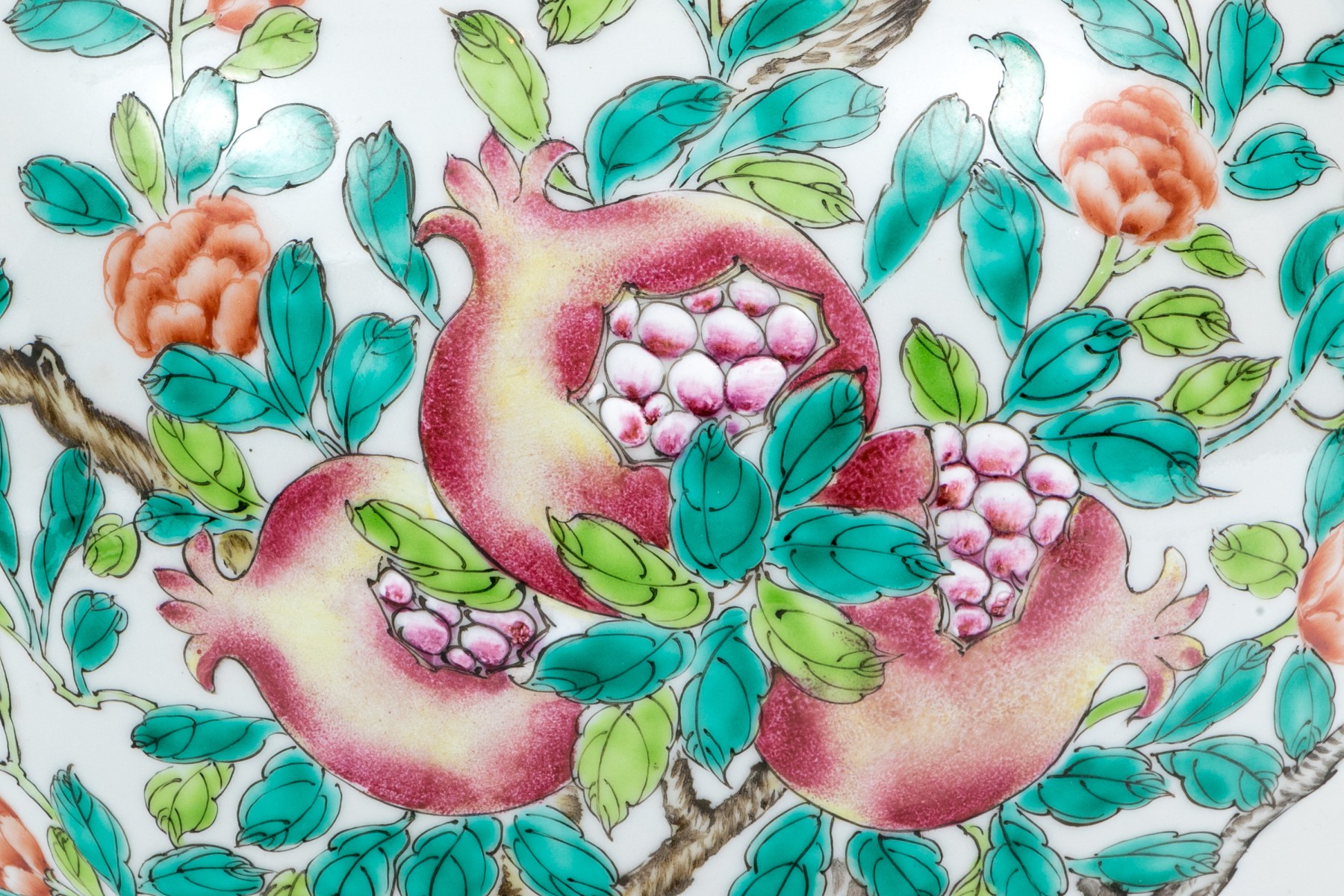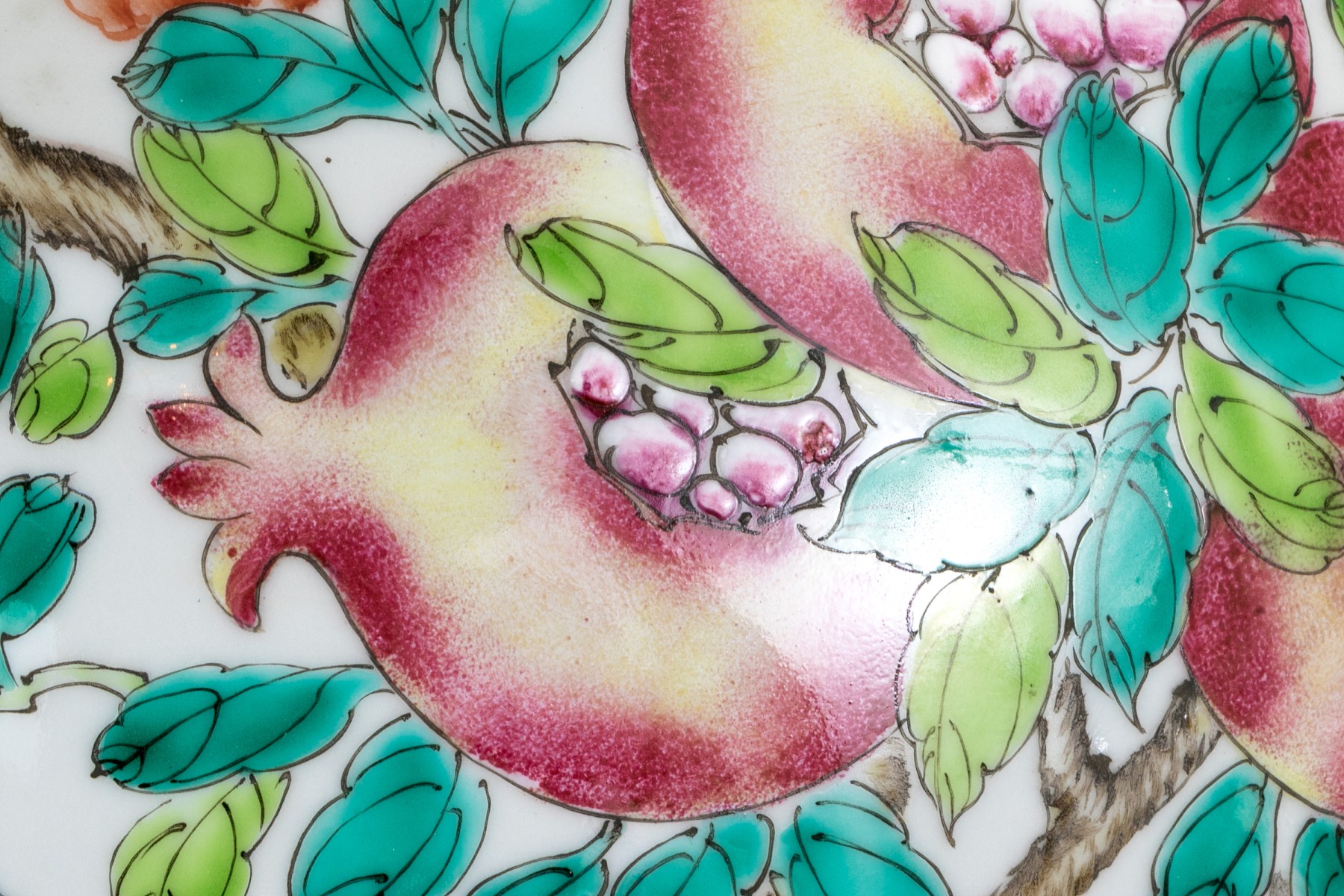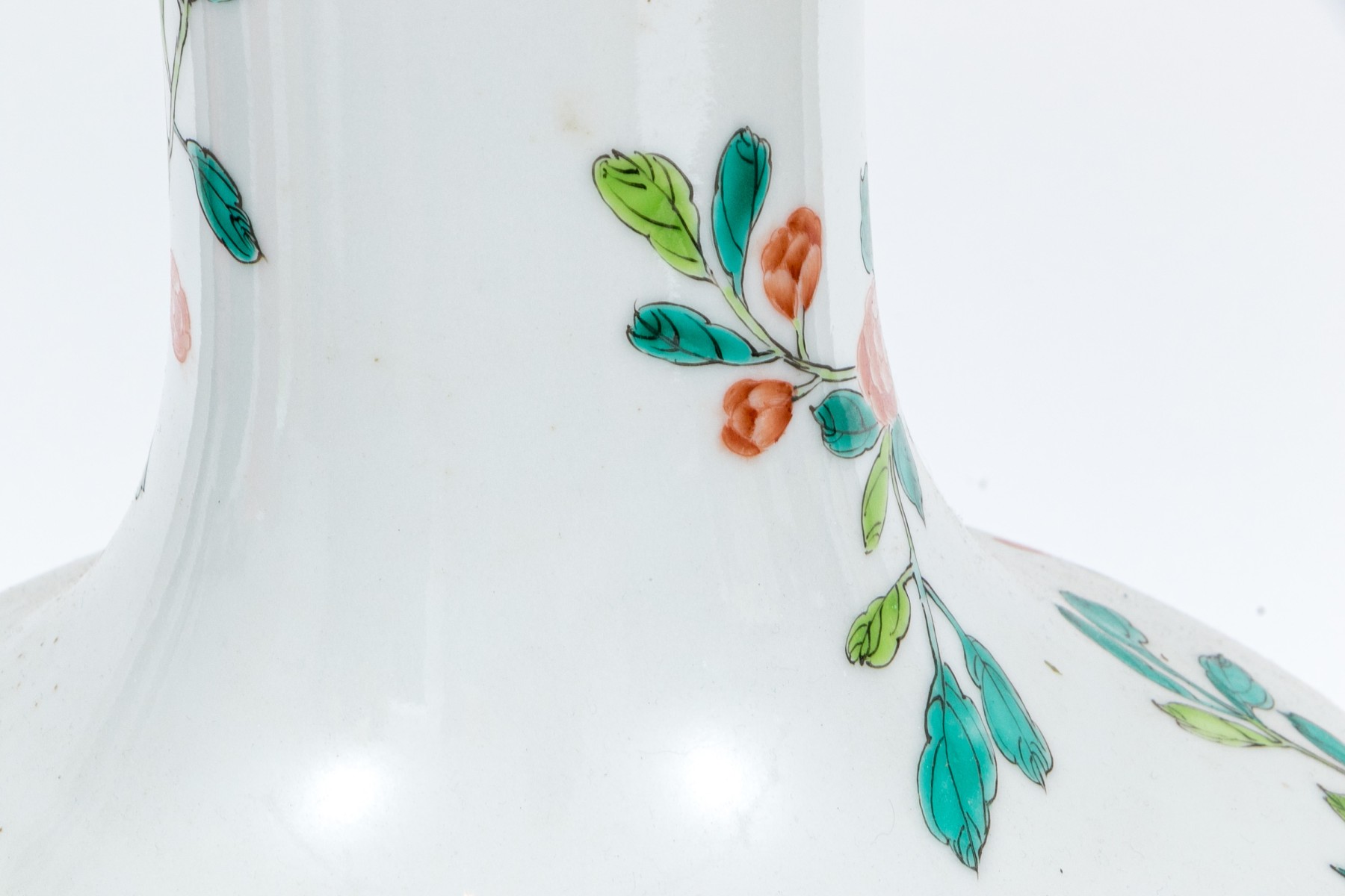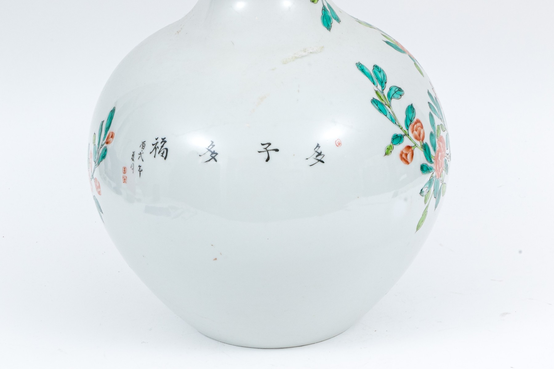 Impactful large pomegranate motif tianqiuping vase, green and rose tones on a white field, decorators piece